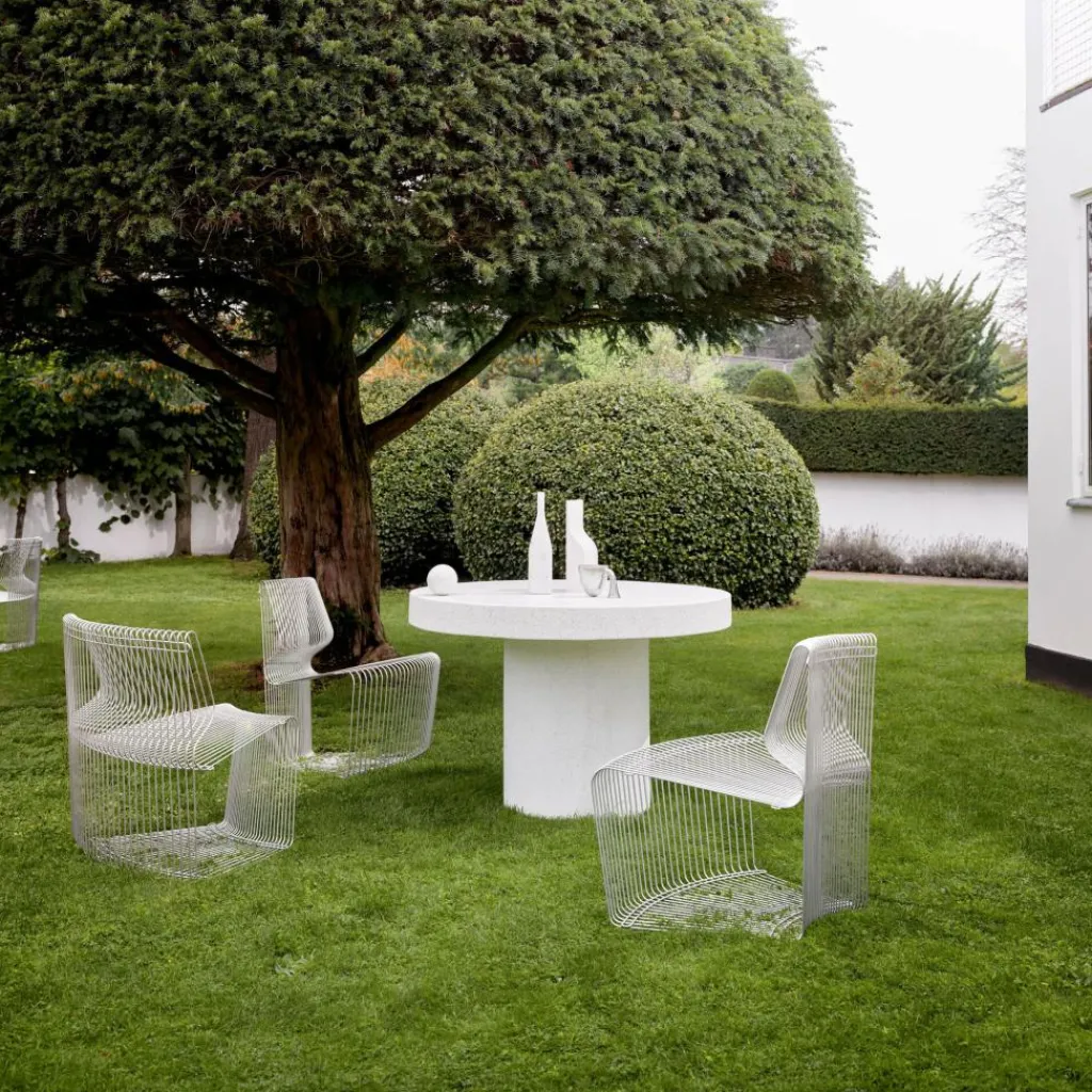 Der Pantonova Convex Garten Loungesessel kann einzelstehend verwendet oder mit anderen Modulen kombiniert werden. Somit ist es möglich mit mehreren Modellen des Gartenmöbels einen Halbkreis, eine Welle oder eine S-Form zu gestalten. Der Pantonova Convex Garten Loungesessel ist eine Erweiterung des beliebten Panton Wire Regalsystems. Genauso wie die Aufbewahrungsmöbel wird der Pantonova Convex Garten Loungesessel aus parallel verlaufenden Drahtstäben gefertigt. Ursprünglich wurde das Modell für das Restaurant Varna im dänischen Arhus entworfen. Für den Pantonova Convex Garten Loungesessel verwendet Panton verchromten Stahl. Passend zum Pantonova Convex Garten Loungesessel sind Sitzkissen erhältlich.