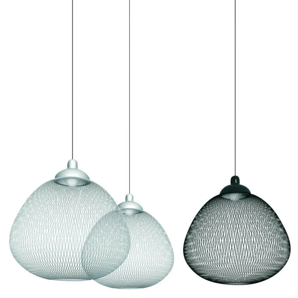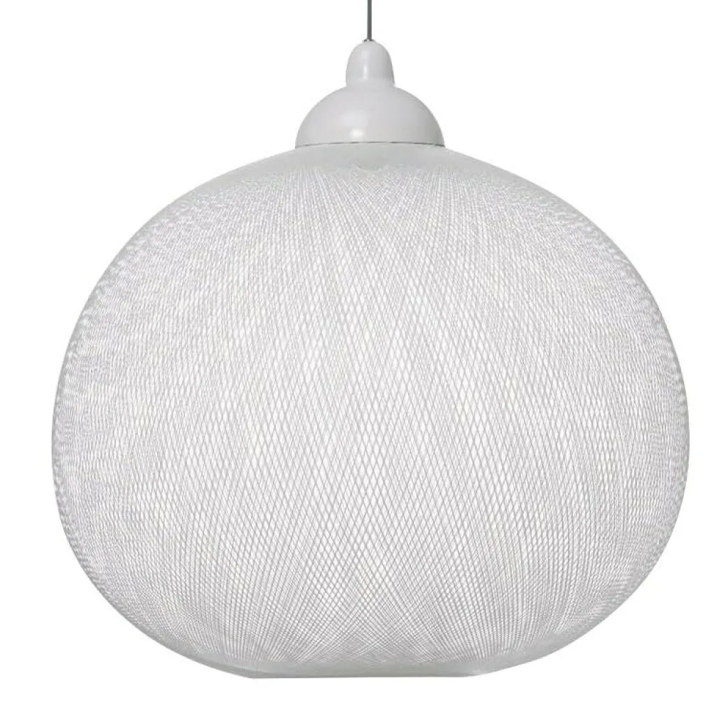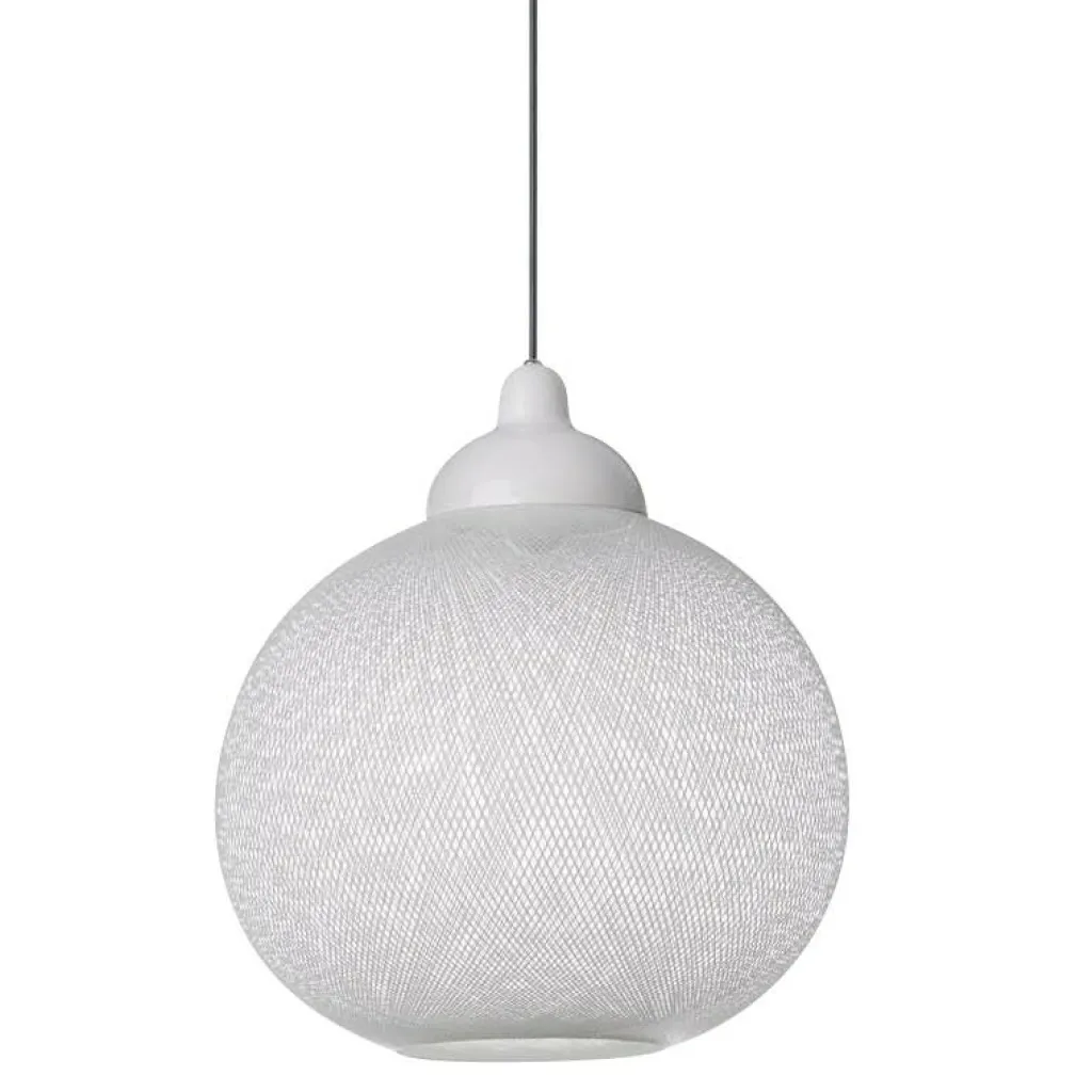 Für viele sieht die Non Random Light Pendelleuchte wie ein Wollknäuel aus, das aus feinen Fäden besteht. Wie der Name schon sagt, ist bei dem Modell nichts dem Zufall überlassen. Ein ausgeklügeltes Verfahren kommt zum Einsatz, um das Kunstwerk zu erschaffen. Fäden aus Fiberglas werden dabei mit einer Kunstharzfaser gemischt. Die Schnüre werden auf einen aufgeblasenen Ball gespannt. Sobald der Kunststoff ausgehärtet ist, wird die Luft abgelassen. Zurück bleibt eine filigrane Pendelleuchte, die alle Blicke auf sich zieht. Der Baldachin und die Halterung für die Fassung bestehen aus lackiertem Edelstahl und Chrom. Durch das engmaschige Netz der Non Random Light Pendelleuchte gelangen Lichtstrahlen blendfrei in den Raum. Das Licht wird in alle Richtungen abgegeben. Für die Non Random Light Pendelleuchte wird ein Leuchtmittel mit E27-Fassung benötigt.