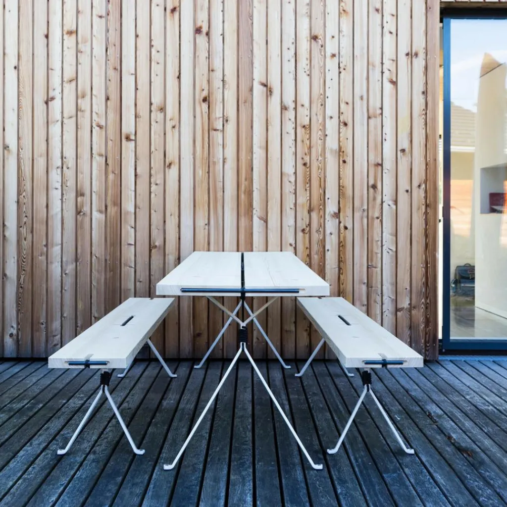 Passend zu dem Tisch, der sowohl im Innen- als auch im Außenbereich eingesetzt werden kann, gibt es in derselben Machart zwei verschiedene Bänke. Die Sitzbank ohne Lehne erinnert an bayerische Biergärten, während die Bank mit Lehne einer klassischen Parkbank nachempfunden ist. Sie können entweder einzeln oder als Set gewählt werden.