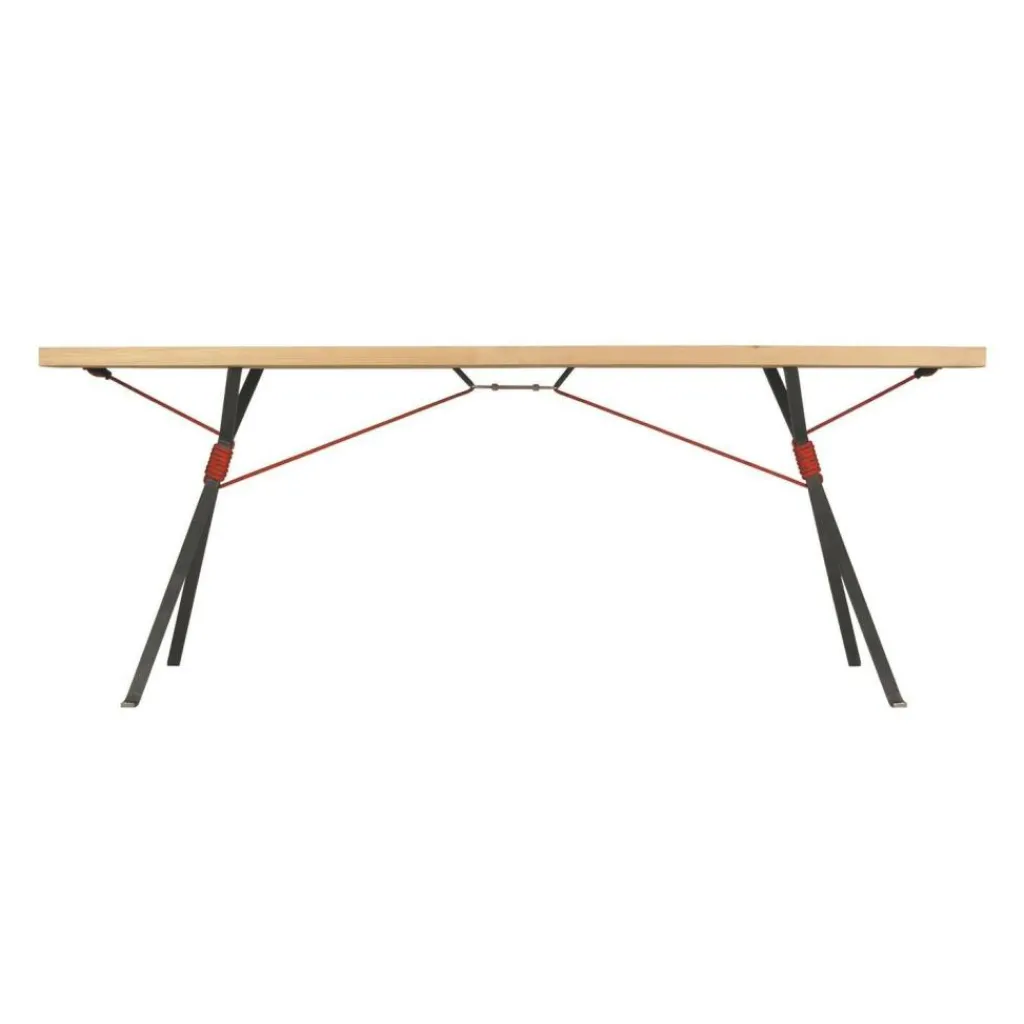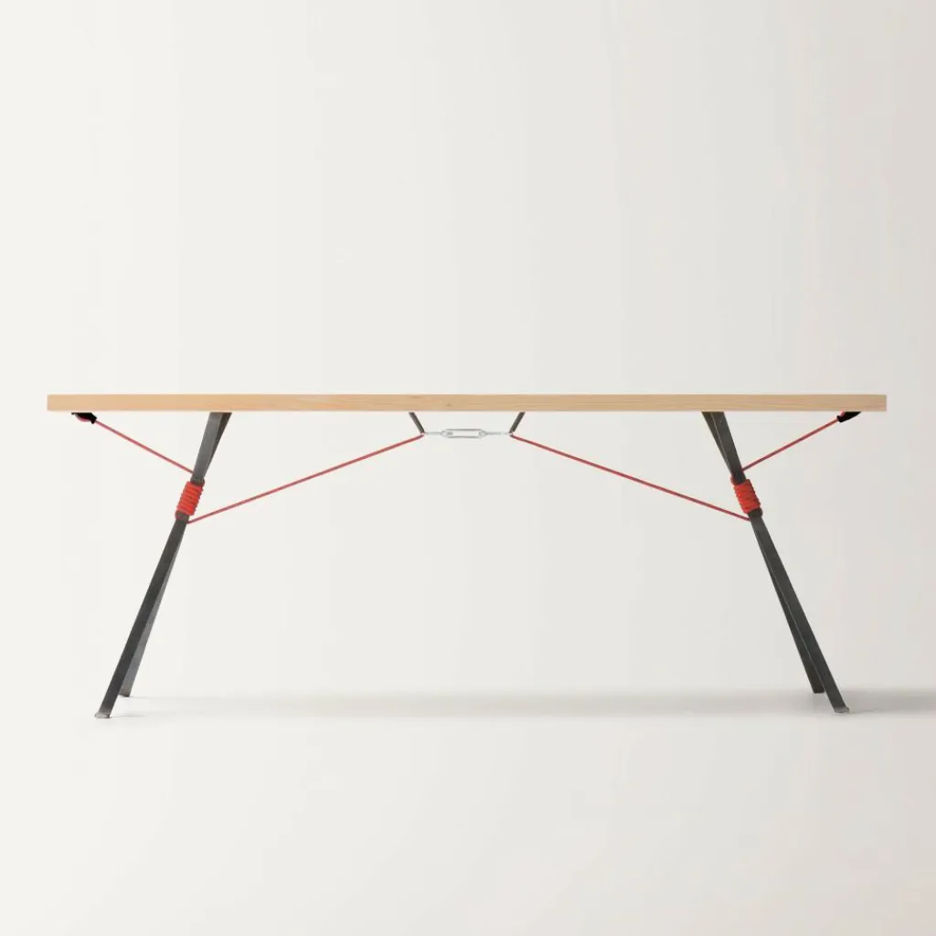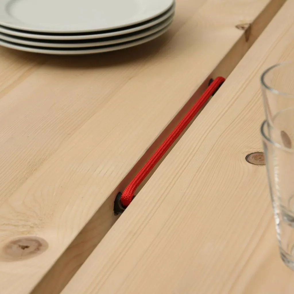 Der Moormann Kampenwand Tisch/Gartentisch 220×68 besticht durch seine interessante Kombination von Material und Farbe. Die 220 x 68 cm große Tischplatte besteht aus Tannenholz. Sie ist auf einem Gestell aus Stahl befestigt, das es sowohl in verzinkter als auch in gewachster Ausführung gibt. Die nötige Standfestigkeit erhält der Tisch durch ein ausgeklügeltes rotes Seil-System, dessen Farbe durch einen schmalen Spalt in der Mitte der Tischplatte leicht durchscheint, was einen interessanten Farbkontrast zu dem hellen Tannenholz ergibt.