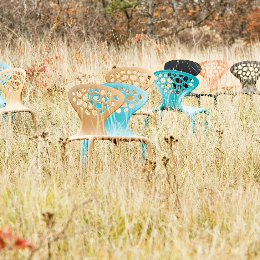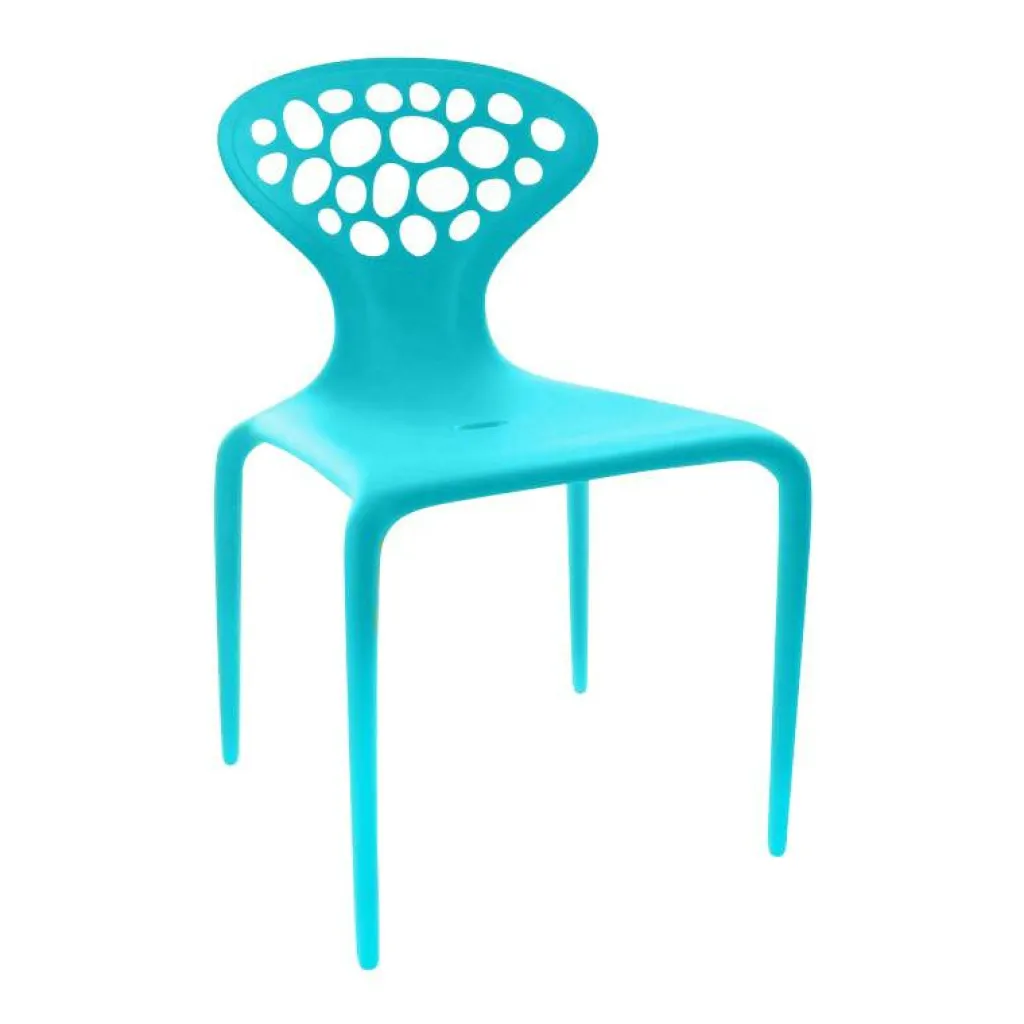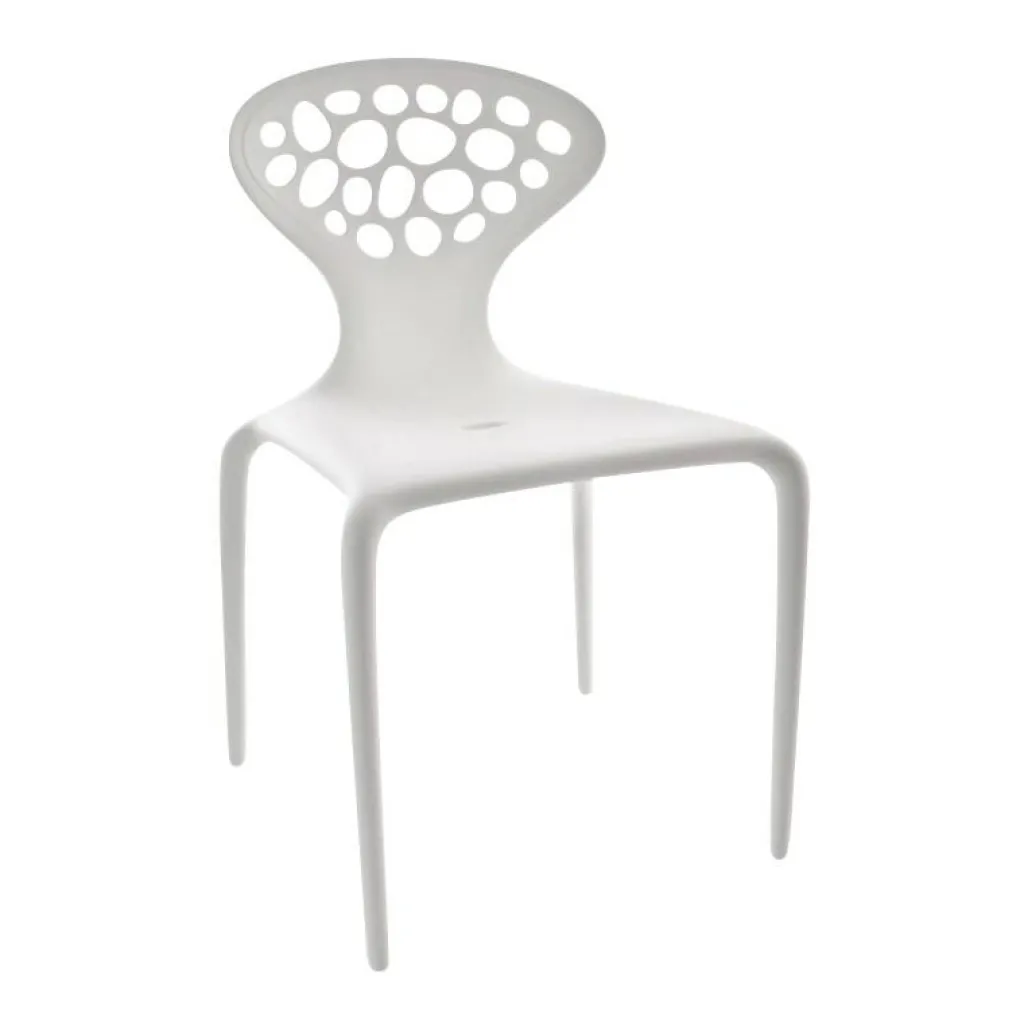 Der Supernatural Stuhl mit Löchern wurde von Ross Lovegrove für den Hersteller Moroso Outdoor entworfen. Bei diesem Modell bediente sich das italienische Möbelhaus erstmals einer mit Glasfaser verstärkten Spritzgusstechnologie – was das pfiffige Design des außergewöhnlichen Stuhls technisch optimal umsetzt. Der Designer sagt zur Entwicklung seines Prunkstücks Folgendes: „Das Lochmuster verleiht dem Stuhl eine vielschichtige und durchaus witzige Wirkung, wenn Licht durchgeht und Schatten erzeugt, die den Raum bereichern und unerwartete, attraktive Muster auf architektonische Flächen zaubern.“