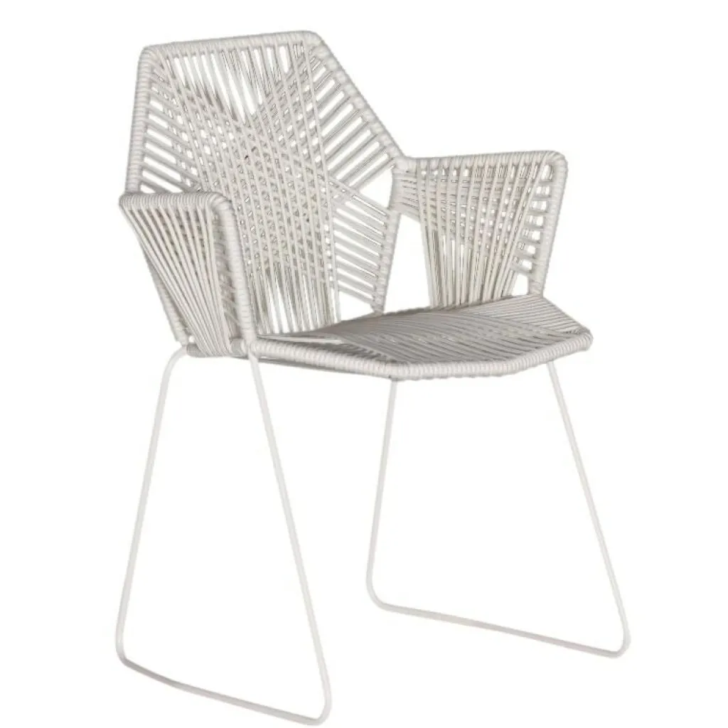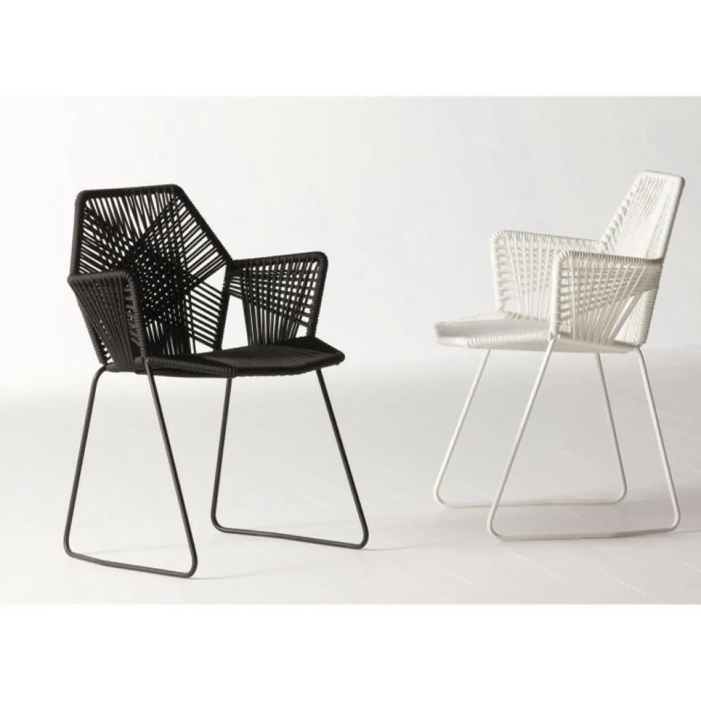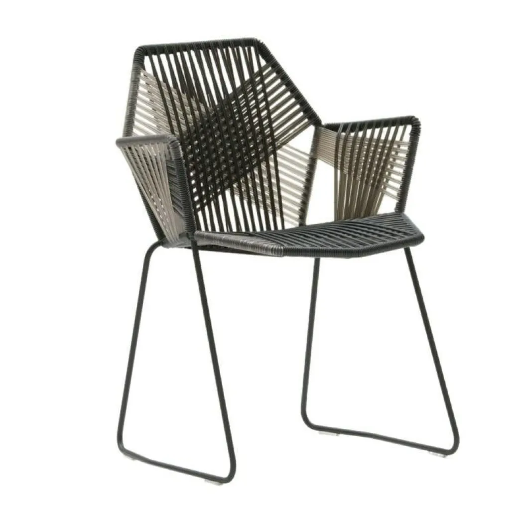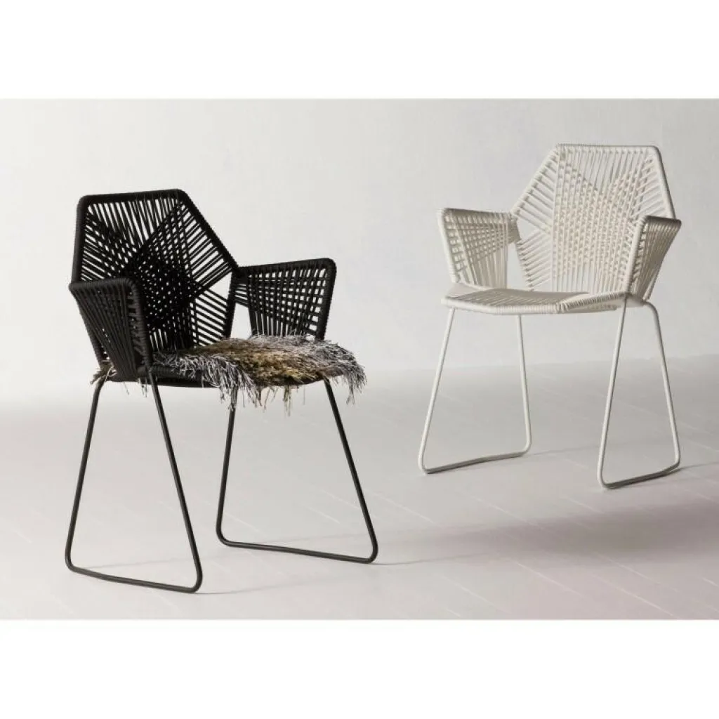 Das Gestell des Stuhls besteht aus stabilem Stahlrohr. Es finden sich keine störenden Ecken und Kanten, denn die Basis bilden facettierte Grundformen, wie sie jeder aus der Geometrie kennt. Gefüllt werden die diversen Flächen mit einem kunstvollen Geflecht aus robusten Fäden. Dafür nutzt Moroso Outdoor einen thermoplastischen, recyclebaren Kunststoff. Sorgfältig doppelt sowie dreifach geflochten, entstehen daraus auffällige Muster. Sie verleihen dem Möbel eine stilvolle Struktur, die greifbar ist und zugleich die Fantasie anregt. Für einen angenehmen Komfort beim Sitzen sorgen die leicht geneigten Lehnen im Bereich des Rückens sowie der Arme.