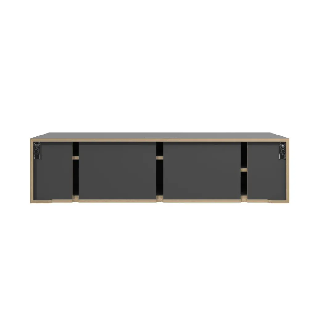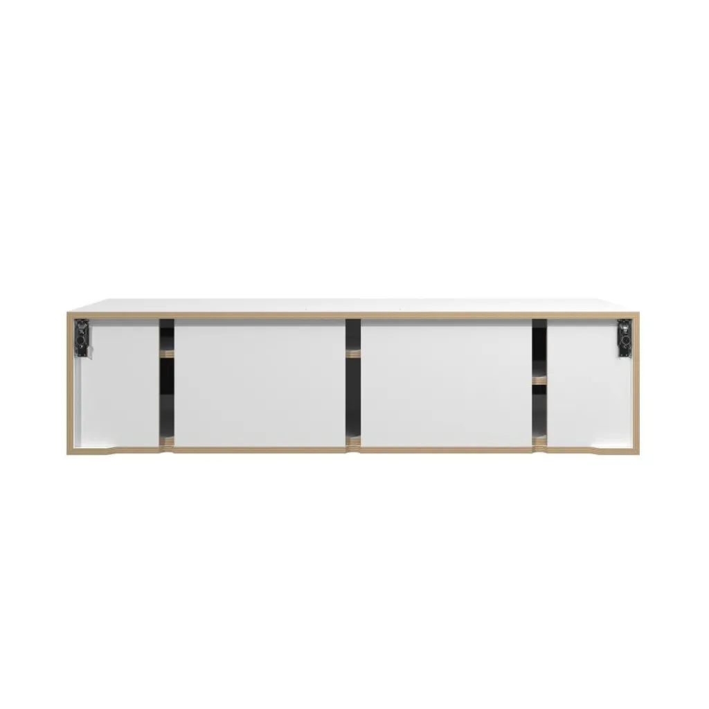Das Vertiko HiFi Sideboard macht jeden Raum zum Heimkino. Man kann es direkt auf den Boden stellen oder an der Wand montieren. Kabelöffnungen an der Rückseite und an der Oberseite lassen die elektrischen Zuleitungen des Fernsehers verschwinden. Es gibt das Modell in verschiedenen Farben. Der Korpus wird aus Birkenschichtholz hergestellt. Es ist 1,8 cm dick. Da die Einzelteile auf Gehrung verleimt werden, steht das Vertiko HiFi Sideboard sicher. Vorne hat das Sideboard eine Klappe. Ihre Front ist mit einem elastischen Akustikstoff bespannt. Man kann die Rückseite des Vertiko HiFi Sideboards auch abmontieren, ohne dass es seine Stabilität verliert. Mithilfe einer praktischen Push-to-open-Technik wird die Klappe bedient. So kommt das Modell ohne Griffe aus.