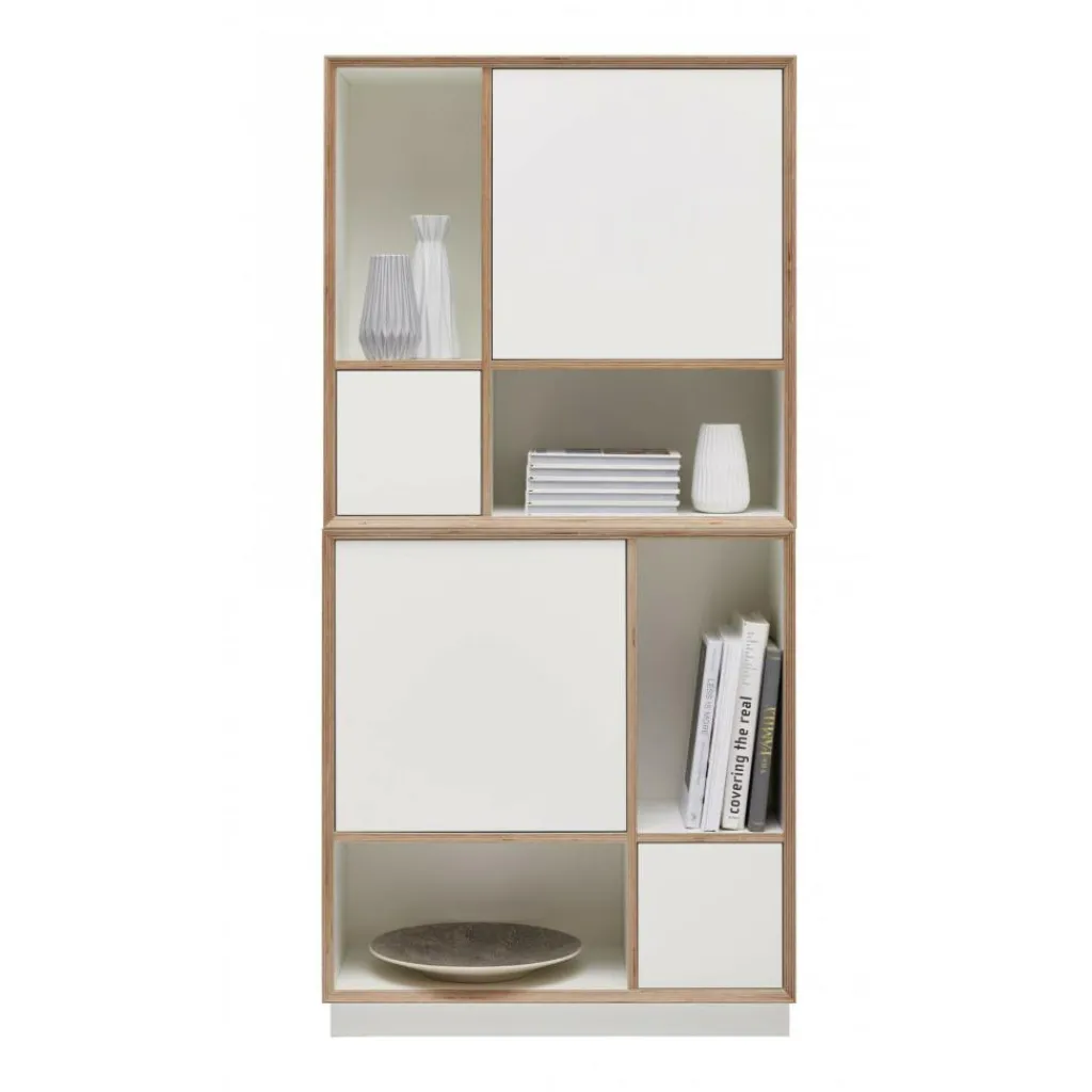Das Design des Vertiko Ply Four Regals ist simpel: Ein einfacher Kasten wird in vier unterschiedliche Fächer geteilt. Zwei quadratische Fächer verschiedener Größe werden hinter je einer Push-to-open-Tür verschlossen, während die beiden rechteckigen Regalfächer in unterschiedlicher Ausrichtung offenbleiben. Die Regalböden und Wände bestehen aus Birkenschichtholz, das den Kanten der Regalböden und -wände natürliche Kontraste schenkt. Gleichzeitig zeigen die mit einer CPL-Schicht versehenen Plattenseiten eine homogene Oberfläche. Das Vertiko Ply Four Regal ist ein dekoratives Einzelstück und lässt sich zusammen mit weiteren Modulen zur Gestaltung kahler Wände nutzen. Als Aufbewahrungsmöbel eignet es sich fürs Wohnzimmer, Büro oder einen Verkaufsraum. Mit Bedacht auf kurze Transportwege hergestellt, besticht das Vertiko Ply Four Regal als nachhaltige Wahl.