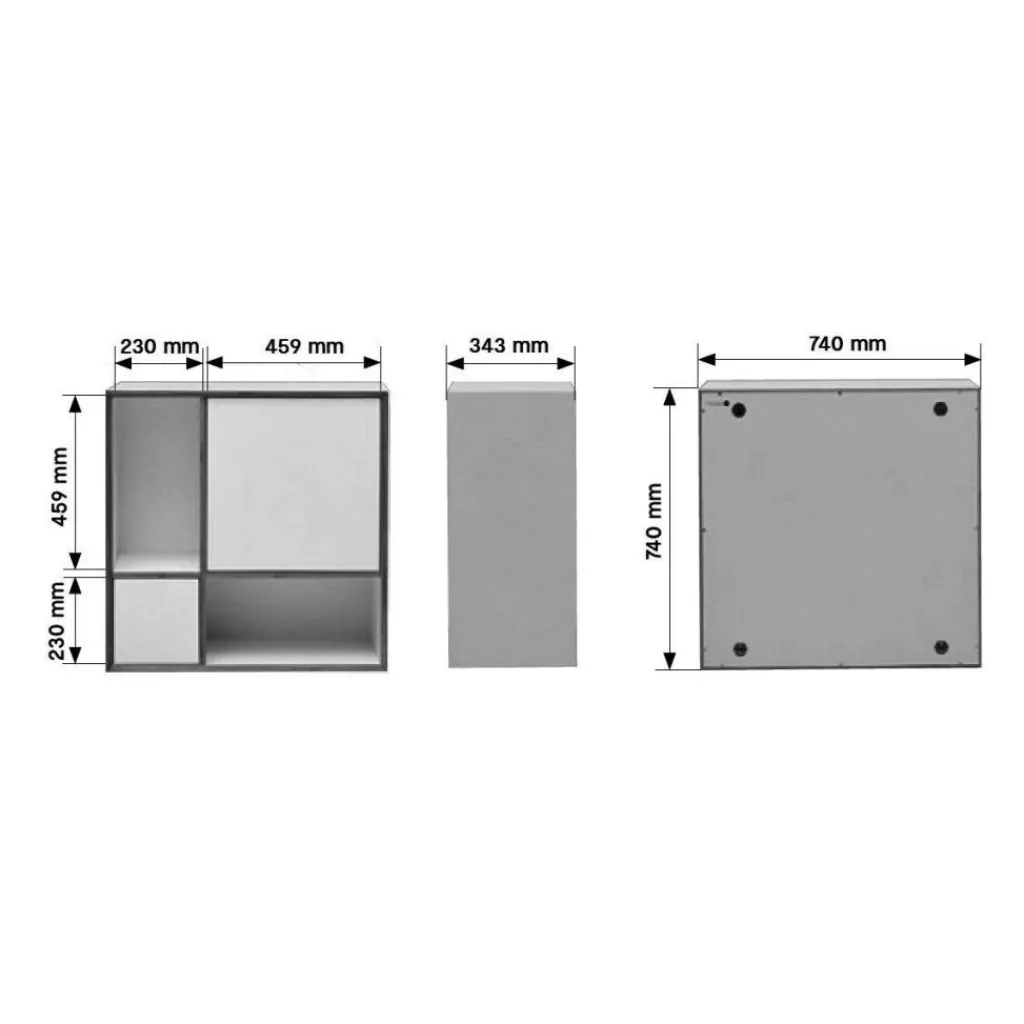 Das Vertiko Ply Four Regal hat eine quadratische Form mit einer Seitenlänge von 74cm. Die Regaltiefe misst 34,3cm. Das Gewicht ist 28kg. Es stehen verschiedenfarbige Ausführungen zur Auswahl. Zur Wandmontage sind zwei Befestigungsbeschläge erforderlich. Zusammen mit einem separat erhältlichen Sockel kann das Regal auch auf dem Boden stehen oder gestapelt werden.