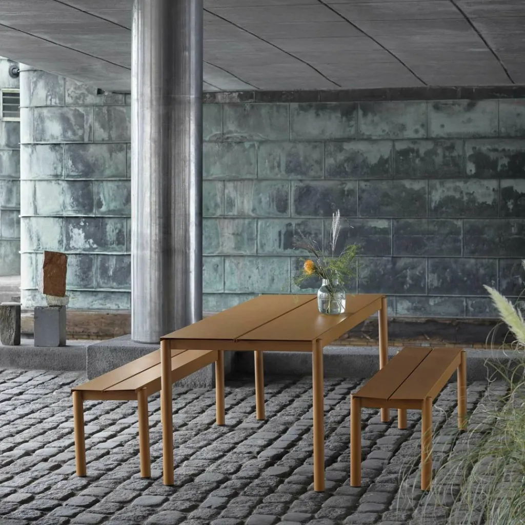 Bewusst entschied sich Bentzen bei der Linear-Steel-Serie für pulverbeschichteten Stahl. Das Material überzeugt mit langer Haltbarkeit und hält außerdem selbst widrigen Witterungsverhältnissen Stand. Weder UV-Strahlen noch Hitze und Regen können dem Linear Steel Gartenset L 200cm etwas anhaben. Das Design des Sets spielt elegant mit geometrischen Formen: Die runden Füße sind sowohl beim Tisch als auch bei der Bank an der Außenseite montiert. Die Sitz- und Ablageflächen weisen Spalten auf, durch die Regenwasser abfließen kann. Sie sind außerdem an beiden Seiten über das Gestell verlängert, was das Set unverwechselbar macht.