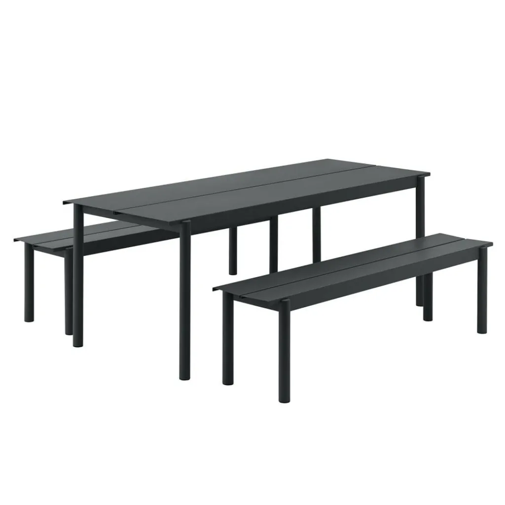 Die beiden Bänke, die beim Linear Steel Gartenset L 200cm mitgeliefert werden, sind 179 cm lang, 39 cm breit und 45,5 cm hoch. Dazu passt der Tisch mit einer Länge von 200 cm perfekt. Er ist 80 cm breit und 73,5 cm hoch. Somit eignet sich das Linear Steel Gartenset L 200cm auch für eine größere Tafel und ein kleines Familienfest.