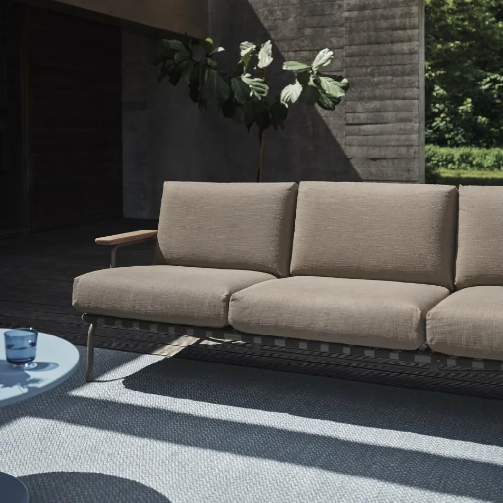 Der Ply Outdoor Teppich 140x85cm wurde von Margrethe Odgaard für die Marke Muuto entworfen. Ply ist das englische Wort für Garnsträhnen, die in dem Modell in gebrochener Köperbindung zu einem zeitlosen Design verarbeitet wurden.