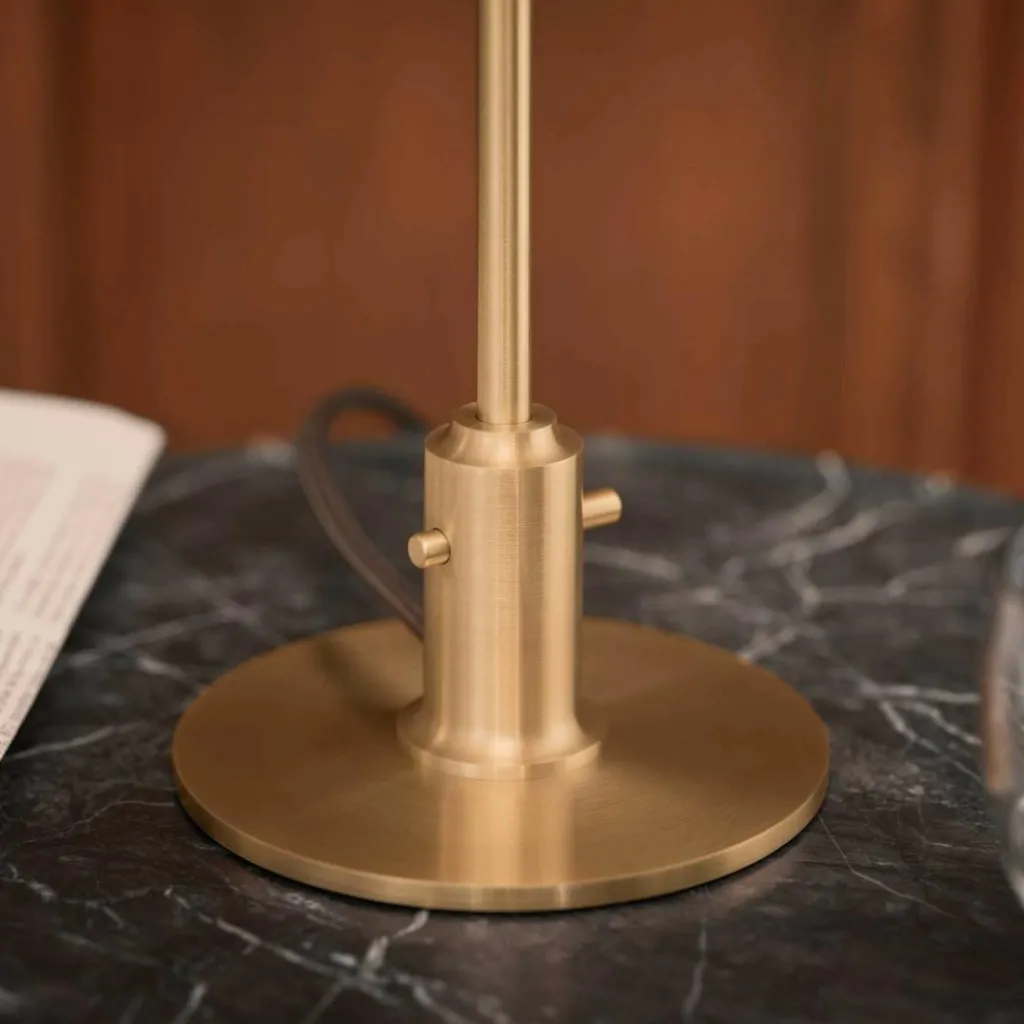 Gleich drei mundgeblasene Lampenschirme aus Opalglas formen den pilzförmigen Lampenkopf – mit viel Witz und Stilsicherheit. Der obere Schirm ist zudem von der Innenseite sandgestrahlt, wodurch ein Matteffekt das heraustretende Licht abdämpft und diffus in den Raum leitet. Viel Liebe investierten die Hersteller auch beim Leuchtengestell. Für Fuß, Abschlussplatte und Lampenstab wird Messing verwendet, das auf Hochglanz verchromt wird. Die edle Komposition reflektiert einzelne Lichtnuancen und spielt förmlich mit ihnen.