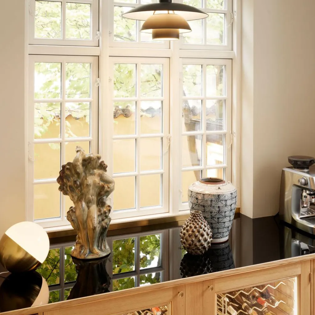Wie ein Ball liegt die VL Studio 250 Tisch-/Bodenleuchte da. Nur eine kleine Abflachung verhindert, dass die Designleuchte, die sich aus zwei gleich großen, aber unterschiedlich ausgeführten Halbkugeln zusammensetzt, davonrollt. Eine Seite besteht je nach gewählter Ausführung aus lackiertem Aluminium oder Messing. Die andere ist aus mundgeblasenem Opalglas gefertigt und gibt ein sanftes Licht ab. So macht sich die VL Studio 250 Tisch-/Bodenleuchte gut in einer Ecke auf dem Wohnzimmerboden, passt aber genauso mitten auf den Esstisch. Auch in einer Designbar oder der Lobby eines Hotels erzeugt die VL Studio 250 Tisch-/Bodenleuchte eine angenehme Lichtstimmung.