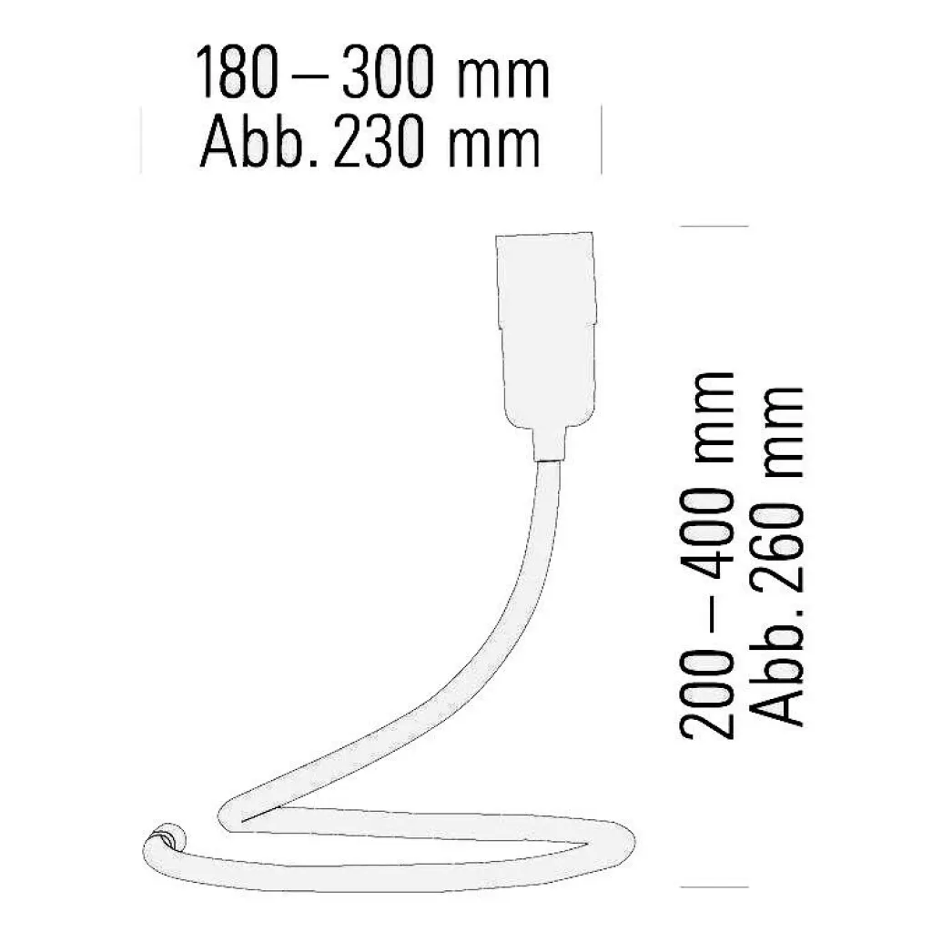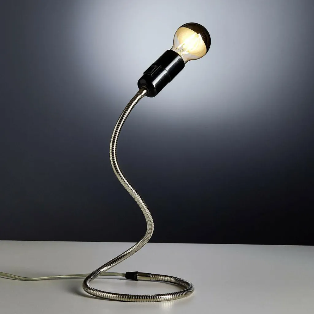 Die Lightworm Tischleuchte ist funktional und stilvoll zugleich: Das Untergestell aus Metall besteht aus unzähligen feinen Gliedern. Sie sind wie ein Duschschlauch beweglich und so kann die Lightworm Tischleuchte nach Belieben verstellt werden. Das macht sie zum Blickfang in jedem Raum: Dabei ist bei der Gestaltung der Kreativität keine Grenze gesetzt. Am unteren Ende des Gestells ist ein transparentes Kabel befestigt. An der Oberseite befindet sich eine Fassung aus Kunststoff, die als Halterung für das Leuchtmittel dient. Da die Lightworm Tischleuchte ohne Leuchtenschirm auskommt, wird das im Lieferumfang enthaltene Leuchtmittel mit einer E27-Fassung perfekt in Szene gesetzt.