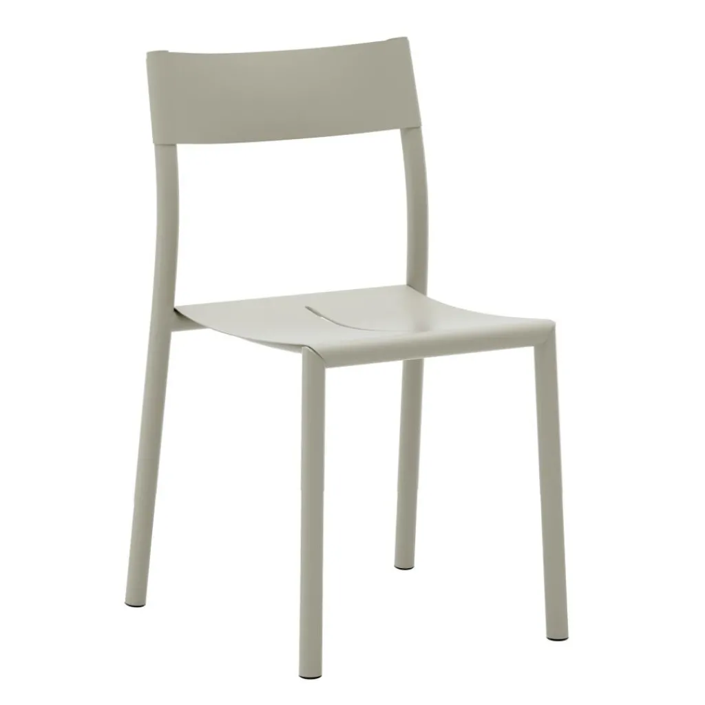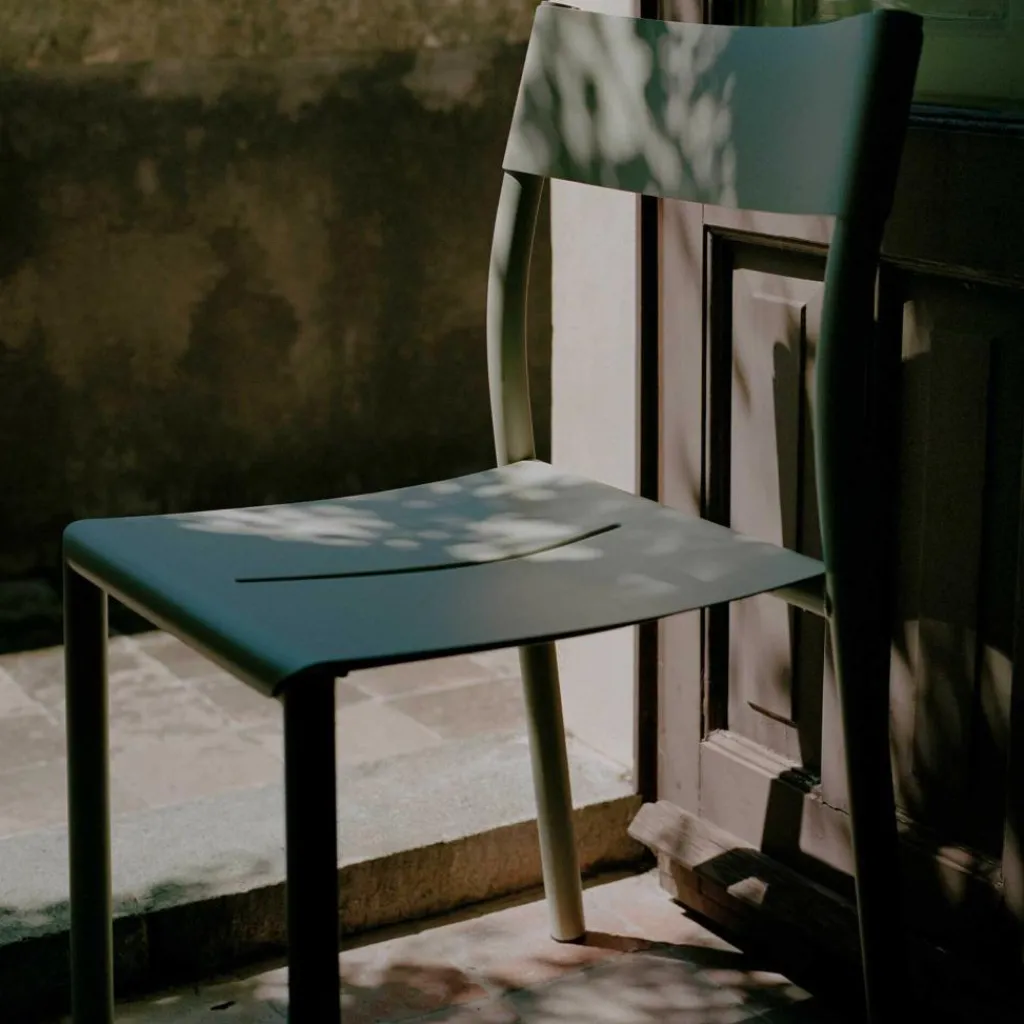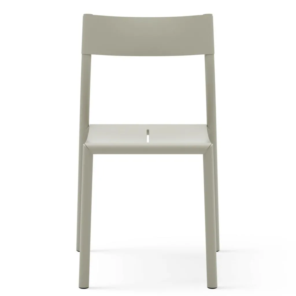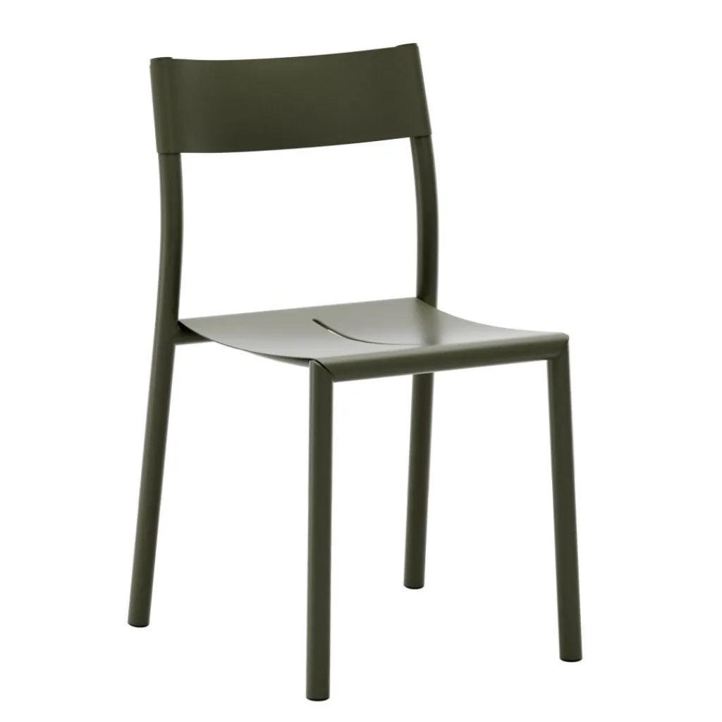 Ein schlichtes Gestell mit vier leicht ausgestellten Beinen aus Stahlrohr trägt die Sitzfläche aus leicht gebogenem Blech. Es geht im hinteren Bereich direkt in die Rückenlehne über. Für einen bequemen Sitzkomfort ist die schmale Rückenlehne ebenfalls leicht gebogen. Ein schmaler Schlitz bildet mittig auf der Sitzfläche ein interessantes Detail und dient gleichzeitig als praktischer Regenablauf. Der Stuhl ist komplett aus Stahl mit pulverbeschichteter Oberfläche gearbeitet. Verschiedene Farben stehen zur Auswahl. Er misst 48cm in der Breite, 81cm in der Höhe und 50cm in der Tiefe. Die Sitzhöhe beträgt 45cm. Der Stuhl lässt sich mit seinen leichten 6kg variabel arrangieren. Bei Nichtgebrauch sind die Stühle platzsparend stapelbar. Mindestens sechs Stühle können aufeinandergestapelt werden.