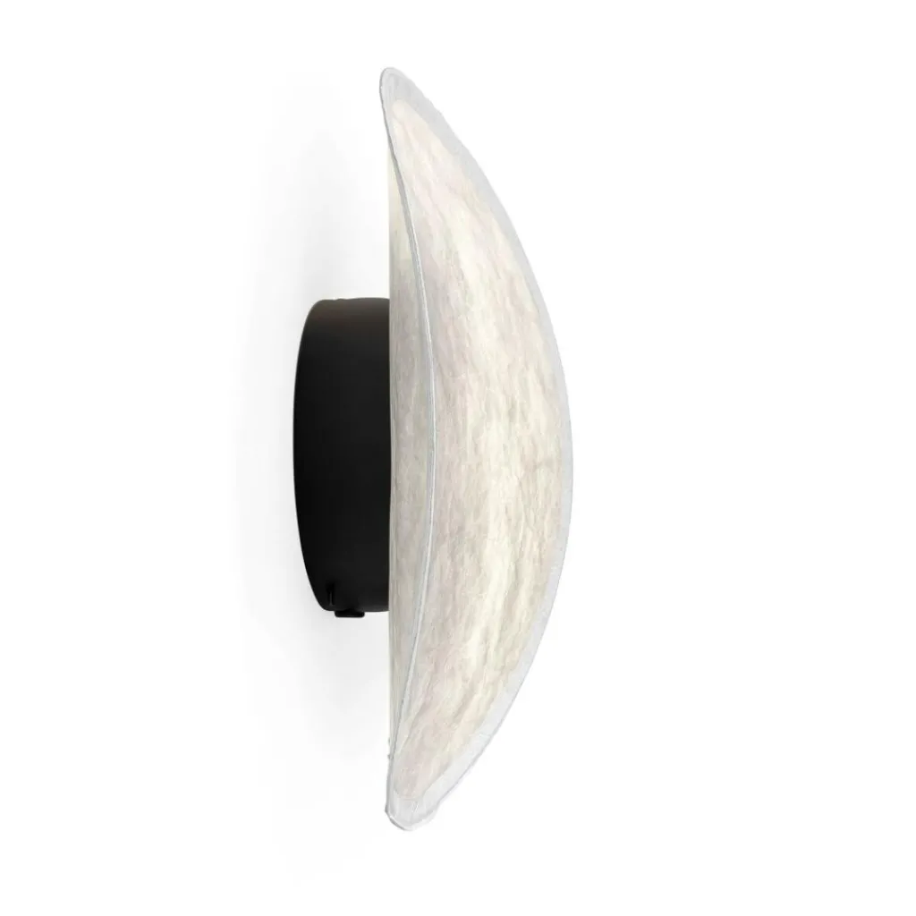 Die Tense LED Wandleuchte wurde von Panter & Tourron für die Marke New Works entworfen. Sie gehört zu einer Kollektion von Leuchten, die mit ihrem skulpturalen Charakter auffallen. Das Schweizer Designerduo schafft damit moderne Leuchtobjekte, die mit ihren luftigen, fließenden Schirmen an Wolken oder den Mond denken lassen.