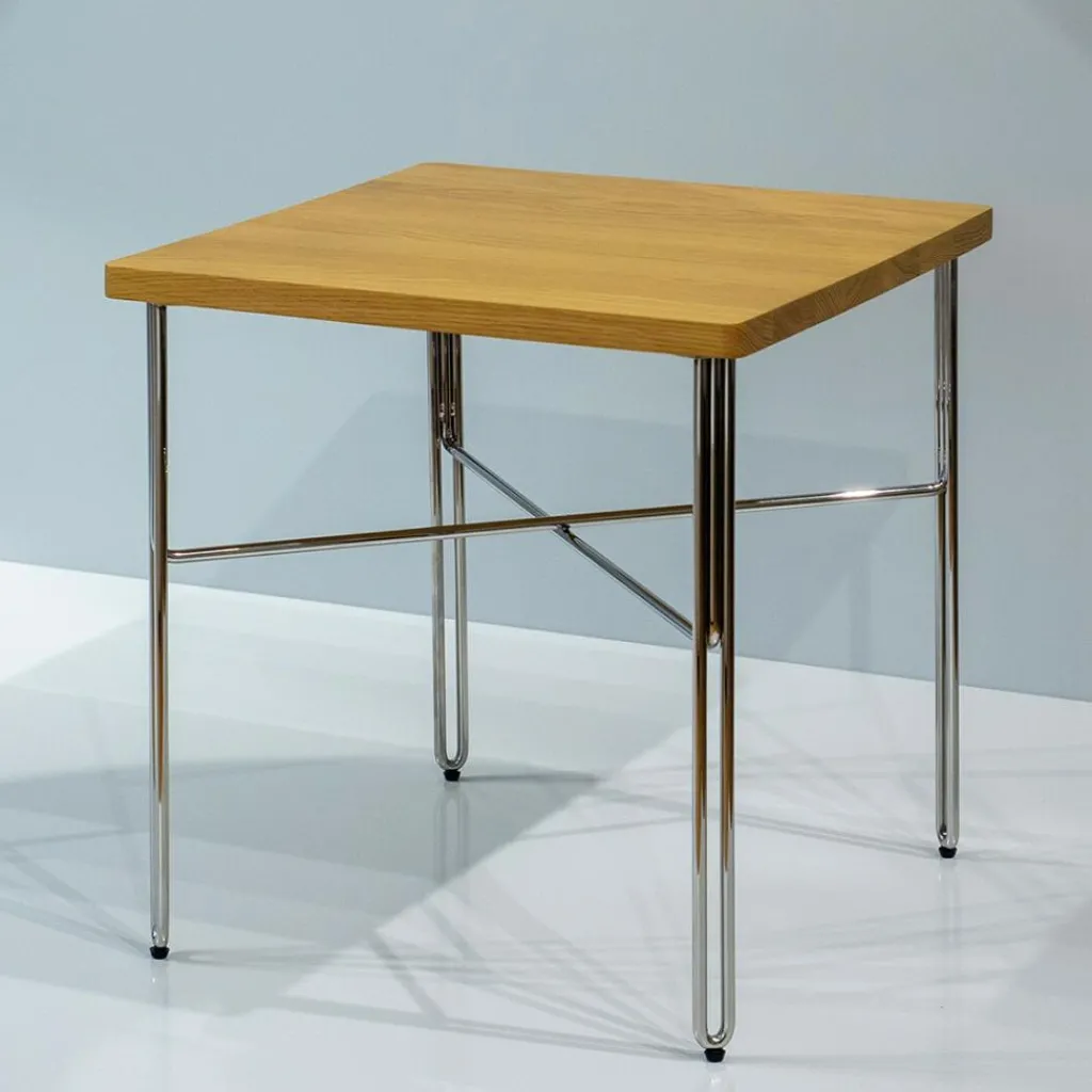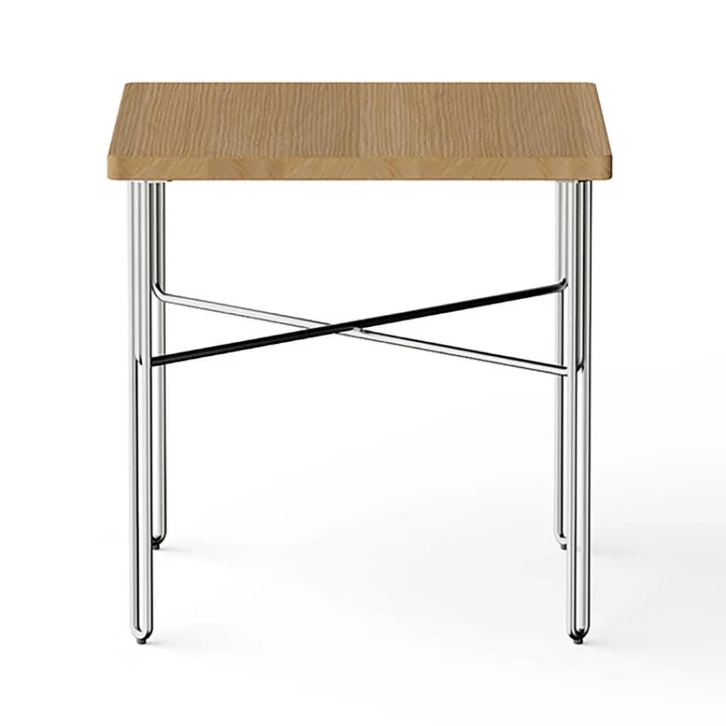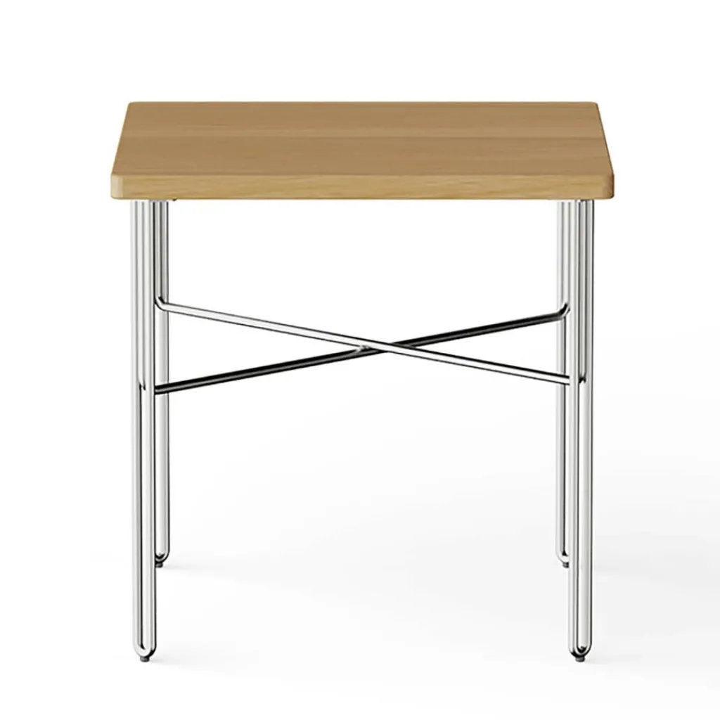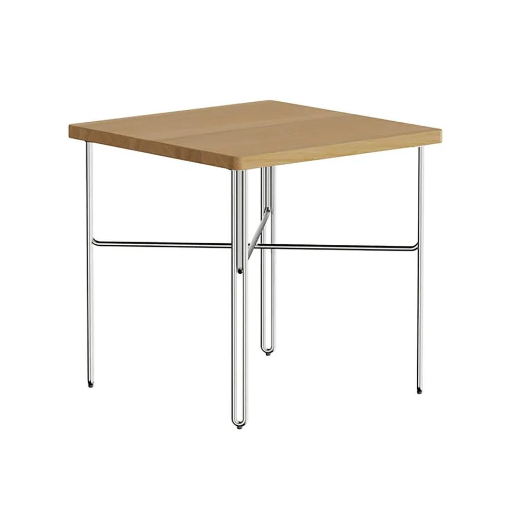 Mit seinen kompakten Abmessungen fügt sich der Inline Beistelltisch platzsparend in jedes Interieur ein. Er macht sich gut vor der Couch oder neben einem Lesesessel im Wohnzimmer und kann auch als Nachttisch im Schlafzimmer verwendet werden. Zudem lässt sich der formschöne Designtisch mit weiteren Inline-Modellen kombinieren und passt so in den Warteraum einer Praxis oder in die Lobby eines Designhotels. Die helle Eichenholzplatte mit ihren leicht abgerundeten Ecken und der zarten Maserung schenkt dem Möbelstück einen freundlichen Charakter. Sie ist klar lackiert und besticht durch eine sanfte Haptik. Gleichzeitig schafft die raffiniert gebogene Konstruktion aus polierten Edelstahlstangen nicht nur einen attraktiven Blickfang. Die zu Stangenpaaren gefalteten Elemente der Tischbeine und die u-förmig gebogenen Diagonalstreben garantieren auch eine hohe Stabilität und Belastbarkeit.