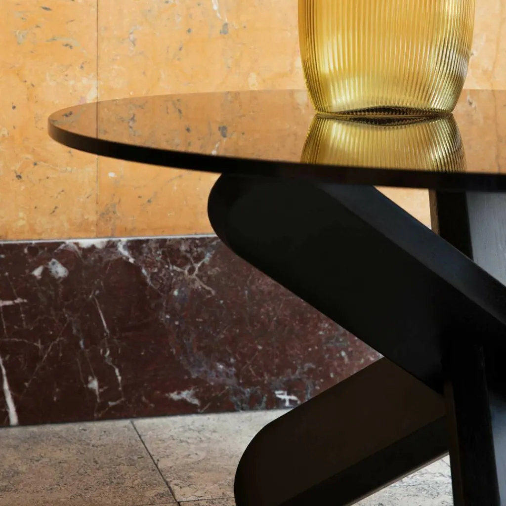 Das Möbelstück besteht aus zwei Teilen. Die Tischplatte vom Ding Beistelltisch besteht aus klarem Glas, während der zusammengesteckte Standfuß in Sternform aus Eichenholz gefertigt ist. Zusammen ergeben sie ein praktisches Möbelstück. Denn auf einer Höhe von 40 cm finden Sie auf der Glasplatte mit einem Durchmesser von 75 cm viel Platz für Bücher, Tassen, Gläser oder Zeitschriften.