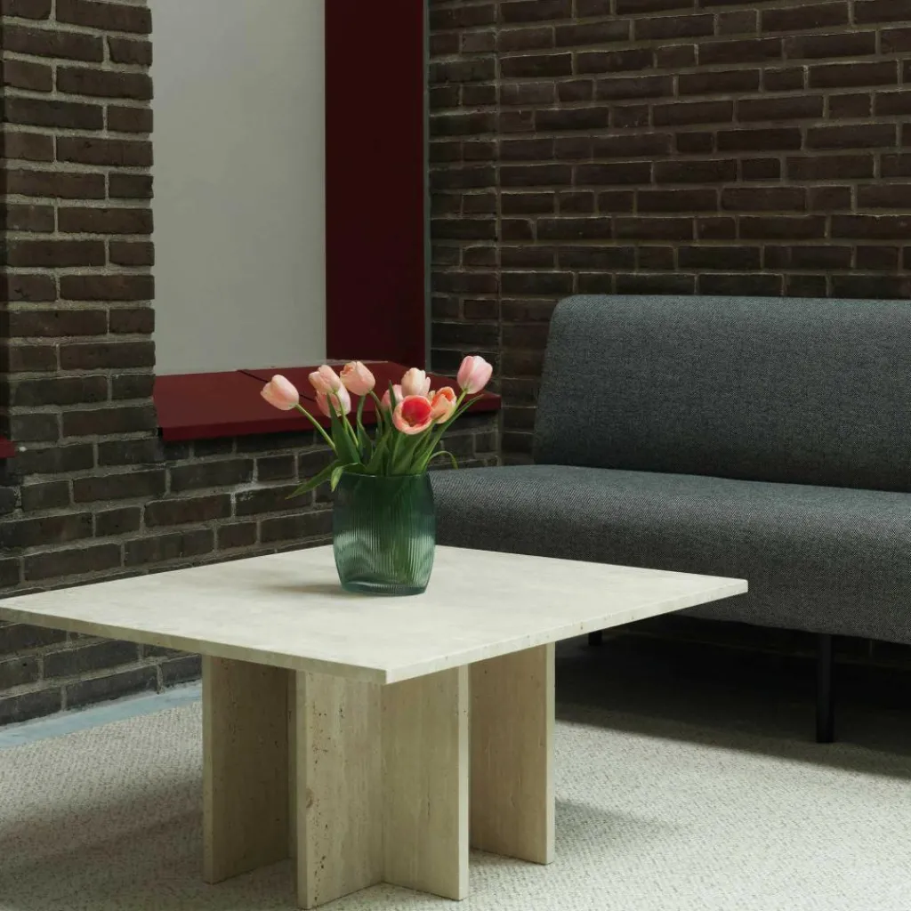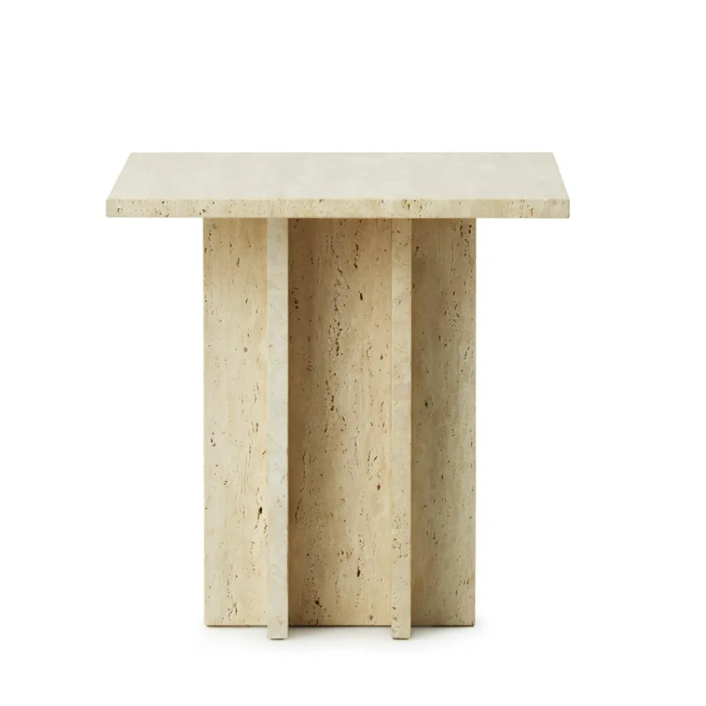 Seine einzigartige Struktur macht den Edge Beistelltisch S zu einem attraktiven Designmöbel, das sich harmonisch in jeden Wohnraum einfügt. Er besteht aus hochwertigem Travertin, der eine natürliche Farbgebung und Schattierung zeigt. Die Konstruktion setzt sich aus mehreren Platten unterschiedlicher Größen zusammen. Sie bilden die horizontale Tischfläche sowie vier vertikale Stützenwände, die gegeneinander verkreuzt aufgestellt sind. Diese Anordnung sorgt nicht nur für einen stabilen Stand. Sie ist je nach Lichteinfall und Betrachtungswinkel auch für einen attraktiven Schattenwurf verantwortlich. Damit schafft der Edge Beistelltisch S einen dynamischen Blickfang im Raum. Er passt in ein modernes sowie in ein klassisches Ambiente und eignet sich für das Vorzimmer im Büro, den Wartebereich einer Praxis, die Lobby eines Designhotels oder eine schicke Lounge sowie für das Wohnzimmer.