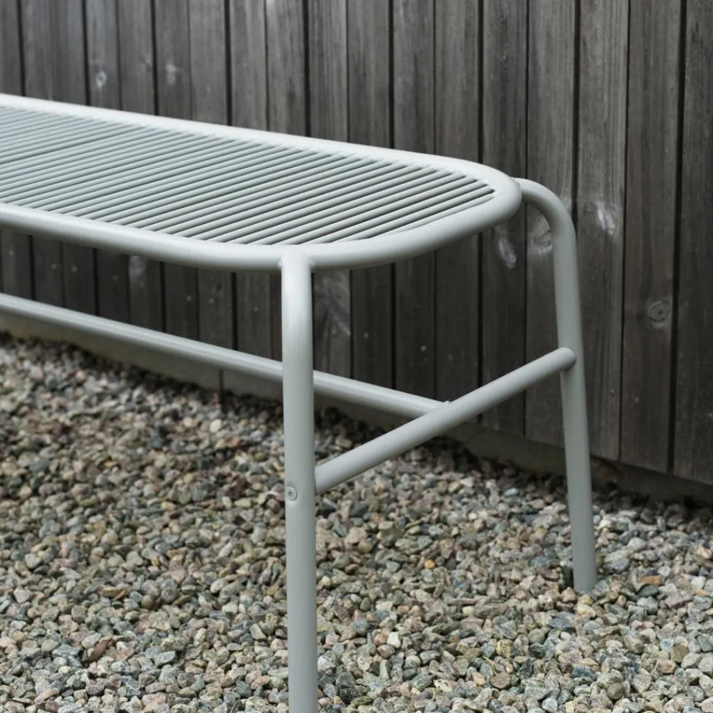 Funktionalität und eine leichte, unaufdringliche Ästhetik bilden die Markenzeichen der Vig Gartenbank. Neben einem filigranen Gestell mit langer Querstrebe zeichnet sich das 2023 in Dänemark designte Modell durch weiche, abgerundete Kanten aus. Sie bilden eine Hommage an die fließenden Formen in der Natur und verdeutlichen zusätzlich, dass die Bank zur Nutzung draußen gedacht ist. Die Sitzfläche besteht aus einem robusten Rahmen, in dem schmale, vertikal angeordnete Streben für Stabilität und eine luftige Optik sorgen. Gefertigt ist die Gartenbank aus doppelt pulverbeschichtetem Stahl. Das Material ist auf Langlebigkeit und einen jahrelangen Gebrauch im Freien ausgelegt, sei es auf dem Balkon, auf der Terrasse oder mitten im Garten. Zur Pflege benötigt das Modell lediglich ein feuchtes Tuch mit Wasser und neutralem Reiniger.
