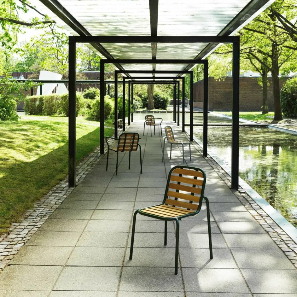 Die raffinierte Verbindung zwischen den schmalen Stuhlbeinen, der geräumigen Sitzfläche und der bequemen Rückenlehne verleihen dem Vig Gartenstuhl eine einladende Ausstrahlung. Auch die abgerundeten, weichen Kanten tragen zur freundlichen Note des Modells bei. Das moderne Design bestimmend sind aber horizontal angeordnete schmale Streben, die im Sitz- und Rückenbereich verlaufen und für eine luftig-leichte Optik sorgen. Der komfortable Stuhl ist in verschiedenen farblichen Ausführungen erhältlich, die sich perfekt in die Natur einfügen. Um das Aussehen des Sitzmöbels zu bewahren und die Witterungsbeständigkeit zu erhöhen, wurde der Gartenstuhl aus doppelt pulverbeschichtetem Stahl hergestellt. Ausgelegt ist er damit für jahrelangen Gebrauch im Freien, ob auf dem Balkon, mitten im Garten oder auf der Terrasse.