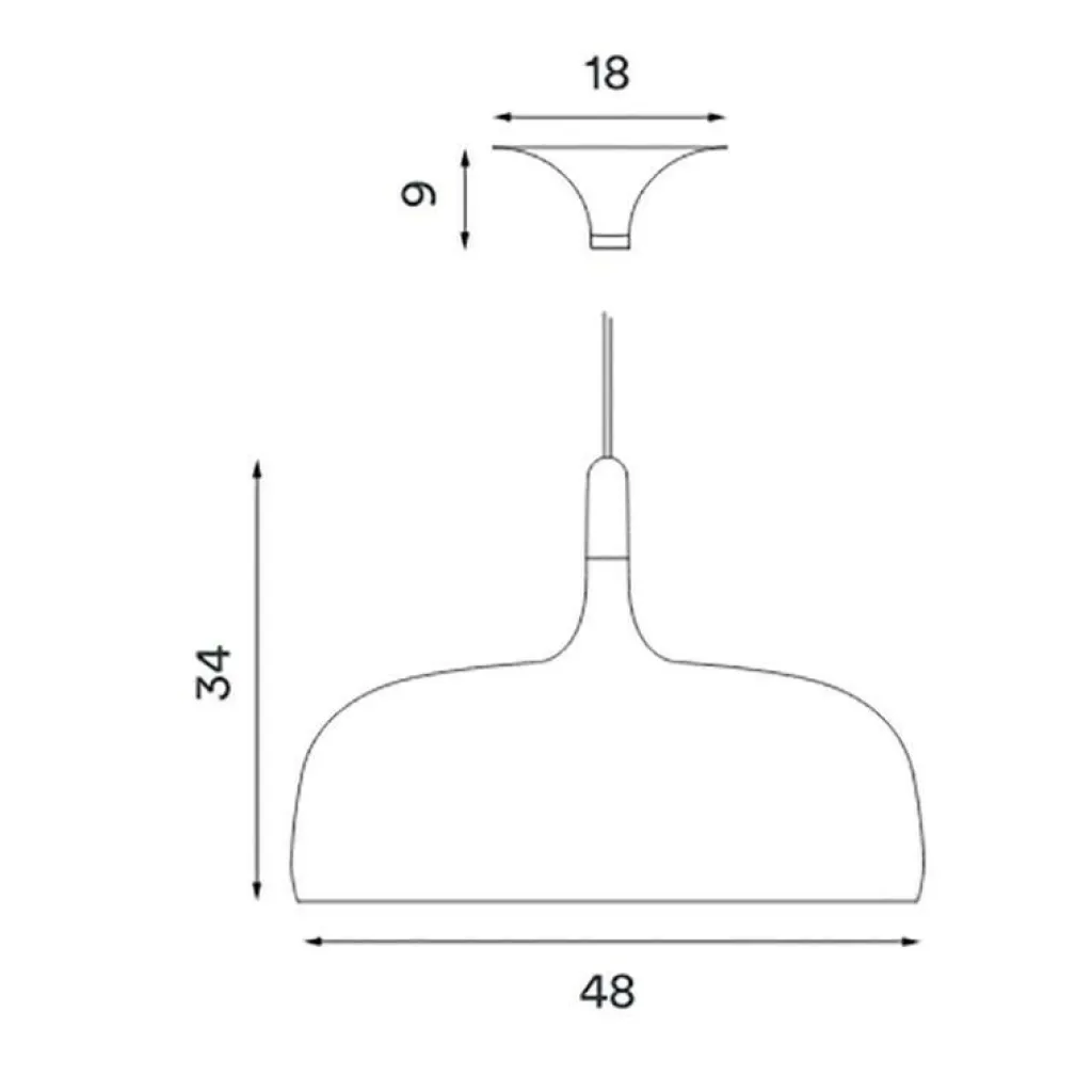 Die Acorn Pendelleuchte ist 2,3 kg schwer. Die Höhe des Leuchtenschirms beträgt 34 cm und der Durchmesser 48 cm. Mit einem 300 cm langen Kabel wird sie an den Stromkreis angeschlossen. Die Leuchte benötigt ein Leuchtmittel mit einer E27-Fassung, das unter Zubehör mitbestellt werden kann.