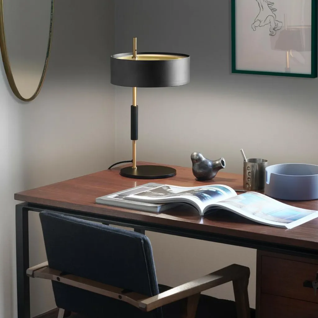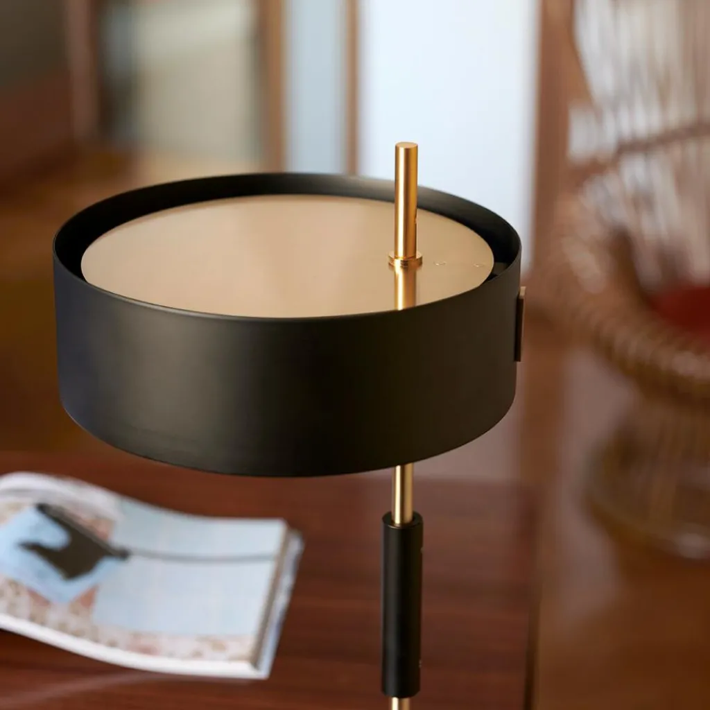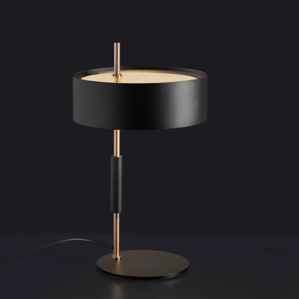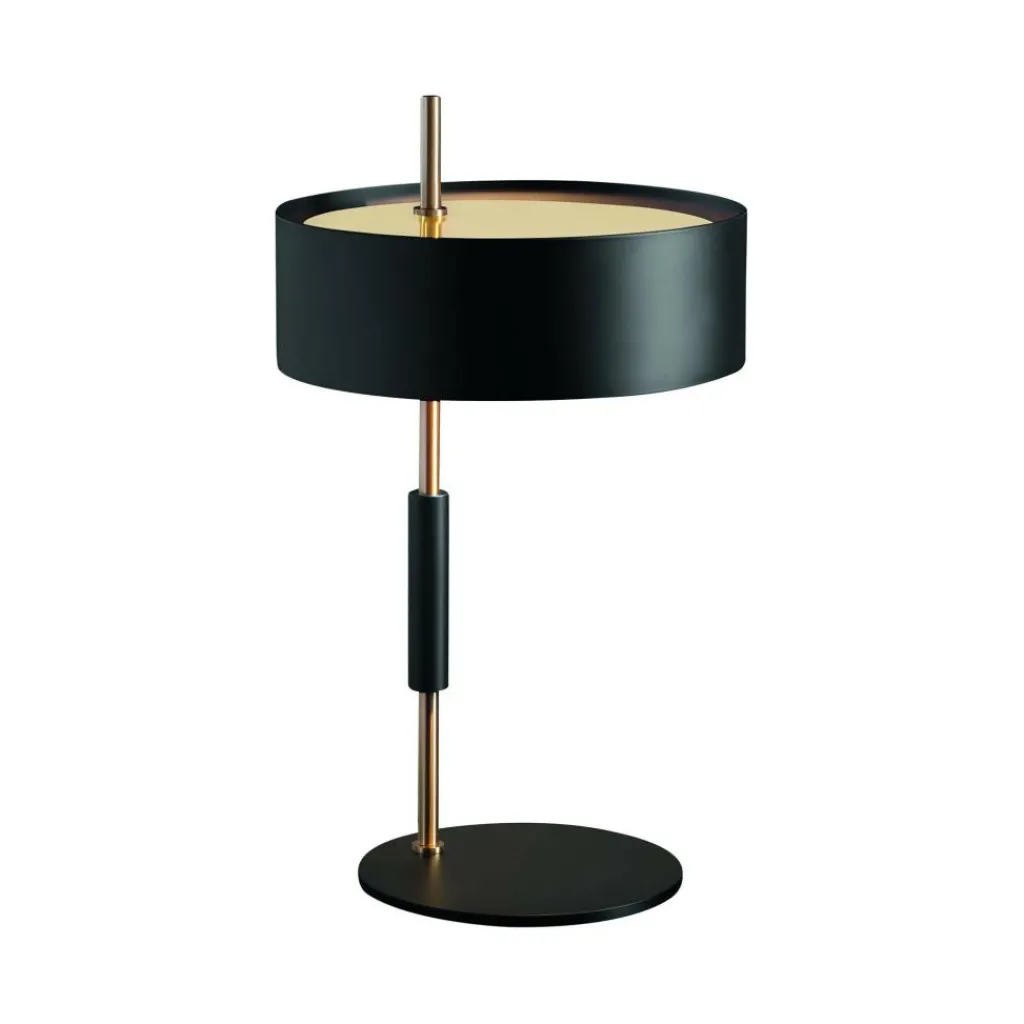 Mit ihrer außergewöhnlichen Form ist die 1953/243 Tischleuchte ein auffallendes Designobjekt. Es wird gerne im privaten Homeoffice, im Schlafzimmer, auf Regalen oder im Büro eingesetzt. Festen Stand gewährleistet eine dunkle runde Basis. Sie harmoniert perfekt mit dem Leuchtenschirm, der ebenfalls aus mattem dunklem Material gefertigt ist. Er ist in Form eines flachen Zylinders gestaltet. Einen auffallenden Kontrast dazu bildet der goldglänzende Metallstab, der Fuß und Leuchtenschirm verbindet. Die Oberseite des Schirms ziert eine goldene Scheibe, die das Licht nach unten reflektiert.