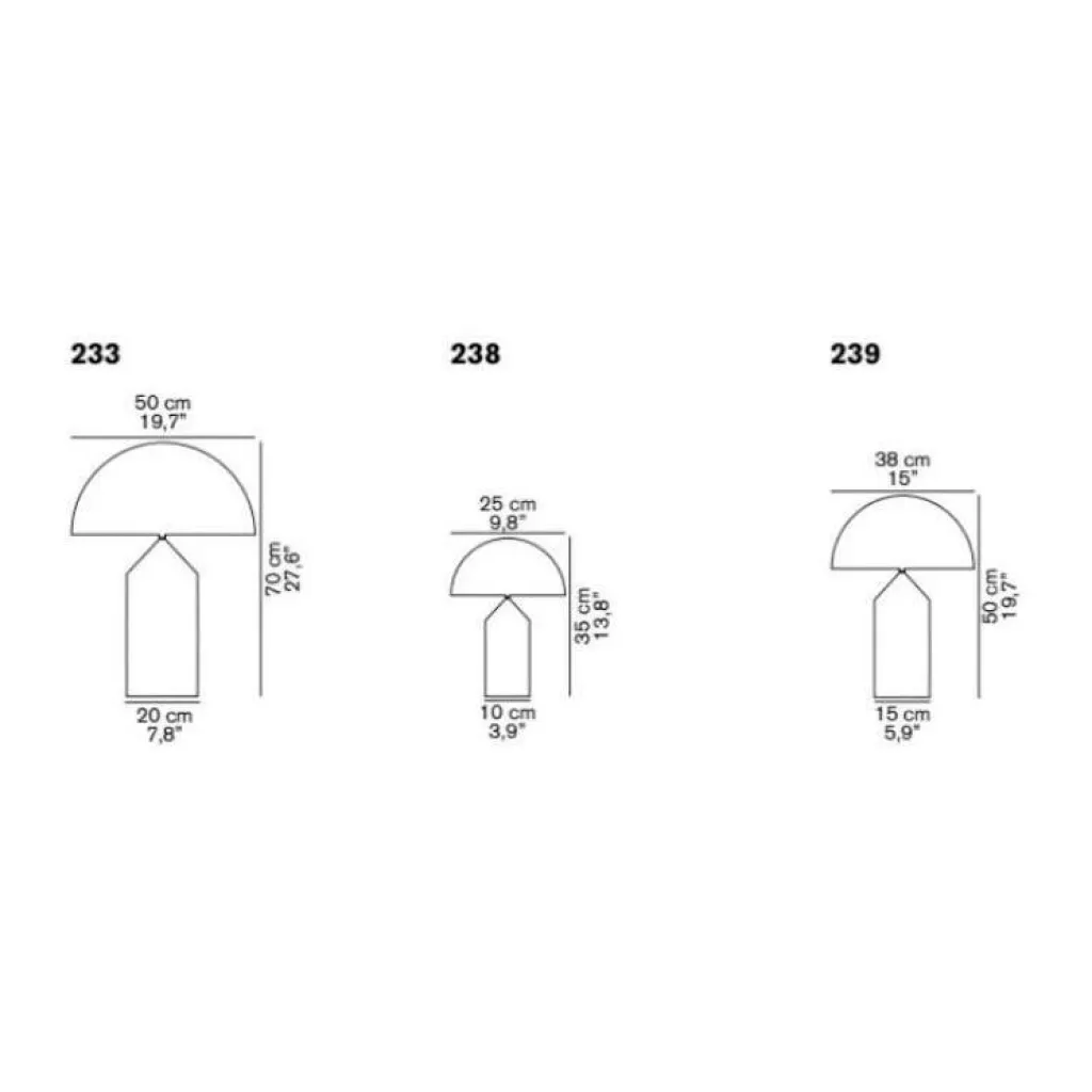 Schon beim ersten Hinsehen fällt die Ähnlichkeit derAtollo Tischleuchte bronze mit einem Pilz auf. Sie ist in drei verschiedenen Ausführungen erhältlich: Für den Nachttisch am besten geeignet ist die kleinste Variante mit einem Durchmesser von 25 cm und einer Höhe von 35 cm. Der in einer Halbkugel geformte Leuchtenschirm der 50 cm hohen Variante weist einen Durchmesser von 35 cm auf. Außerdem ist ein großes, 70 cm hohes Modell mit 50 cm Durchmesser erhältlich. Die Kabellänge von 200 cm ermöglicht Flexibilität bei der Auswahl des Standorts. Die Leuchte in mattem Bronze spendet angenehmes und indirektes Licht, das bei den beiden größeren Modellen auch über den Schalter dimmbar ist. Gefertigt ist die Atollo Tischleuchte bronze aus Aluminium. Das passende Leuchtmittel mit der Fassung E27 kann unter Zubehör mitbestellt werden.