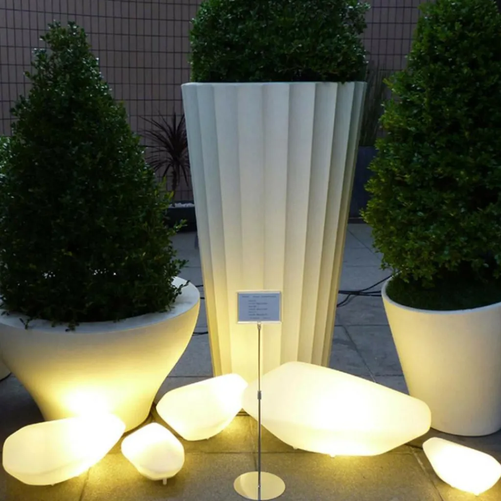 Da die Stones Außenleuchte aus robustem Polyethylen gefertigt ist, hält sie Witterungseinflüssen problemlos stand. Da Spritzwasser der Kunststoffleuchte nichts ausmacht, kann sie auch neben dem Pool platziert werden. Da das Modell mit einem 300 cm langen Kabel an den Stromkreis angeschlossen wird, kann Flexibilität bei der Wahl des Standorts garantiert werden. Das Kabel besteht aus robustem Neopren. Im Lieferumfang der Stones Außenleuchte ist das passende Leuchtmittel nicht enthalten: Ein Leuchtmittel mit der Fassung E27 kann aber unter Zubehör extra bestellt werden. Wer den Outdoorbereich auch bei Dämmerung und Dunkelheit perfekt in Szene setzen möchte, platziert mehrere Stones Außenleuchten in einer Reihe am Wegesrand oder wie zufällig auf dem Rasen.