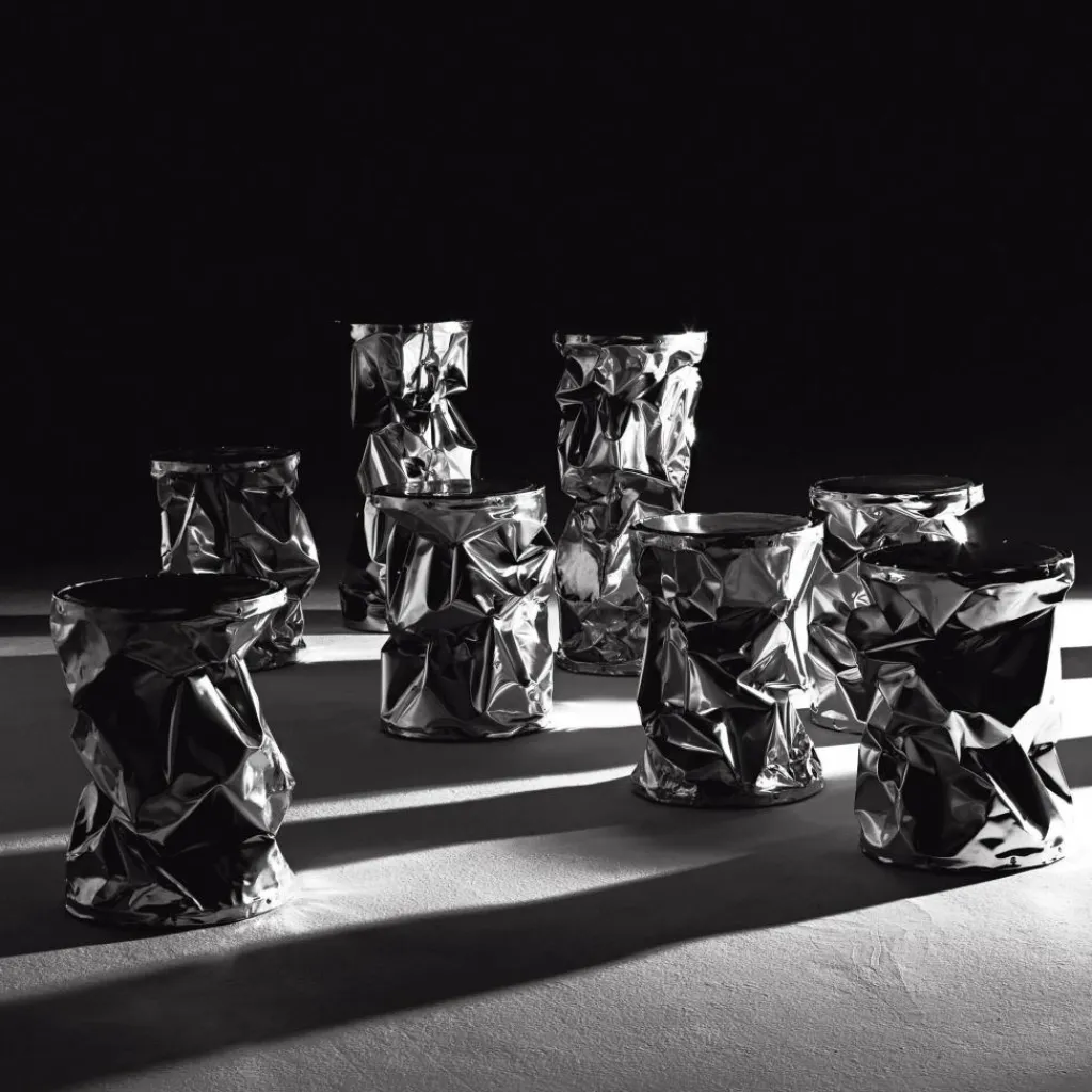 Glamour verbreitet der Big Tab.U Barhocker an der Hausbar, in der Hotellobby oder in einem Lokal. Jedes Exemplar ist ein Einzelstück. Der Hocker wird nämlich in liebevoller Handarbeit gemacht. Eine Konstruktion aus Sperrholz bildet den Rahmen. Darüber ist eine dünne Schicht Aluminium befestigt. Sie ist an den Seiten per Hand des runden Hockers in Falten gelegt. An der zerknitterten Oberfläche reflektieren Licht- und Sonnenstrahlen., denn sie ist glänzend gestaltet und in mehreren Metalltönen zu haben. Inspiration für das Design des Big Tab.U Barhockers fand der Designer in Getränkedosen. Wenn sie ausgetrunken sind, werden sie oft zerdrückt und sehen ein wenig aus wie der Big Tab.U Barhocker.Die Sitzfläche gestaltet der Designer glatt. Darin spiegeln sich Gesichter, Einrichtungsgegenstände und vieles mehr. So spielt Rainaldi gekonnt mit glatten und unregelmäßigen Formen.
