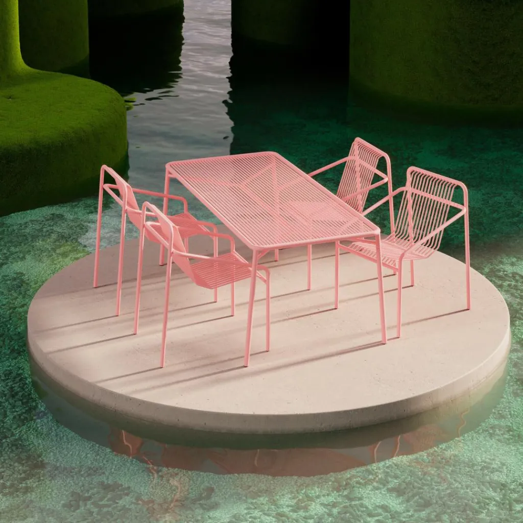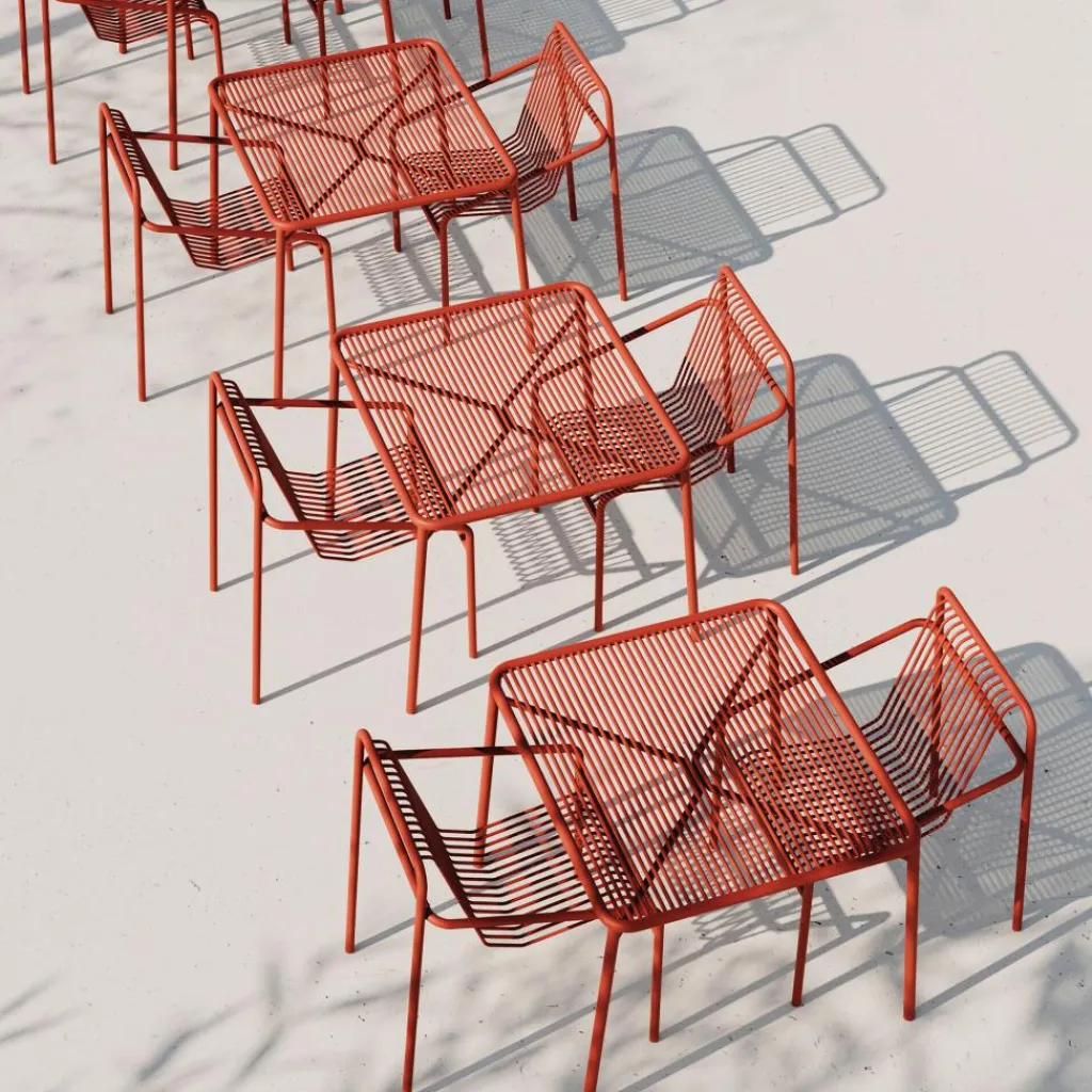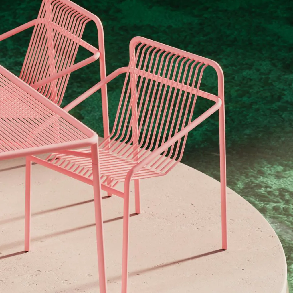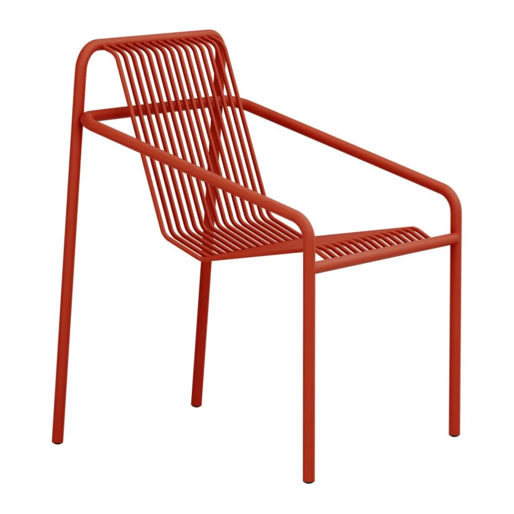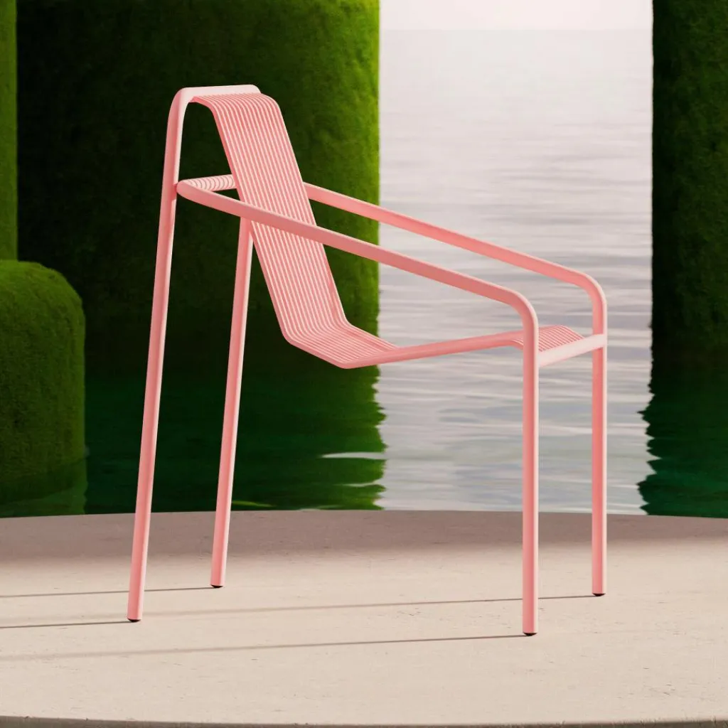 Markantes Merkmal der Ivy-Gartenmöbel-Serie ist die Ausführung von Flächen mit linearen Stäben. So besteht der Sitz des Ivy Gartenarmlehnstuhls aus gleichmäßig nebeneinander gereihten Stahlrohren, deren schlanke Gestalt einen Durchblick auf den Hintergrund gewährt, während sie eine an die Form des Körpers angepasste Fläche bildet. Eingespannt zwischen zwei gebogenen Rohrelementen, die sich zu einem minimalistischen Stuhlgestell zusammensetzen, bilden sie ein bequemes Sitzmöbel mit einem rückwärts geneigten Sitz, einer abgerundeten Stuhlkante und nach hinten hin stark ansteigenden Armlehnen. Gefertigt aus pulverbeschichtetem Stahl zeichnet sich der Ivy Gartenarmlehnstuhl durch seine langlebige Robustheit aus. Er ist für den Außenbereich geeignet. Dabei schaffen die auffälligen Farben einen attraktiven Kontrast zu Steinmauern oder zum Grün des Gartens. Der Ivy Gartenarmlehnstuhl passt auf eine Hotelterrasse oder in eine Outdoorlounge und macht sich ebenso gut in der Wiese daheim.