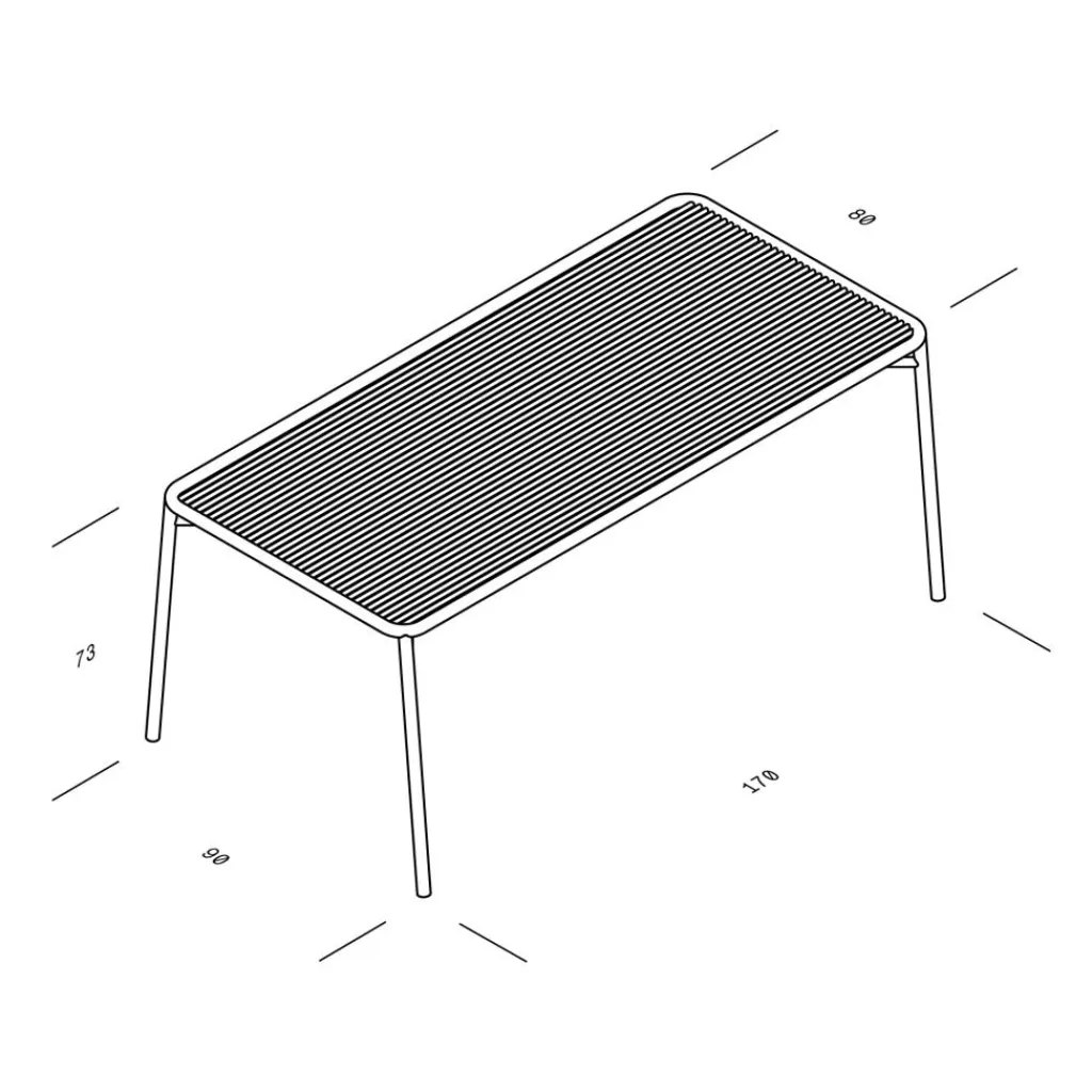 Die Fläche dieses extravaganten Designtisches besteht aus schlanken, auf Lücke nebeneinanderliegenden Metallstäben und gewährt dadurch einen Durchblick auf den Boden. Gleichzeitig sind die Abstände so gering gehalten, dass die Tischfläche eine stabile Unterlage für Teller, Gläser und Besteck bietet. Umrahmt von robustem Rundstahl ist die Tischfläche mit einer vierbeinigen Konstruktion verschweißt. Kreuzweise Verstrebungen und leicht nach außen weisende Stützen garantieren eine hohe Belastbarkeit. Dank einer hochwertigen Pulverbeschichtung zeichnet sich der Ivy Gartenesstisch 170x90cm durch eine langlebige Witterungsbeständigkeit aus. Damit eignet er sich für den Einsatz unter freiem Himmel. Er passt auf die Dachterrasse eines Hotels, in das Atrium eines Restaurants oder mitten in die Wiese im privaten Hausgarten.
