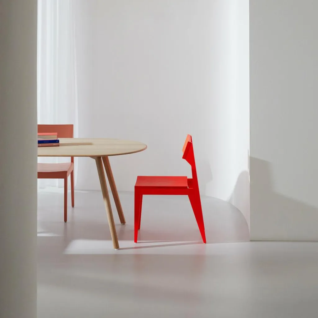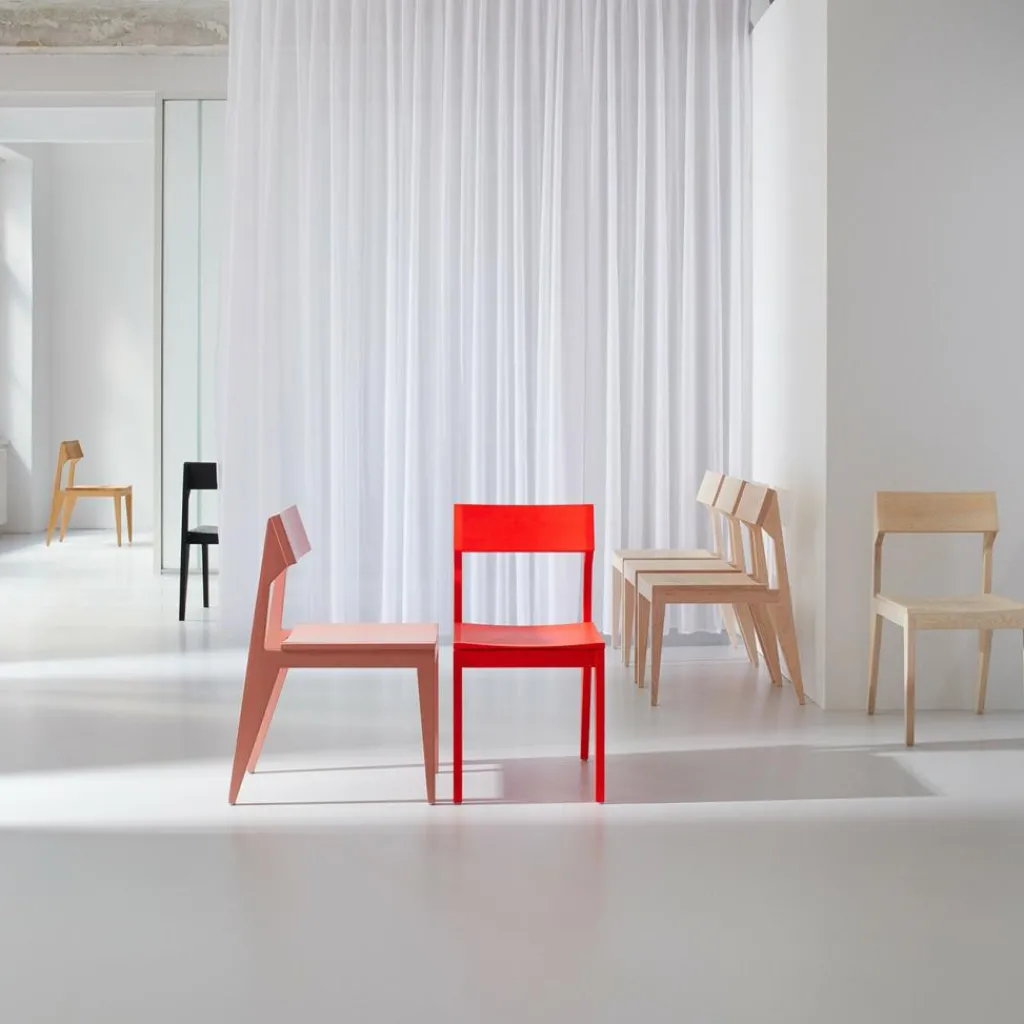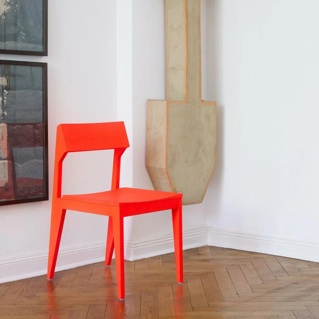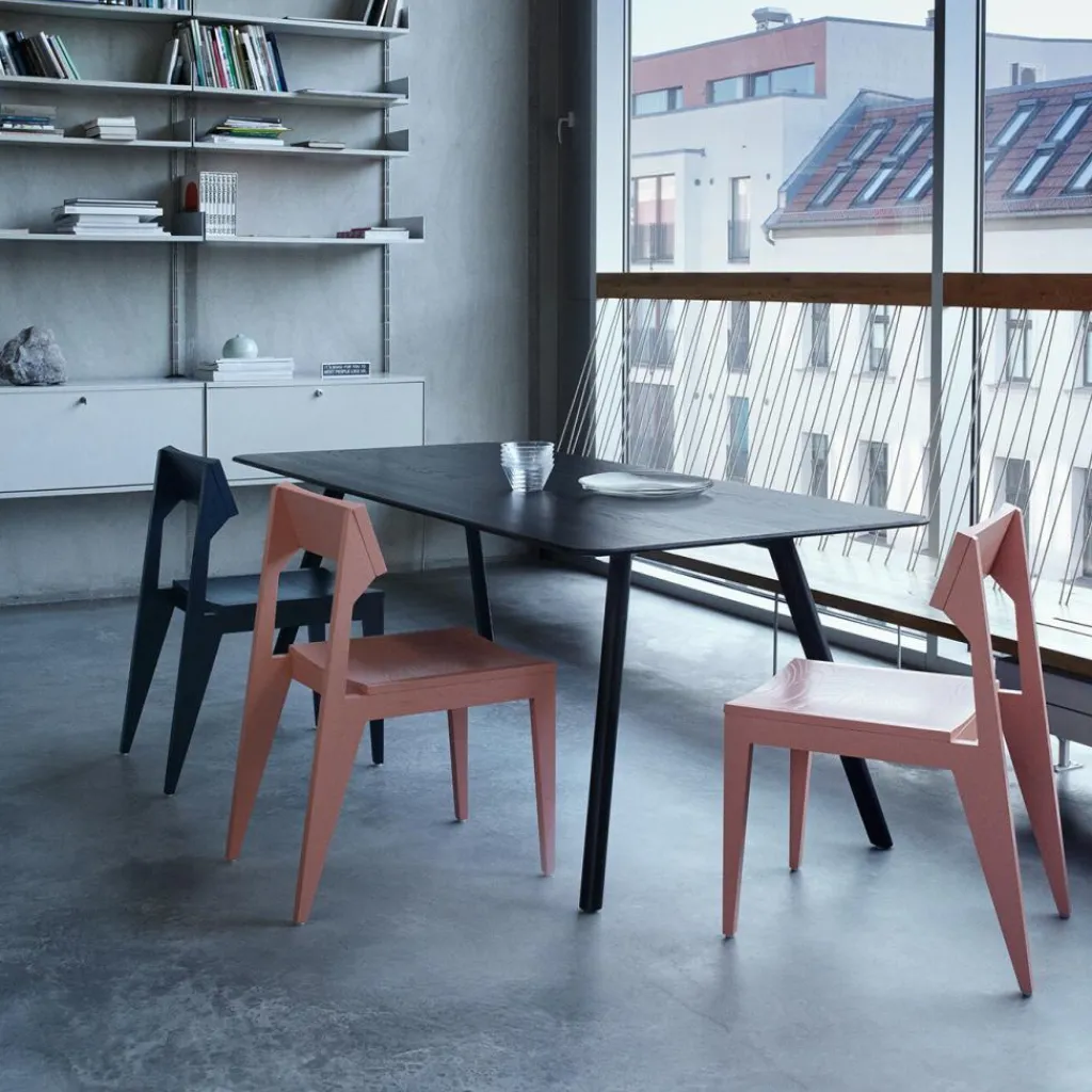 Der Schulz Stuhl entsteht in liebevoller Handarbeit. In ausgewählten Werkstätten in Deutschland wird der Stuhl aus hochwertigem Eschen- oder Eichenholz gefertigt. Von vorne wirkt das Design noch unspektakulär, von der Seite aus betrachtet, fällt jedoch die strenge grafische Linienführung auf. Die Rückenlehne sieht wie ein Dreieck aus; einen Kontrast dazu bilden die beiden deutlich ausgestellten hinteren Beine vom Schulz Stuhl. Die Vorderbeine hingegen zeigen mit der Sitzfläche einen strengen rechten Winkel. Mit seiner außergewöhnlichen Form wird der Schulz Stuhl in jedem Raum zum Blickfang: Er kann im Esszimmer in Gruppen drapiert verwendet werden, macht jedoch auch alleinstehend in einem Büro oder im Flur eine ausgezeichnete Figur.