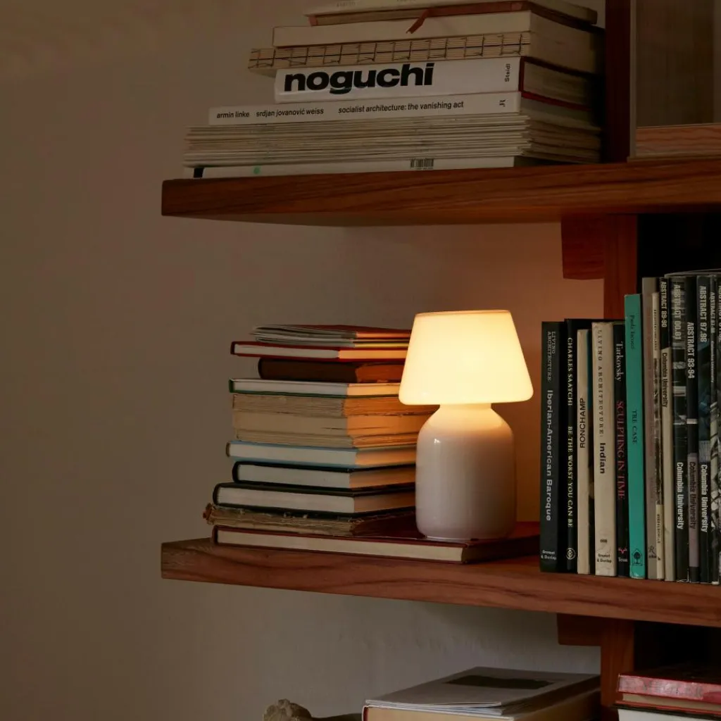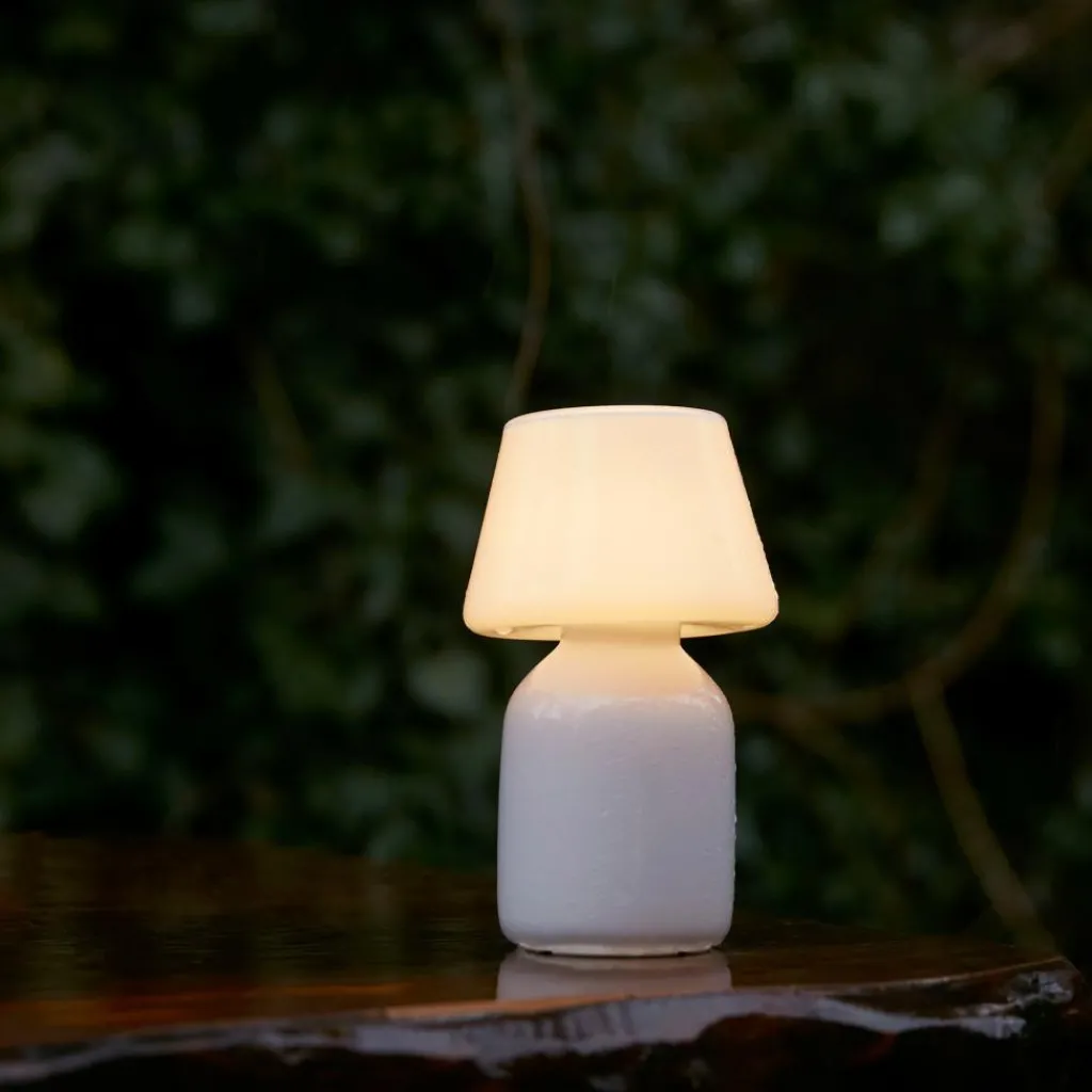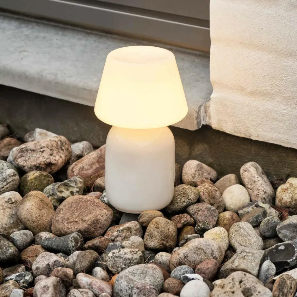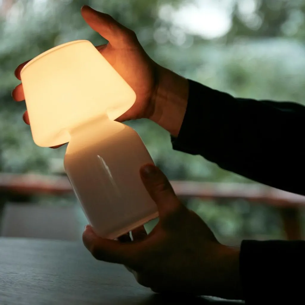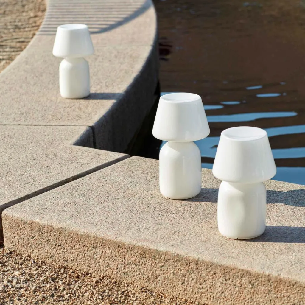Von der klassischen Lampenform inspiriert, besticht die Apollo Akkuleuchte durch ihr einfaches Design. Dabei zeigen verschiedene Modelle nebeneinander betrachtet deren individuellen Charakter. Denn ihre vasenförmige Basis ist unterschiedlich, und oft wirkt der Schirm leicht verrutscht. Doch ist jedes einzelne Exemplar handlich und flexibel einsetzbar. Anders als bei herkömmlichen Leuchten üblich ist die Apollo Akkuleuchte aus einem einzigen Stück Opalglas gefertigt. Lichtquelle und Akku sitzen unter dem Schirmteil. So erzeugt die Apollo Akkuleuchte ein angenehm weiches und diffuses Licht. An der Unterseite ihrer Basis befindet sich ein dreistufiger Dimmer. Die Apollo Akkuleuchte ist innen und außen verwendbar. Damit eignet sie sich gut für den Balkon oder ein Plätzchen mitten im Garten. Auch als Tischbeleuchtung in einem Terrassencafé ist die Apollo Akkuleuchte perfekt.