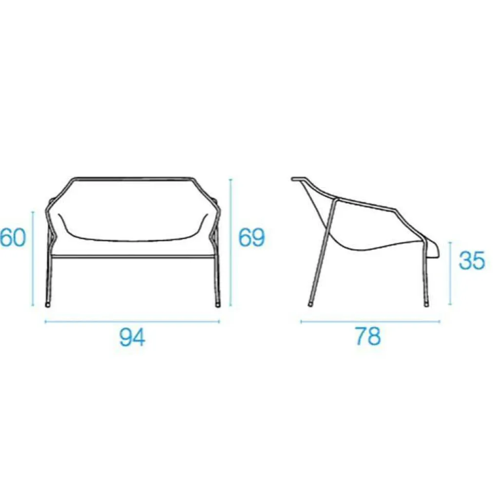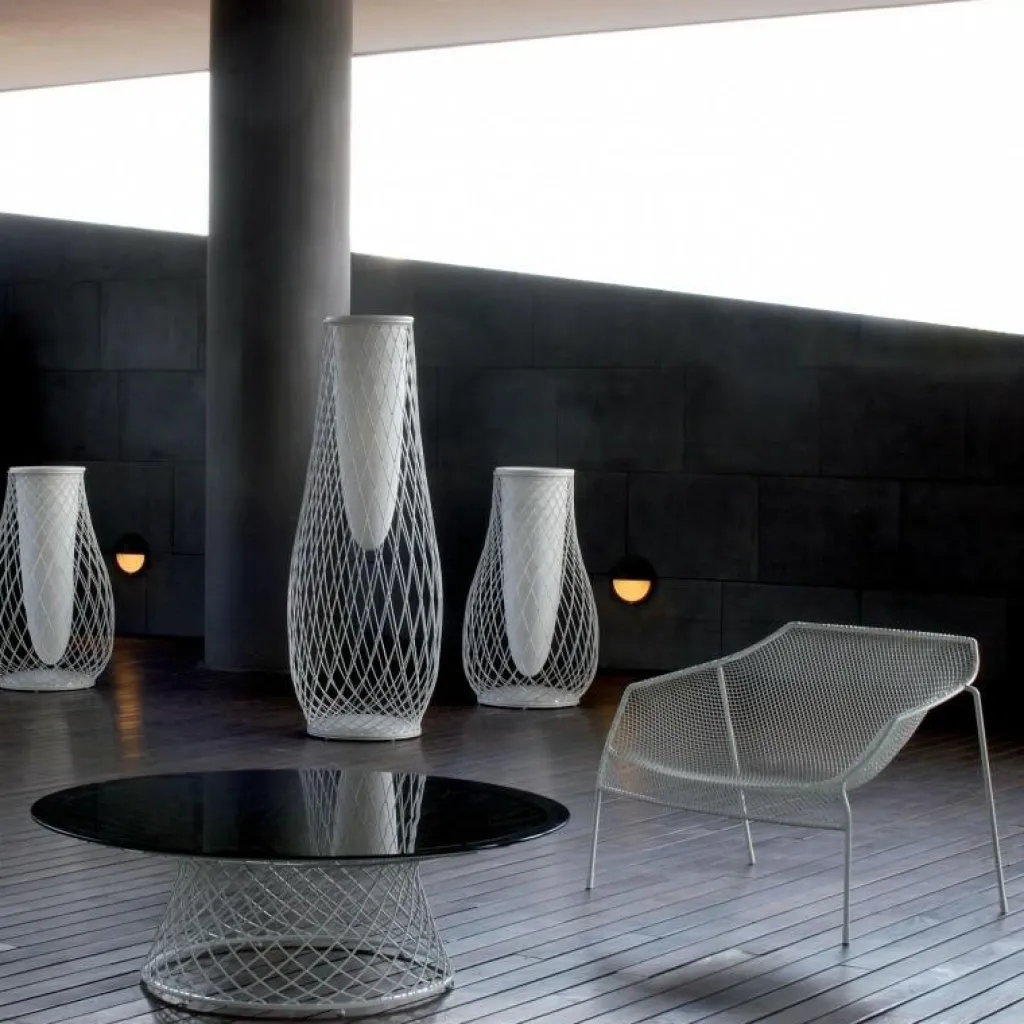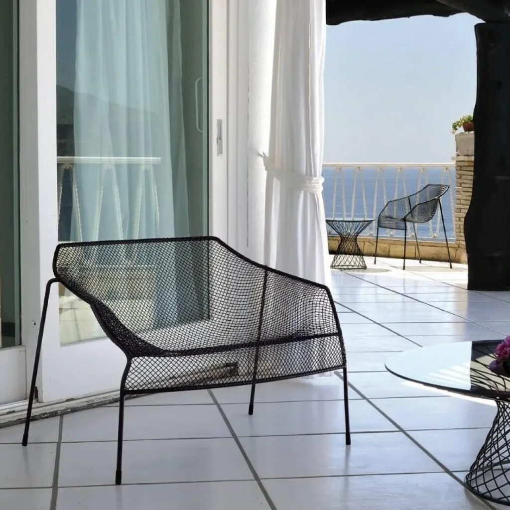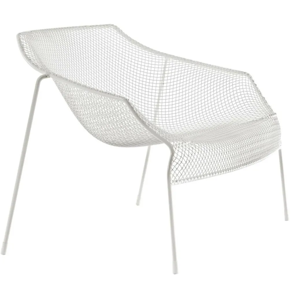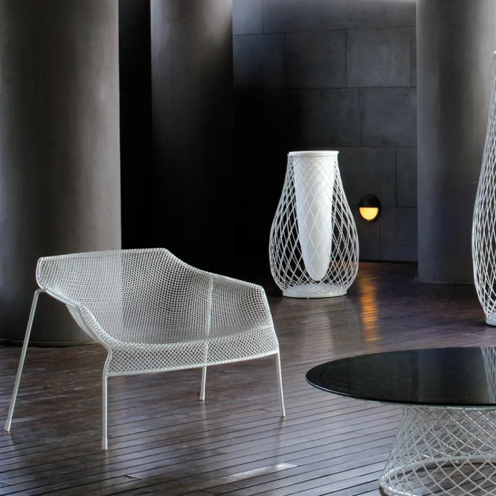 Der Heaven Outdoor-Sessel besteht aus lackiertem Stahl, das aus einem einzigen automatischen Schweißvorgang wie ein Gewebe geflochten wurde. Das Rahmengestell besteht aus Stahlrohr und die Sitzschale aus lackiertem vorverzinktem Stahldrahtgeflecht. Der HeavenLounge Chair ist stapelbar und passt z.B. bestens zum Heaven Beistelltisch.