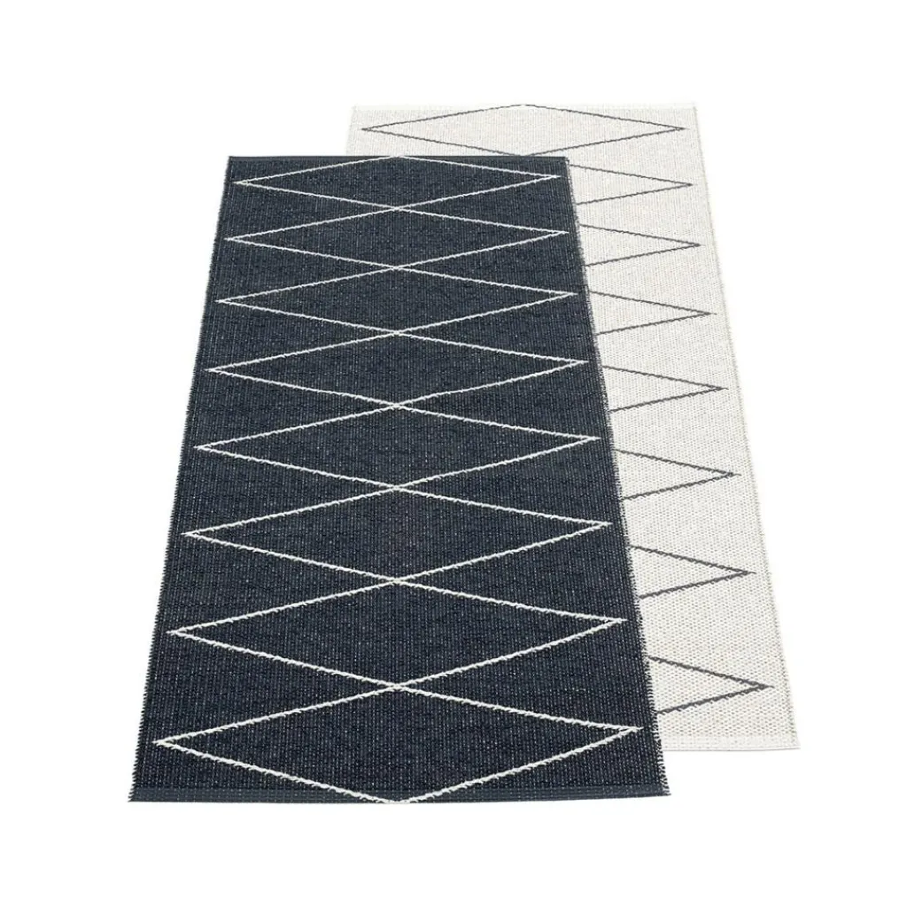 Der Max Teppich/Läufer 160x70cm hält jedem Wetter stand. Er wird in Schweden hergestellt. Für das Modell verwendet die Designerin zu 92 Prozent phthalatfreies PVC. 8 Prozent des Gewebes bestehen aus Polyester. Der Max Teppichläufer 70x160cm wird auf Webstühlen von Hand gemacht. Daher kann es zu leichten Abweichungen in der Größe kommen. In den Max Teppichläufer 70x160cm sind Linien eingearbeitet, die sich kreuzen. So entsteht ein dreidimensionales Muster. Man kann den Teppich wenden. Dann ist das Muster im Negativ zu sehen. Zur Pflege bietet sich das regelmäßige Absaugen an. Man kann den Max Teppichläufer 70x160cm auch in der Waschmaschine bei 30 °C reinigen. Um das Material zu schonen, sollte man auf Schleudergänge verzichten. Das an beiden Enden eingearbeitete Prägelogo weist den Teppich als Original aus.