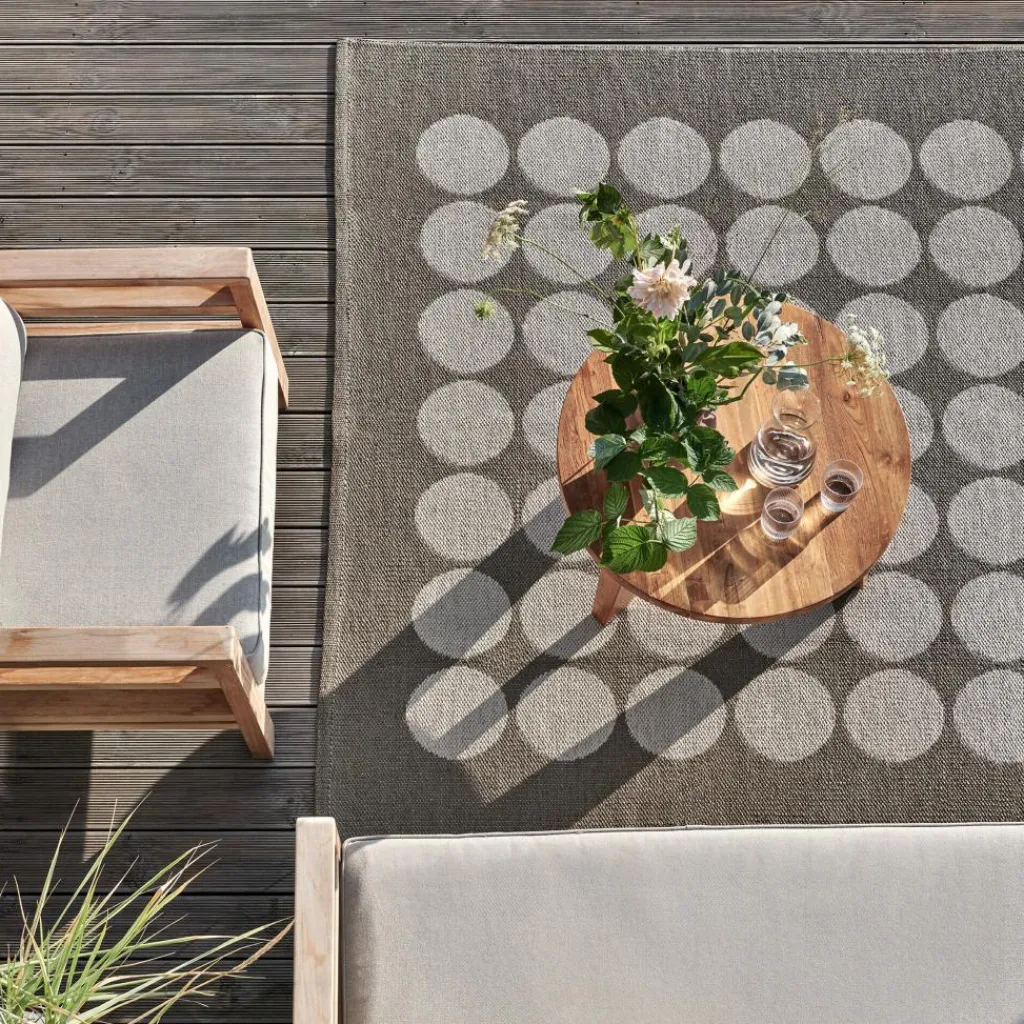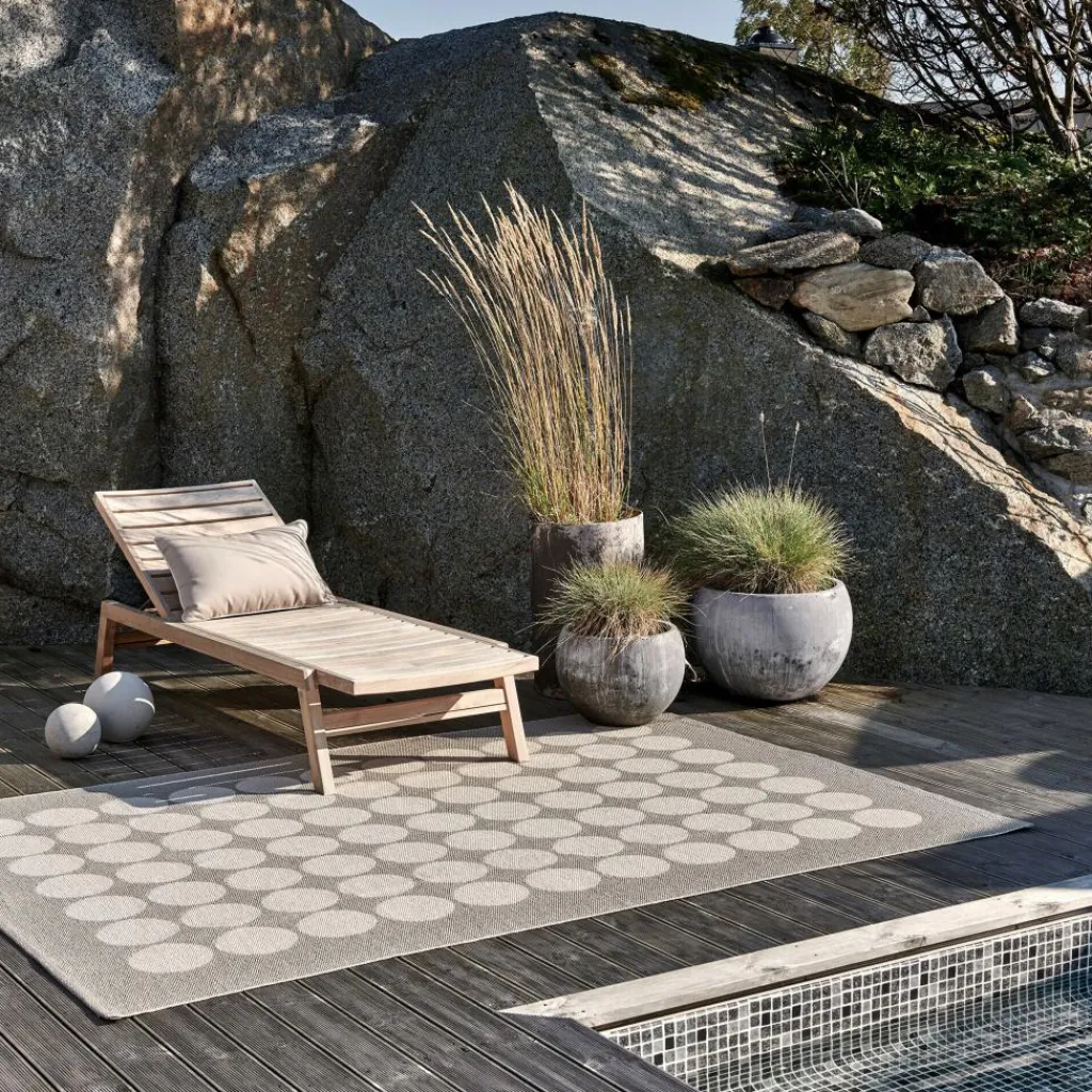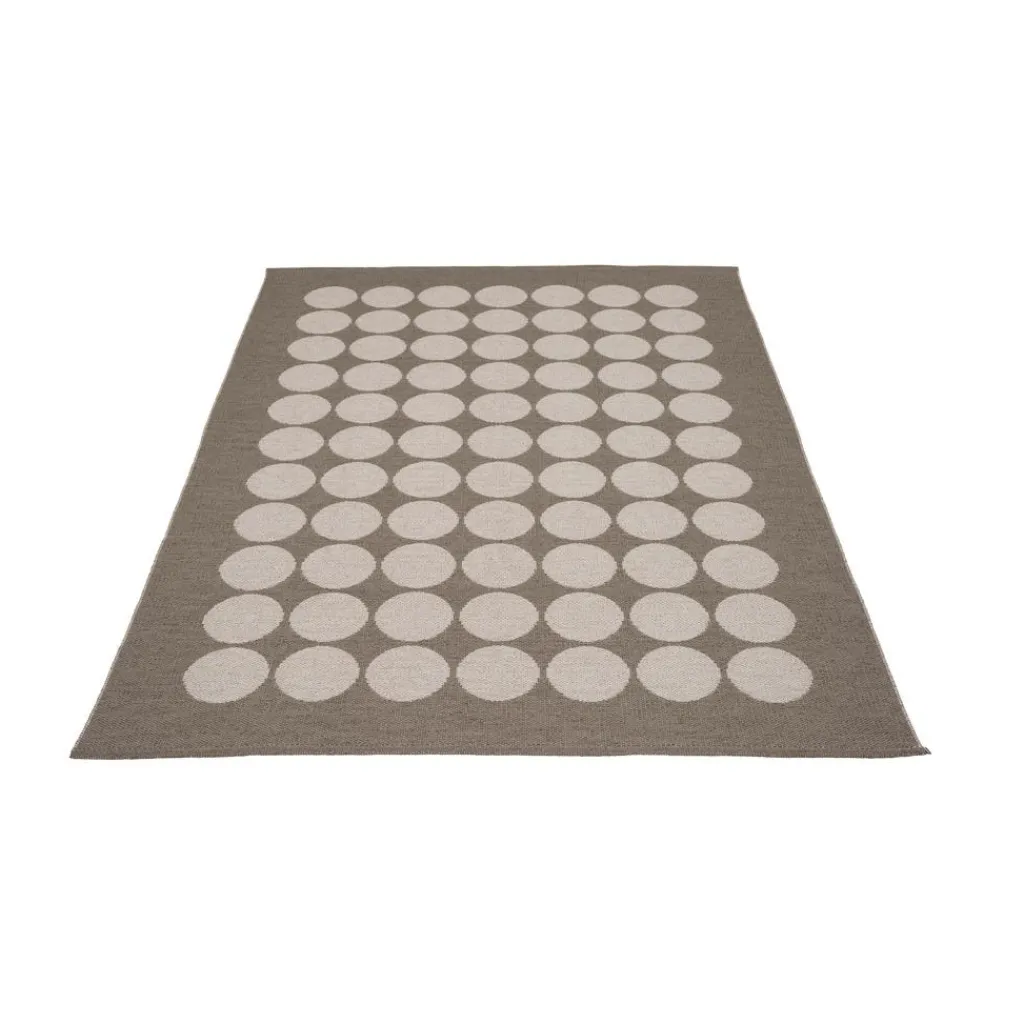 Die Hugo Kunststoffteppiche zeichnen sich durch ihr zeitloses, von Kreisen in sieben Linien geprägtes Design aus. Hugo wird von Pappelina in Schweden unter strenger Qualitätskontrolle mit Kunststofffäden in diversen Farbtönen gewebt, und hat beim Wenden dasselbe Muster in gegensätzlicher Farbkonstellation.