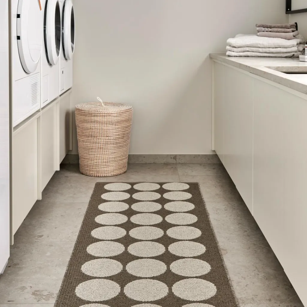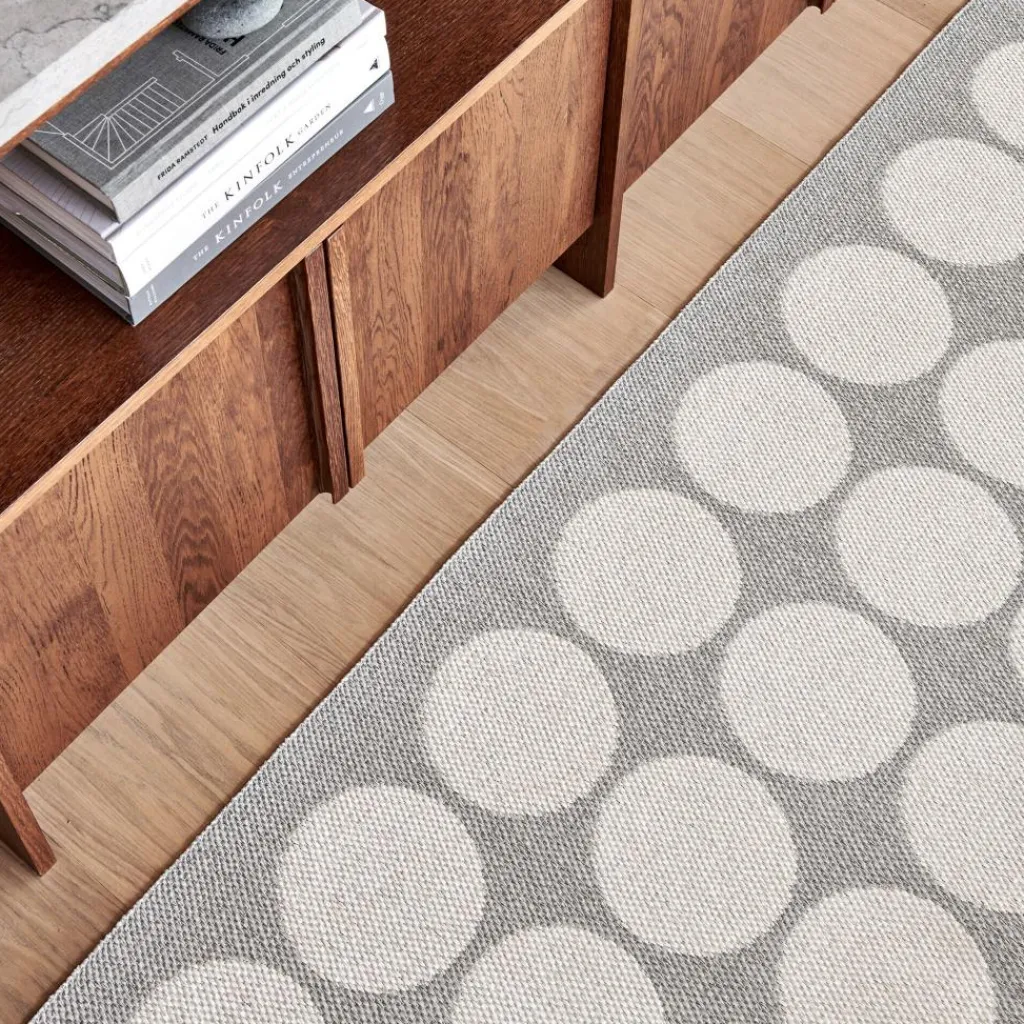 Die Hugo Kunststoffteppiche zeichnen sich durch ihr zeitloses, von Kreisen in drei Linien geprägtes Design aus. Hugo wird von Pappelina in Schweden unter strenger Qualitätskontrolle mit Kunststofffäden in diversen Farbtönen gewebt, und hat beim Wenden dasselbe Muster in gegensätzlicher Farbkonstellation.