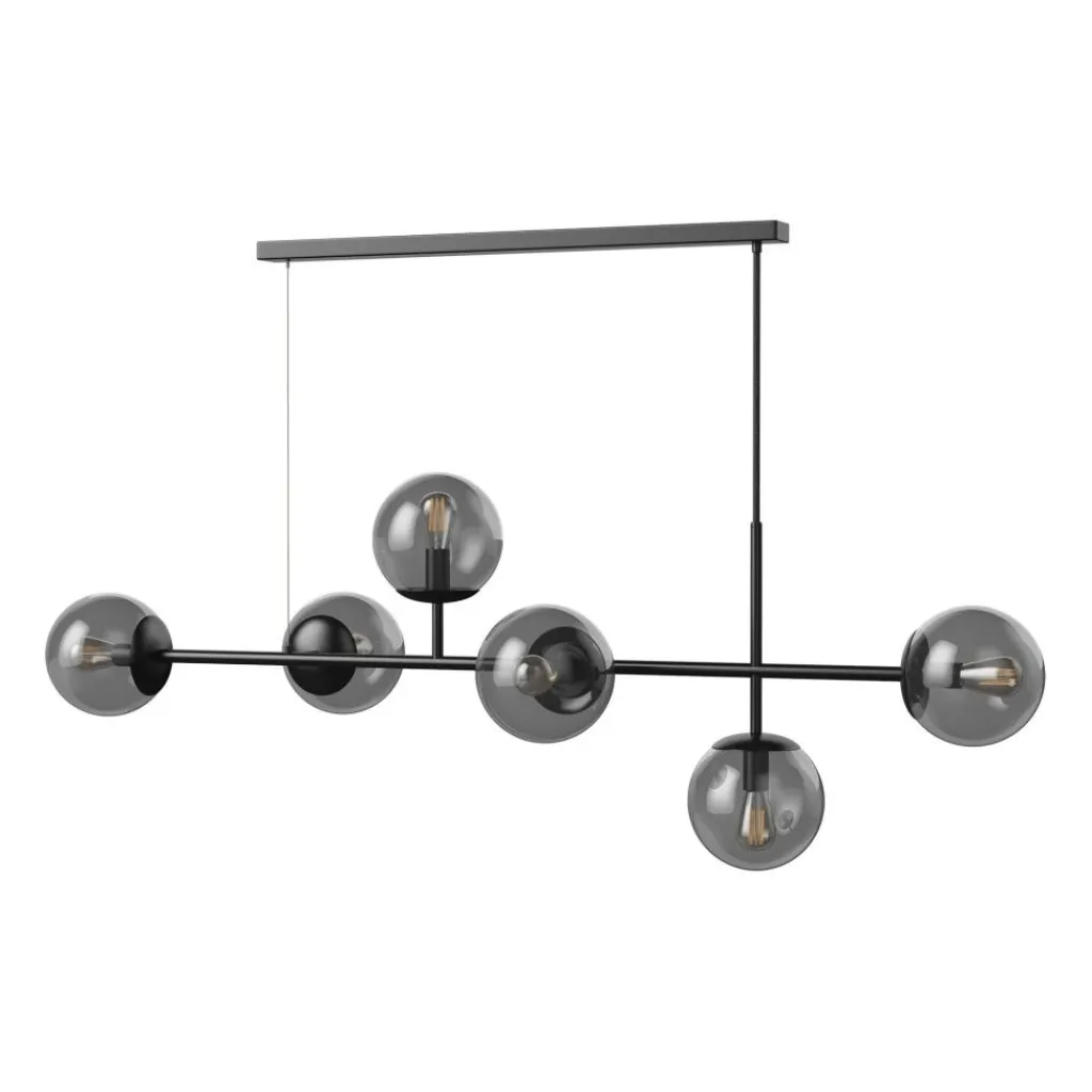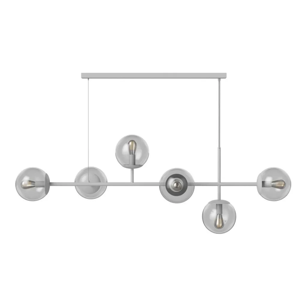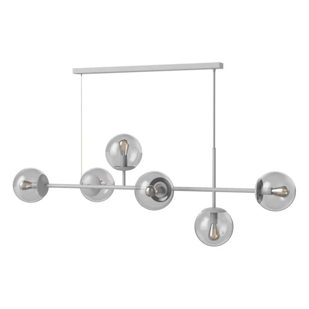 Die Orb Pendelleuchte zeichnet sich durch ihre klare, kugelförmige Struktur aus, die an Perlen an einer Kette erinnert. Die insgesamt sechs Leuchten aus hochwertigem Glas sorgen für eine gleichmäßige, angenehme Lichtverteilung und schaffen eine ruhige, einladende Atmosphäre. Die Leuchte wird von einem filigranen gefärbten Gestell aus Eisen gehalten, das ihr eine leichte und zugleich stabile Präsenz verleiht. Die Kombination aus Glas und Metall setzt einen eleganten Akzent und macht die Leuchte zu einem Blickfang in jedem Raum. Die Orb Pendelleuchte passt am besten zu modernen und klassisch-eleganten Wohnstilen. Insbesondere ist sie interessant als Leuchte über dem Esstisch. Die einzelnen Leuchtenschirme haben einen Durchmesser von 15 cm. Insgesamt ist die Pendelleuchte 115 cm lang. Die Höhe beträgt 35,7 cm. Das Textilkabel ist drei Meter lang und bietet so flexible Aufhängungsmöglichkeiten. Die einzelnen Leuchten der länglichen Orb Pendelleuchte sind mit einer E14-Fassung ausgestattet und für Leuchtmittel mit einer maximalen Wattzahl von 25 W ausgelegt (Leuchtmittel sind nicht im Lieferumfang enthalten). Bei Auswahl eines geeigneten Leuchtmittels und den entsprechenden Voraussetzungen der Elektrik kann die Leuchte auch dimmbar sein.