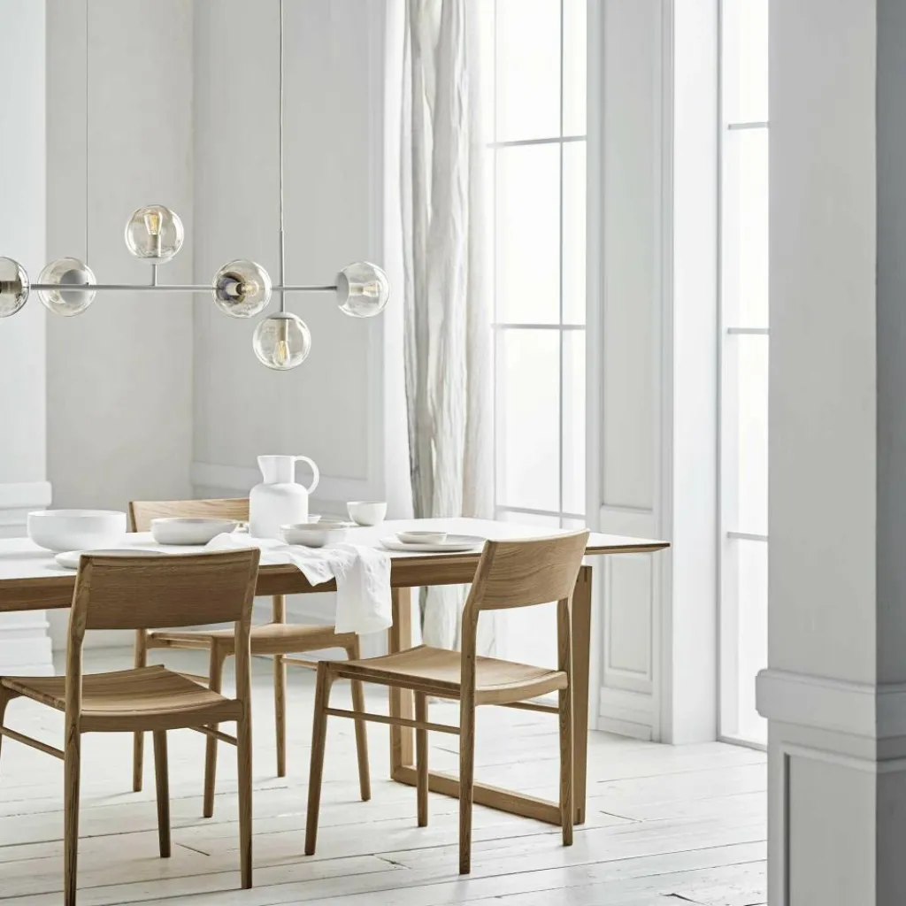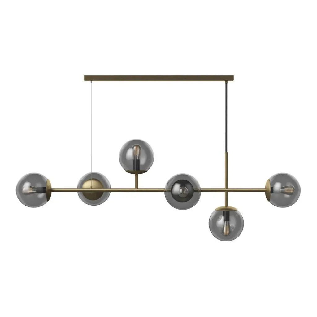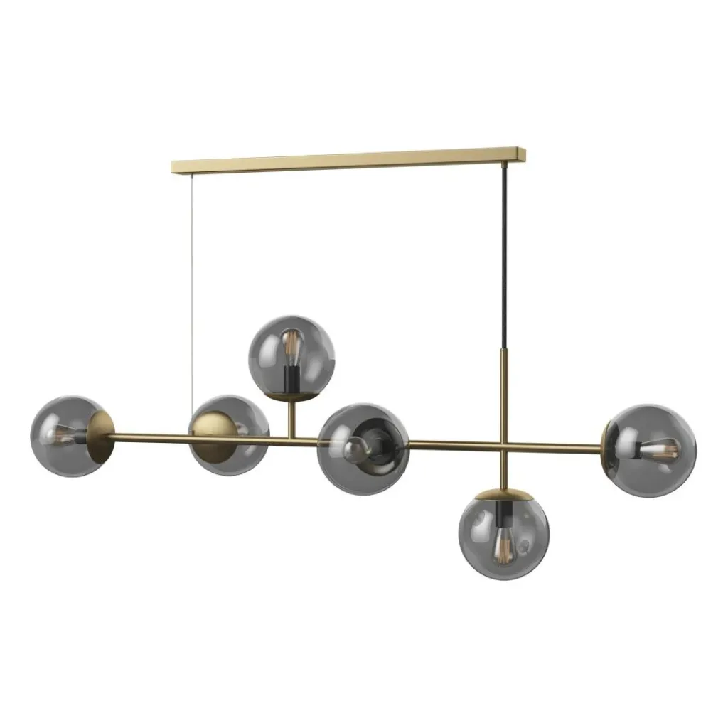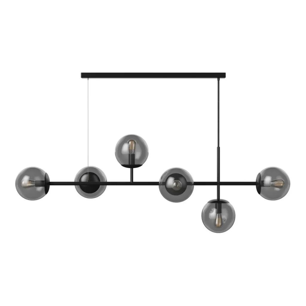 Die Orb Pendelleuchte zeichnet sich durch ihre klare, kugelförmige Struktur aus, die an Perlen an einer Kette erinnert. Die insgesamt sechs Leuchten aus hochwertigem Glas sorgen für eine gleichmäßige, angenehme Lichtverteilung und schaffen eine ruhige, einladende Atmosphäre. Die Leuchte wird von einem filigranen gefärbten Gestell aus Eisen gehalten, das ihr eine leichte und zugleich stabile Präsenz verleiht. Die Kombination aus Glas und Metall setzt einen eleganten Akzent und macht die Leuchte zu einem Blickfang in jedem Raum. Die Orb Pendelleuchte passt am besten zu modernen und klassisch-eleganten Wohnstilen. Insbesondere ist sie interessant als Leuchte über dem Esstisch. Die einzelnen Leuchtenschirme haben einen Durchmesser von 15 cm. Insgesamt ist die Pendelleuchte 115 cm lang. Die Höhe beträgt 35,7 cm. Das Textilkabel ist drei Meter lang und bietet so flexible Aufhängungsmöglichkeiten. Die einzelnen Leuchten der länglichen Orb Pendelleuchte sind mit einer E14-Fassung ausgestattet und für Leuchtmittel mit einer maximalen Wattzahl von 25 W ausgelegt (Leuchtmittel sind nicht im Lieferumfang enthalten). Bei Auswahl eines geeigneten Leuchtmittels und den entsprechenden Voraussetzungen der Elektrik kann die Leuchte auch dimmbar sein.