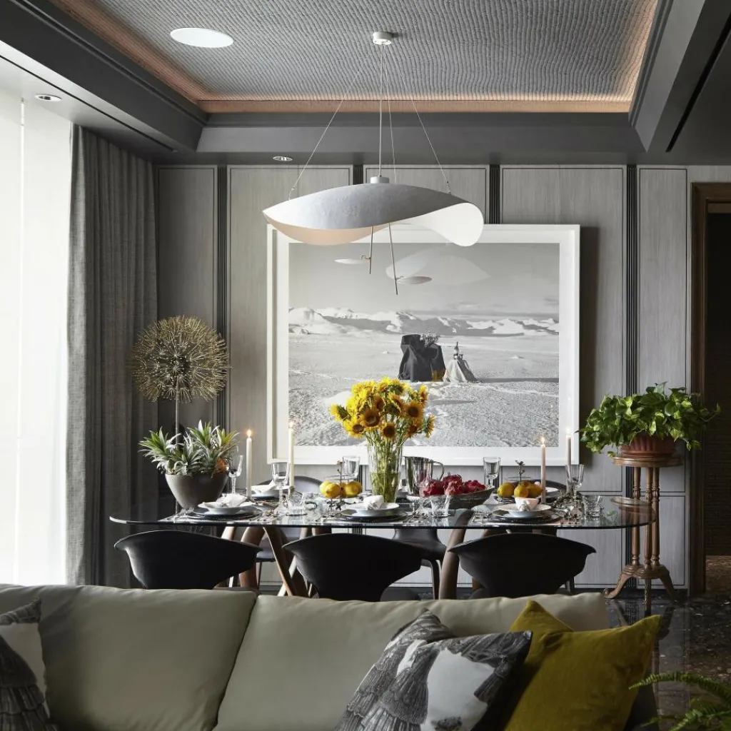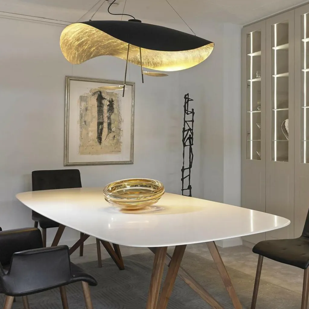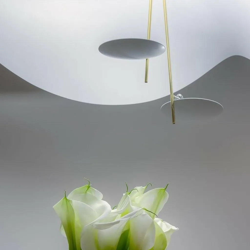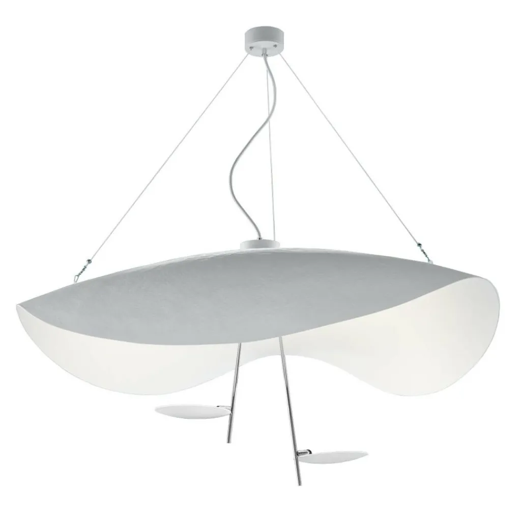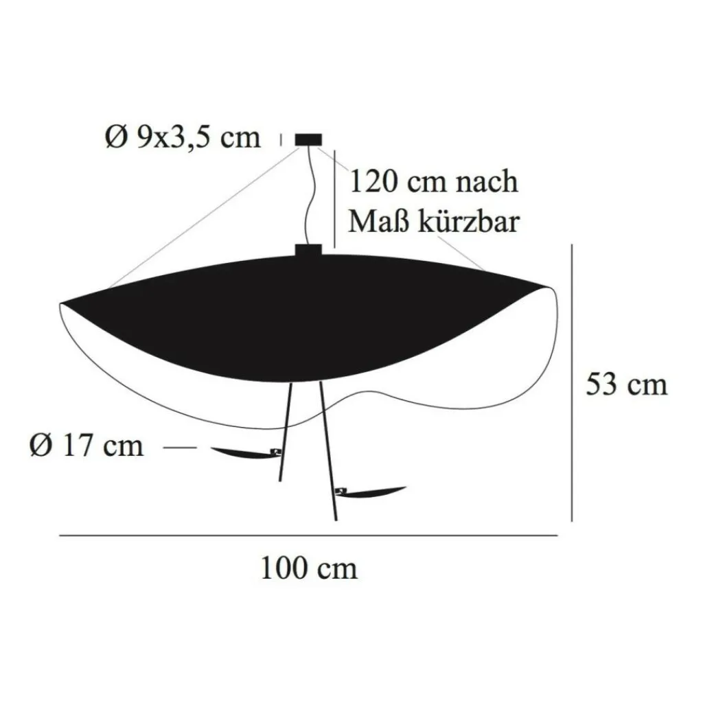 Die Lederam Manta S2 LED Pendelleuchte wurde von dem italienischen Designer Enzo Catellani für den Hersteller Catellani & Smith entworfen. Genau wie bei den anderen Leuchten aus der Serie sorgt die Lederam Manta S2 LED Pendelleuchte für eine indirekte Beleuchtung mit Hilfe der energiesparenden LED-Technologie. Die Leuchte wird mit Hilfe eines Baldachins, der einen Durchmesser von 17 cm hat, an der Decke befestigt. An einem Kabel hängt ein großer, organisch geformter Lampenschirm aus Metall, der einen Durchmesser von bis zu 100 cm hat. In der Mitte des Lampenkörpers sind zwei dünne, unterschiedlich lange Metallstäbe befestigt, an deren Ende sich jeweils eine Scheibe befindet. Die Scheiben sind mit einem Scharnier waagerecht an den Stäben angebracht und haben auf der oberen Seite LED-Module, über die die Innenseite des Lampenschirms angeleuchtet wird. So entsteht ein diffuses, warmes Licht.