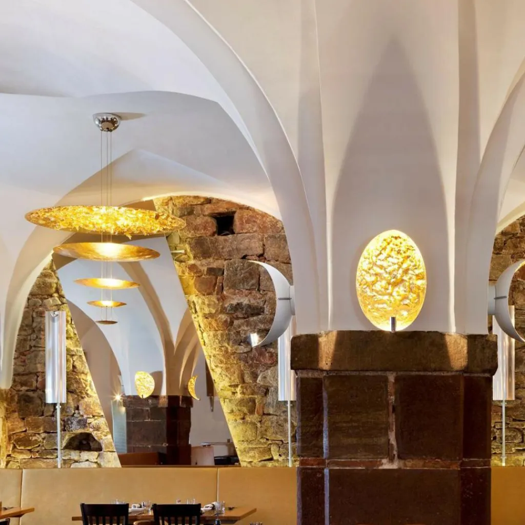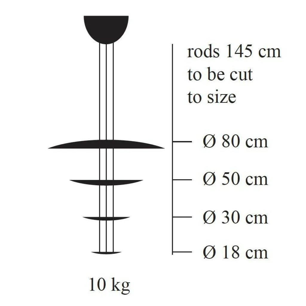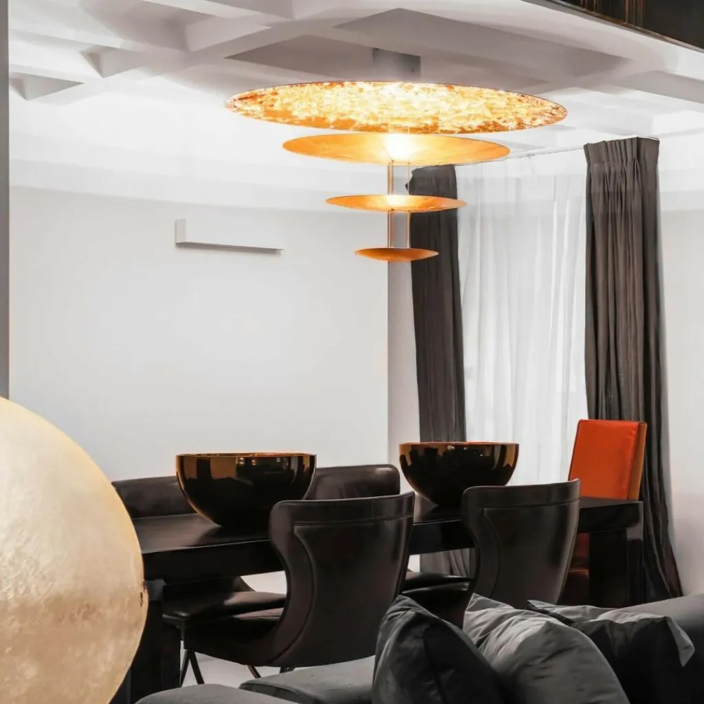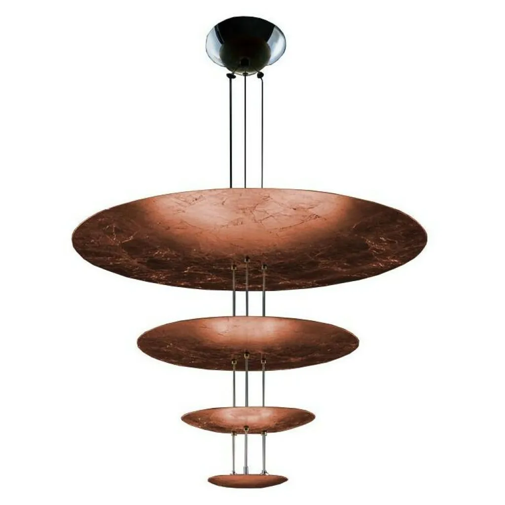 Die imposante Macchina Della Luce A LED Pendelleuchte zaubert ein stimmungsvolles Lichtambiente. Das charismatische und zugleich edle Design der Leuchte überzeugt mit zeitloser Eleganz. Das einzigartige Arrangement aus Licht und exquisiten Materialien erzeugt einen wunderbaren Raummittelpunkt. Die Pendelleuchte besteht aus mehreren leicht gewölbten Aluminiumscheiben. Diese sind in gleichmäßigen Abständen übereinander angeordnet. Die Elemente haben einen unterschiedlich großen Durchmesser und sind je nach Auswahl mit Gold-, Silber- oder Kupferblättchen beschichtet. Die größte Scheibe ist ganz oben. Nach unten hin werden die Elemente kleiner. Die unteren drei beinhalten LEDs. Das so nach oben gerichtete Licht sorgt für eine blendfreie, angenehme Raumausleuchtung. Dank des Dimmers kann die Lichtintensität selbst nach den eigenen Bedürfnissen eingestellt werden. Durch die Höhenverstellung ist es problemlos möglich, diese Leuchte den unterschiedlichen Deckenhöhen anzupassen und sie die Leuchte entweder dezent oder als Blickfang in den Raum zu integrieren. Der Durchmesser der Macchina Della Luce A LED Pendelleuchte beträgt 80 cm. Die Höhe misst 145 cm.