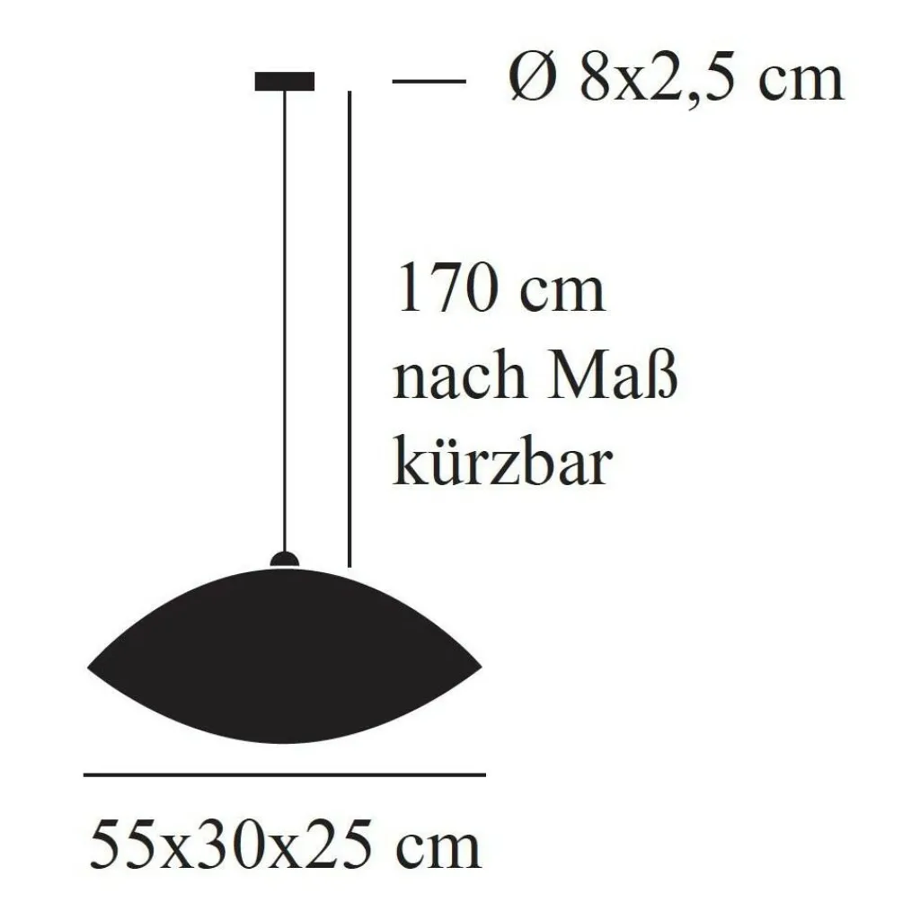 Die Malagola 55 Pendelleuchte wird mit einem Baldachin an der Decke befestigt. Er ist 2,5 cm hoch und hat einen Durchmesser von 8 cm. Zur Verbindung mit dem Stromkreis dient ein 170 cm langes Kabel, das man bei Bedarf kürzen kann. Der Schirm der Leuchte ist 55 cm lang und 30 cm breit. Die Höhe beträgt 25 cm. Man kann das Modell mit einem externen Dimmer kombinieren. Es braucht ein Leuchtmittel mit E27-Fassung.
