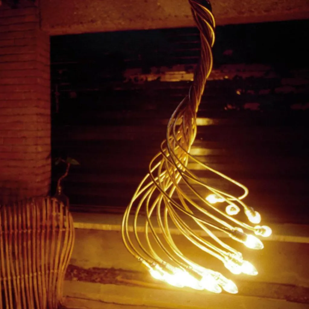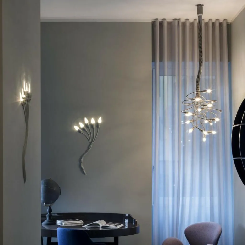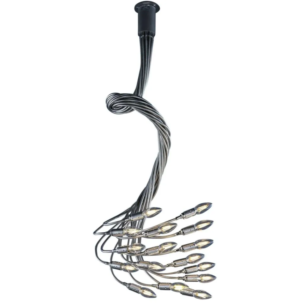 Für das Design der Turciù 16 Decken-/Pendelleuchte von Catellani & Smith dienen fließende Bewegungen der Natur als Inspirationsquelle. Die Deckenrosette besteht aus satiniertem Nickel. Die 9 Flexarme der Leuchte sind zunächst zu einem gemeinsamen Stamm verbunden. Schließlich münden sie in einzelne Leuchtmittel. Die Arme können aufgrund ihrer Flexeigenschaften auf kreative Weise gedreht und positioniert werden.