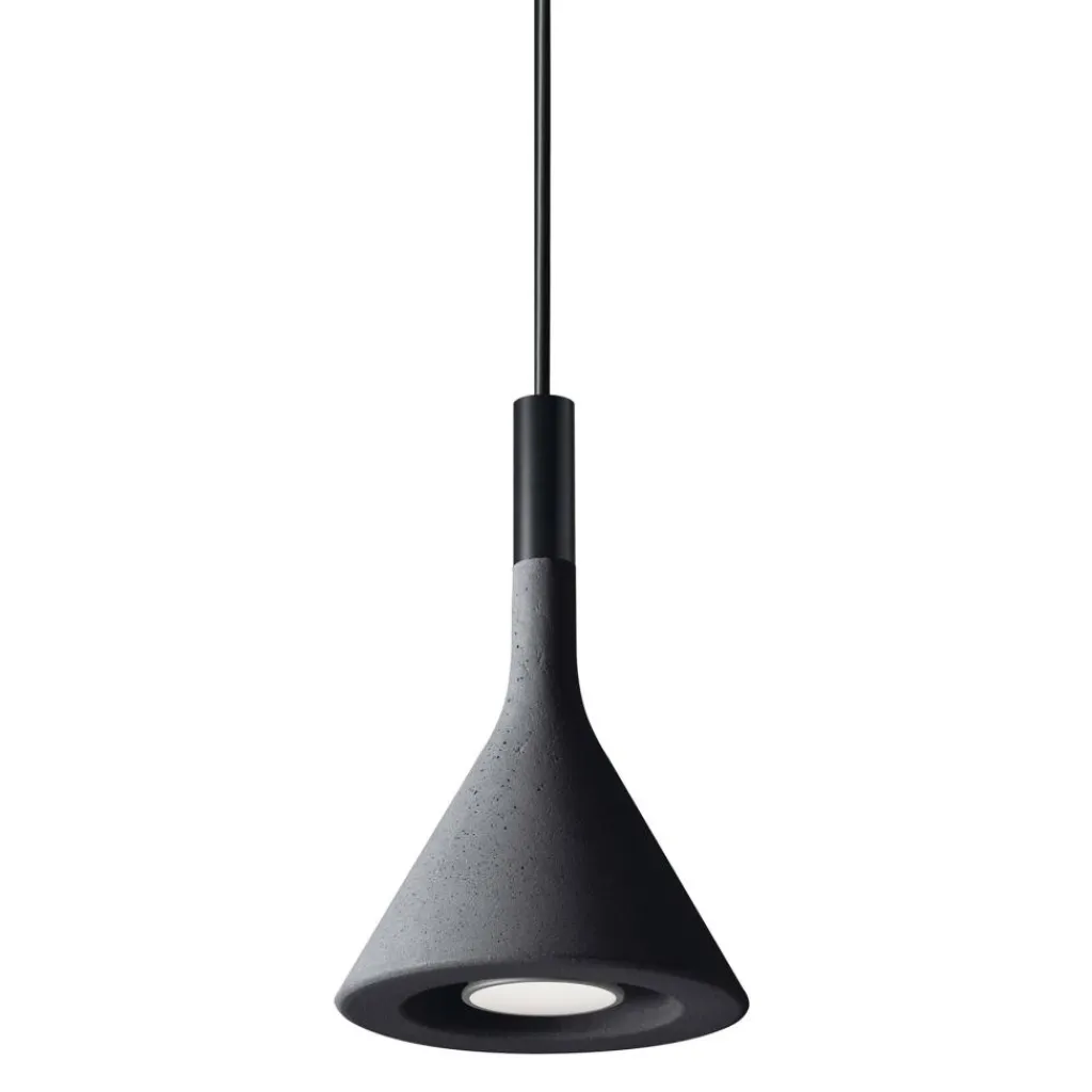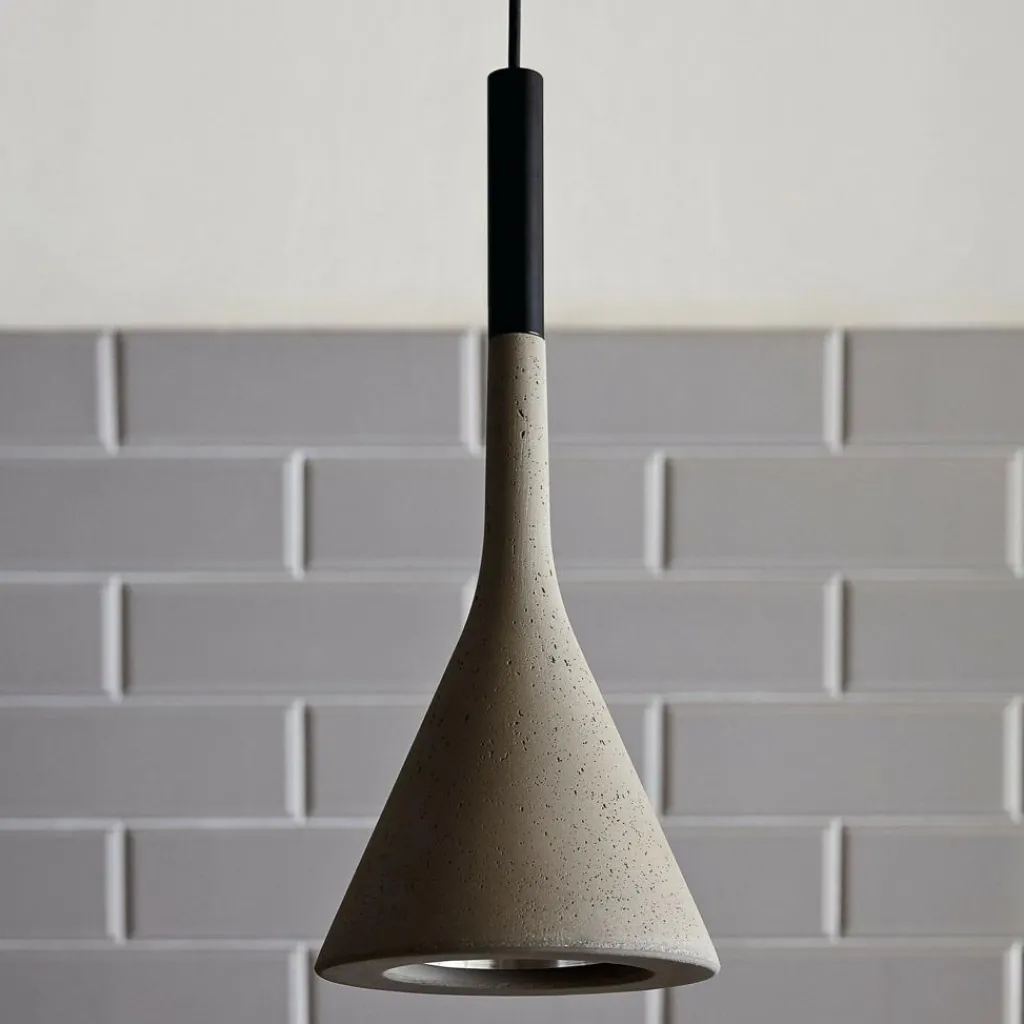 Die Idee für die Aplomb Mini Pendelleuchte entstand aus dem Wunsch des Designers, Beton als Werkstoff einzusetzen. Um dieses Vorhaben umzusetzen wurde zunächst an der richtigen Zusammensetzung des Materials gefeilt. Es entstand eine Mischung, die sich für die Verwendung in einer dünnen Gussform eignete. So war es möglich, den Leuchtenschirm der Aplomb Mini Pendelleuchte als schlanken Trichter zu gestalten. Er entsteht in liebevoller Handarbeit. An der Decke wird das Modell mit einer Deckenrosette aus Metall befestigt, die einen Durchmesser von 8 cm hat. Die Verkleidung besteht aus ABS-Kunststoff.
