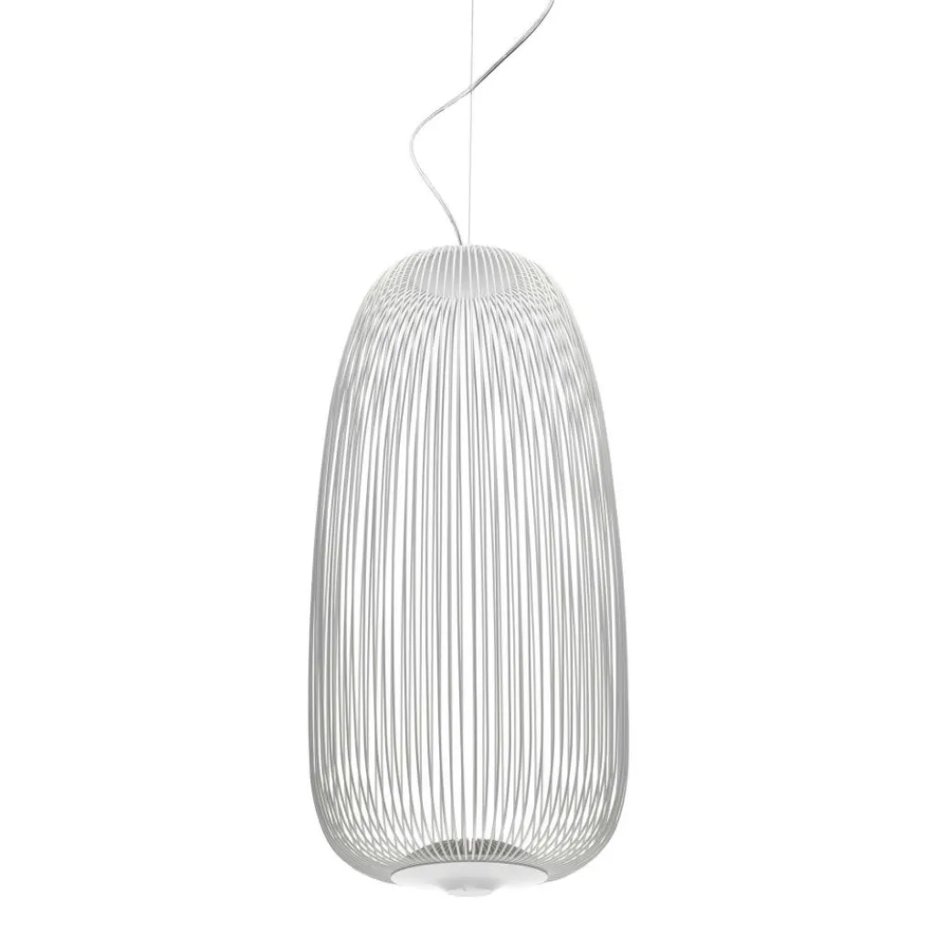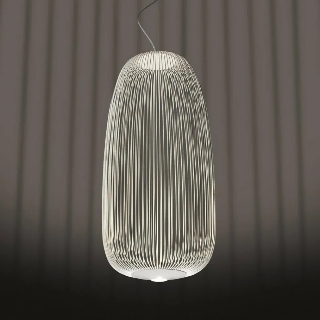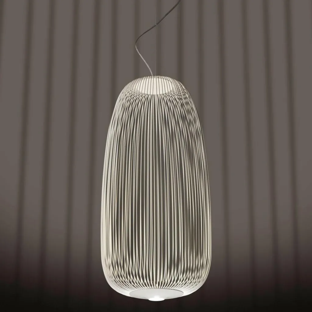Die Spokes 1 LED Pendelleuchte wurde vom spanisch-italienischen Design-Duo Garcia und Cumini für den Hersteller Foscarini entworfen. Die Gestaltung der Leuchte kann als markant bezeichnet werden, ihr Korpus ist an die Form von Fahrradspeichen angelehnt. Die dünnen, pulverbeschichteten Stahlrundrohre bilden ein sich wiederholendes Muster. Zwei kräftige LED-Module, im Boden der Leuchte angebracht, unterstreichen das Wechselspiel apart. Dabei führt ein Lichtstrahl nach oben und einer nach unten, mit dem Ergebnis, dass der Bereich unter der Lampe hell erleuchtet wird, diese allerdings auch von innen heraus prächtig strahlt und so ein bezauberndes Schatten- und Lichtspiel gebildet wird. Das Zusammenwirken von exzentrischem Lichtspiel und extravaganter Form lässt die Pendelleuchte in den Blickpunkt eines jeden Raumes rücken.