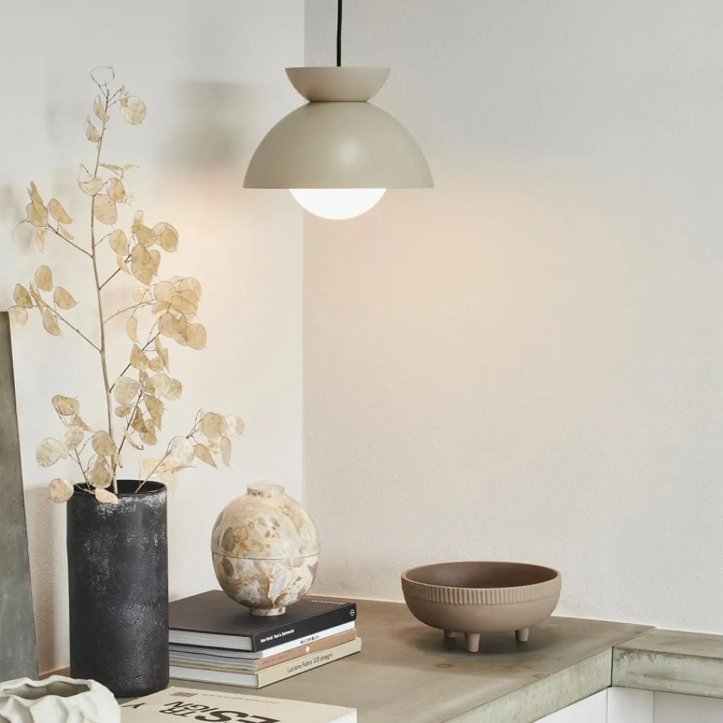 Die Butterfly Pendelleuchte Ø29cm wurde von Toni Rie für die Marke Frandsen entworfen. Sie erweitert die nach Schmetterlingen benannte Kollektion. Die Designerin hat den Namen gewählt, weil der Leuchtenschirm mit seiner taillierten Form an das liebliche Insekt erinnert. Er besteht aus zwei Halbkugeln, die sich an ihrer runden Seite treffen.