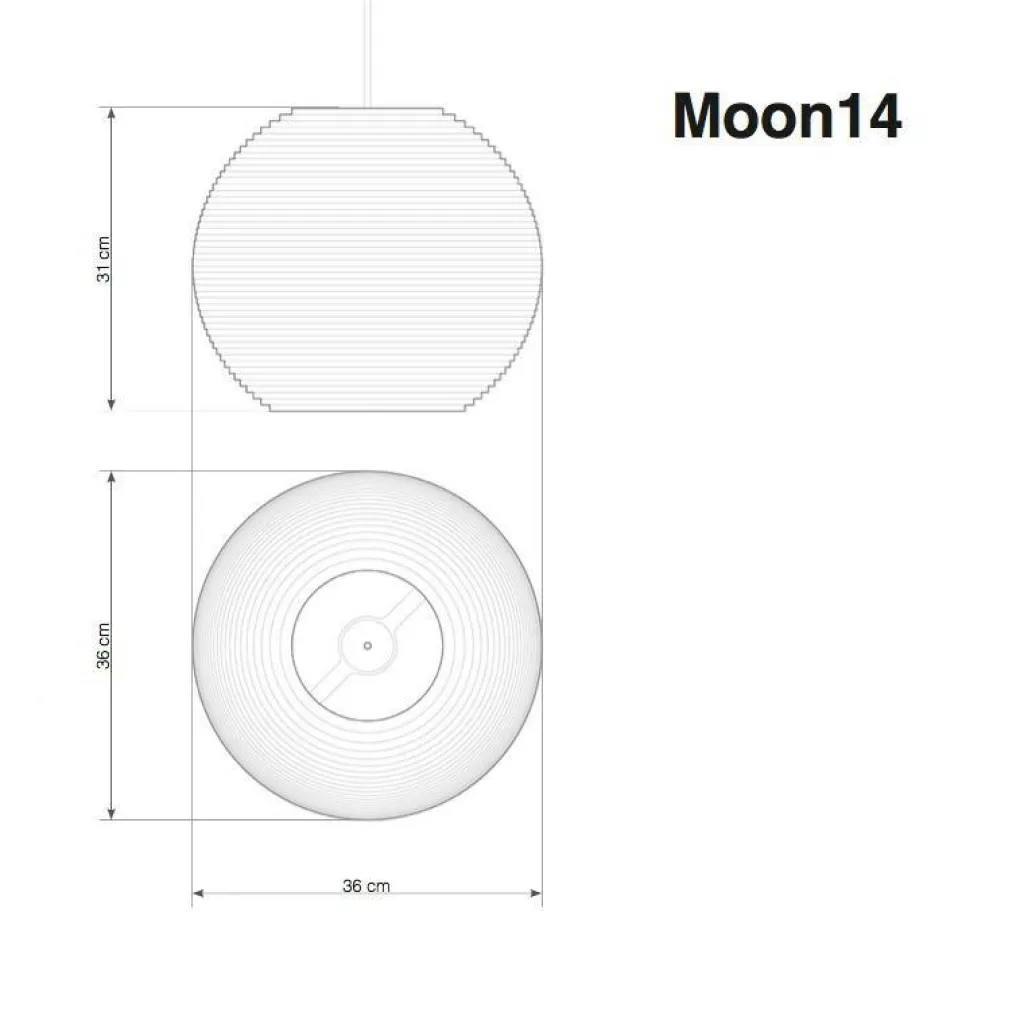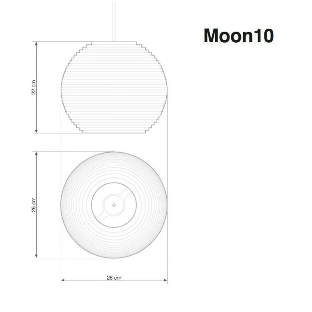 An einem pulverbeschichteten Baldachin wird die Moon Pendelleuchte an der Decke montiert. Ein 200 cm langes Kabel sorgt für die Stromversorgung. Das Modell ist in drei Varianten verfügbar: Die kleinste weist bei einer Höhe von 22 cm einen Durchmesser von 26 cm auf. Außerdem stehen ein 31 cm hohes Modell mit 36 cm Durchmesser und ein 40 cm hohes mit 45 cm Durchmesser zur Wahl. Die Leuchte benötigt ein Leuchtmittel mit einer E27-Fassung, das unter Zubehör mitbestellt werden kann.