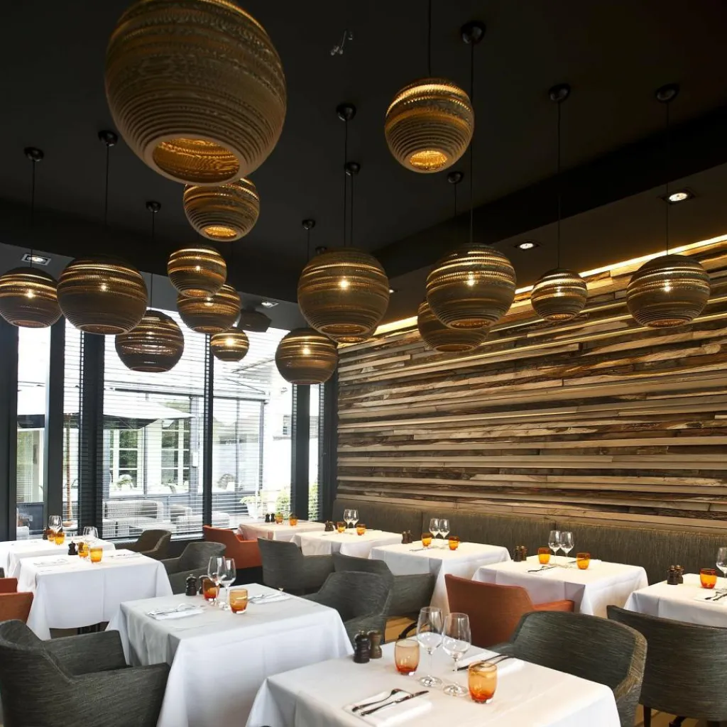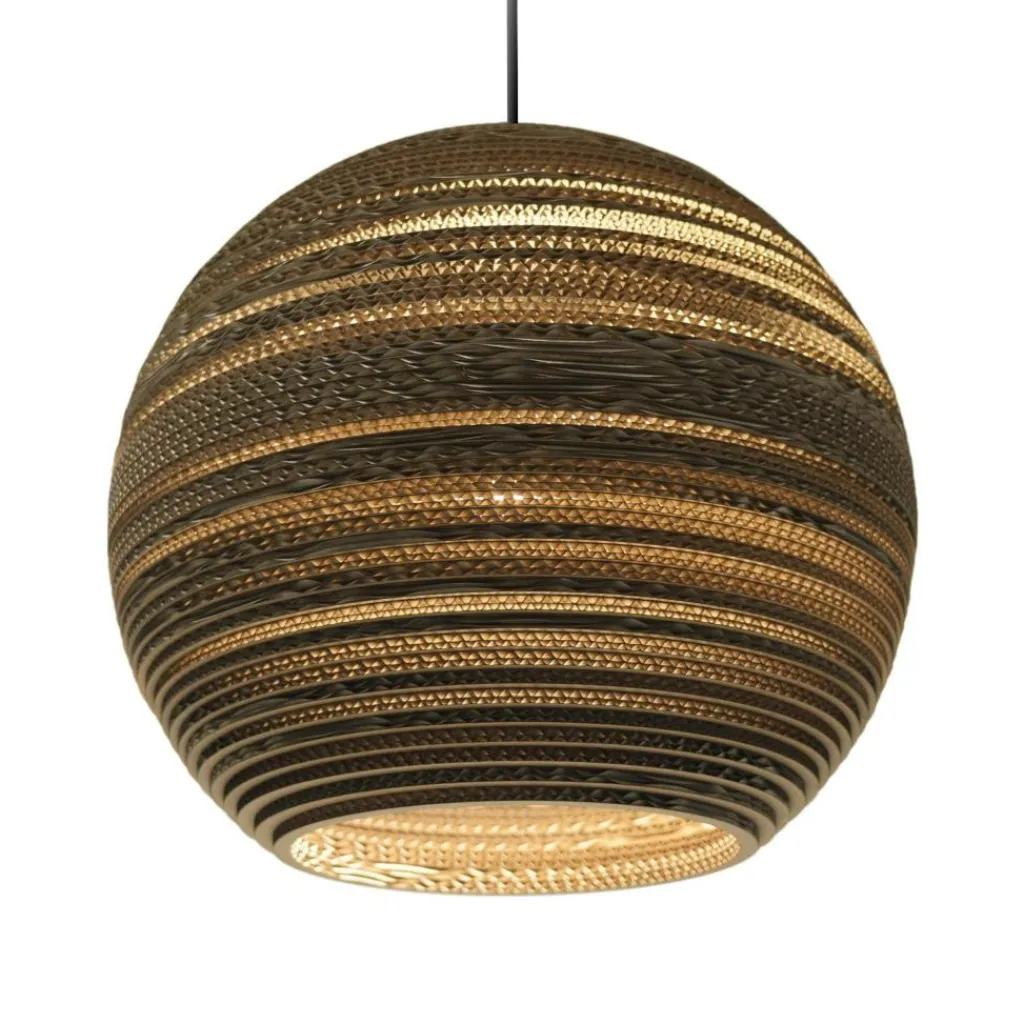 Für die Moon Pendelleuchte wird ausschließlich Papier verwendet, das mit dem FSC®-Siegel ausgezeichnet ist. Es attestiert die Herkunft aus Wäldern, wo mehr Bäume gepflanzt als gefällt werden. Die Leuchte ist Teil der außergewöhnlichen Scraplight-Serie, die ihren Namen wegen eines einzigartigen Verfahrens trägt: Die Bestandteile der Leuchte werden mit einem präzisen Laser vorgeschnitten. Im Anschluss daran wird in liebevoller Handarbeit eine Schicht nach der anderen mit einem umweltfreundlichen Kleber zusammengeführt. Eine Behandlung mit feuerhemmenden Stoffen macht das Modell sicher.