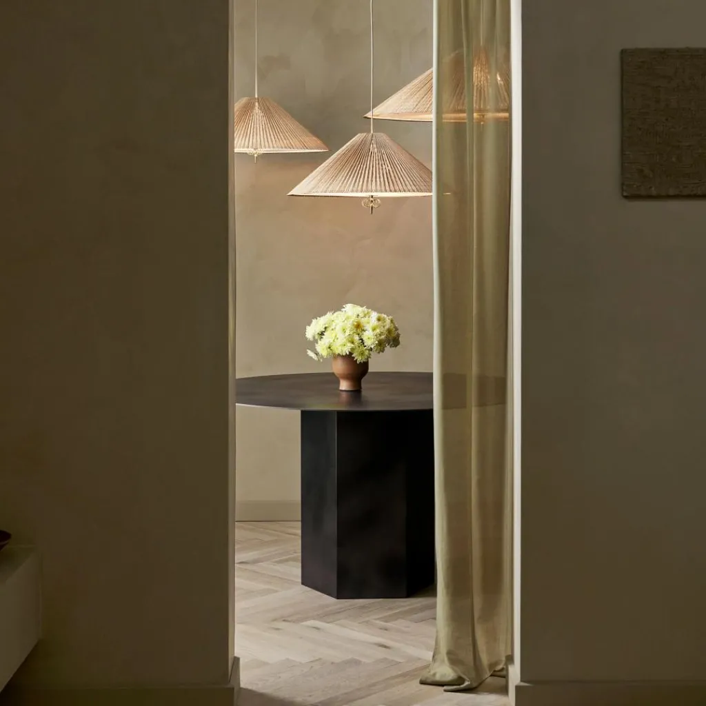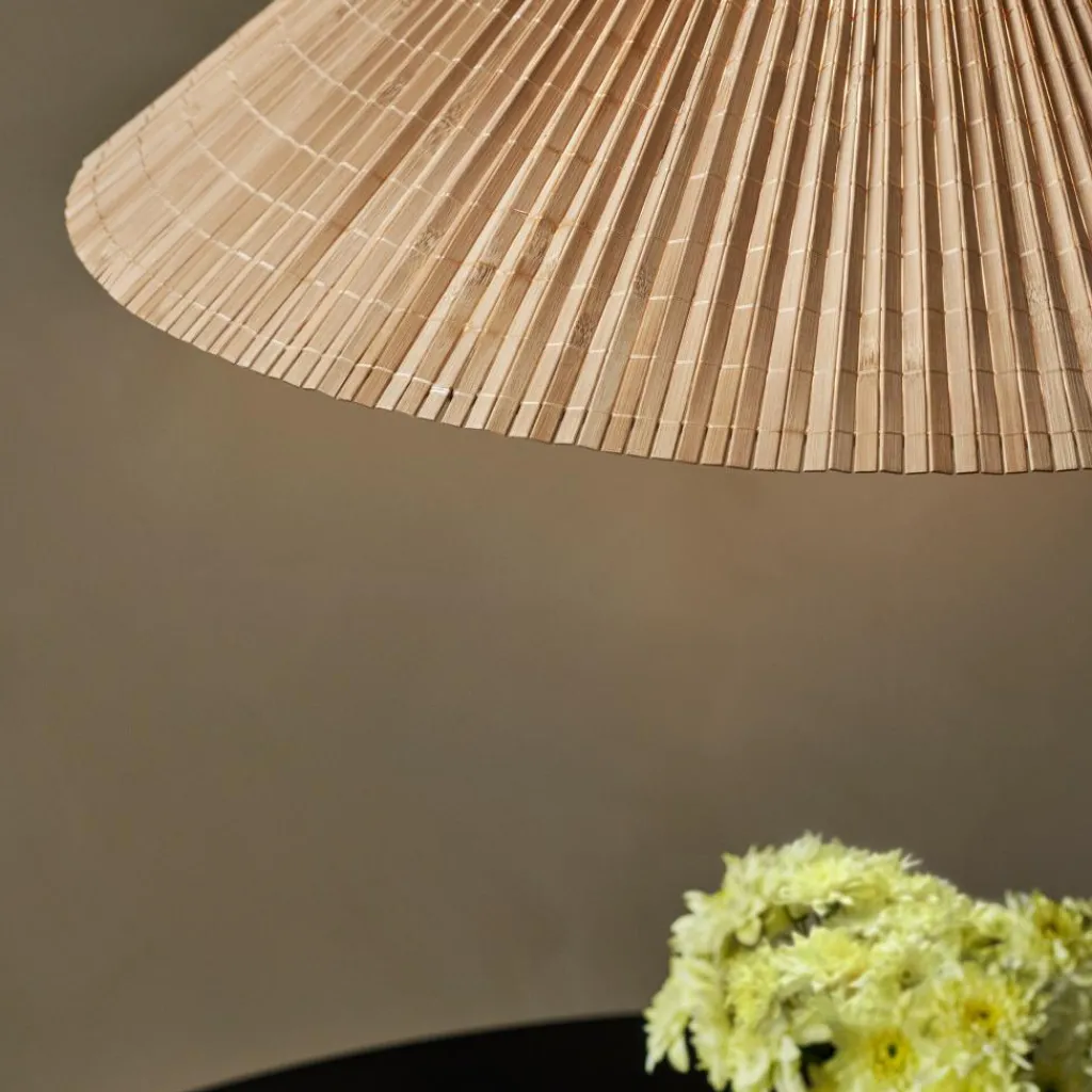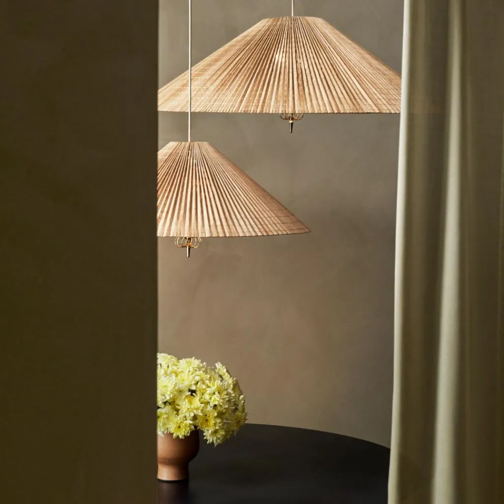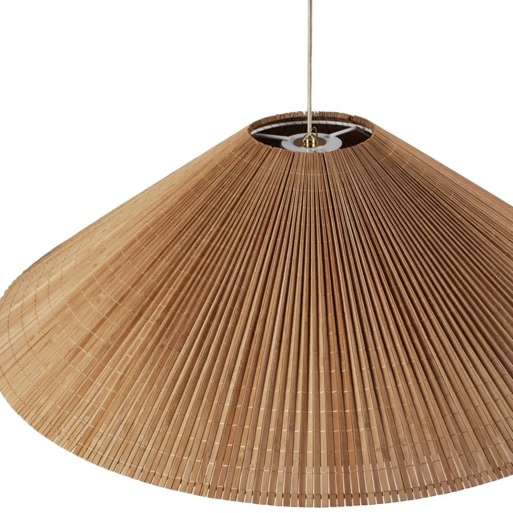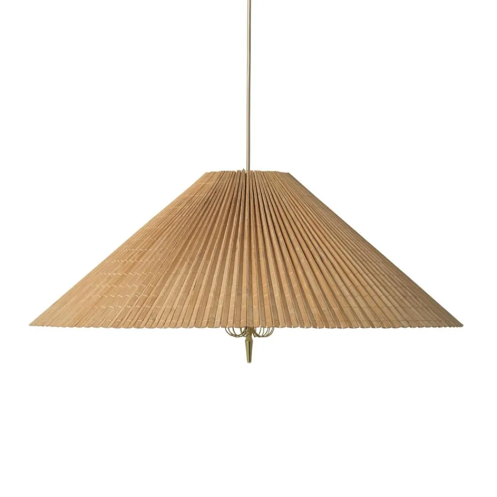 Für den Leuchtenschirm verwendet der finnische Designer Bambus. Er bringt die Latten in eine konische Form. Durch die Lamellen dringt Licht nach außen. Noch dazu werden die Lichtstrahlen direkt nach unten weitergeleitet. Die 1972 Pendelleuchte macht sich über dem Esstisch ganz hervorragend, wo sie für blendfreie Beleuchtung dank einer Diffusorscheibe sorgt. Einen verspielten Charakter erhält die 1972 Pendelleuchte durch die ringförmigen Ornamente aus Messing, die unter dem Leuchtenschirm befestigt sind. Für die Befestigung an der Decke wird eine Halterung angeschraubt. Ein Baldachin deckt diese ab.