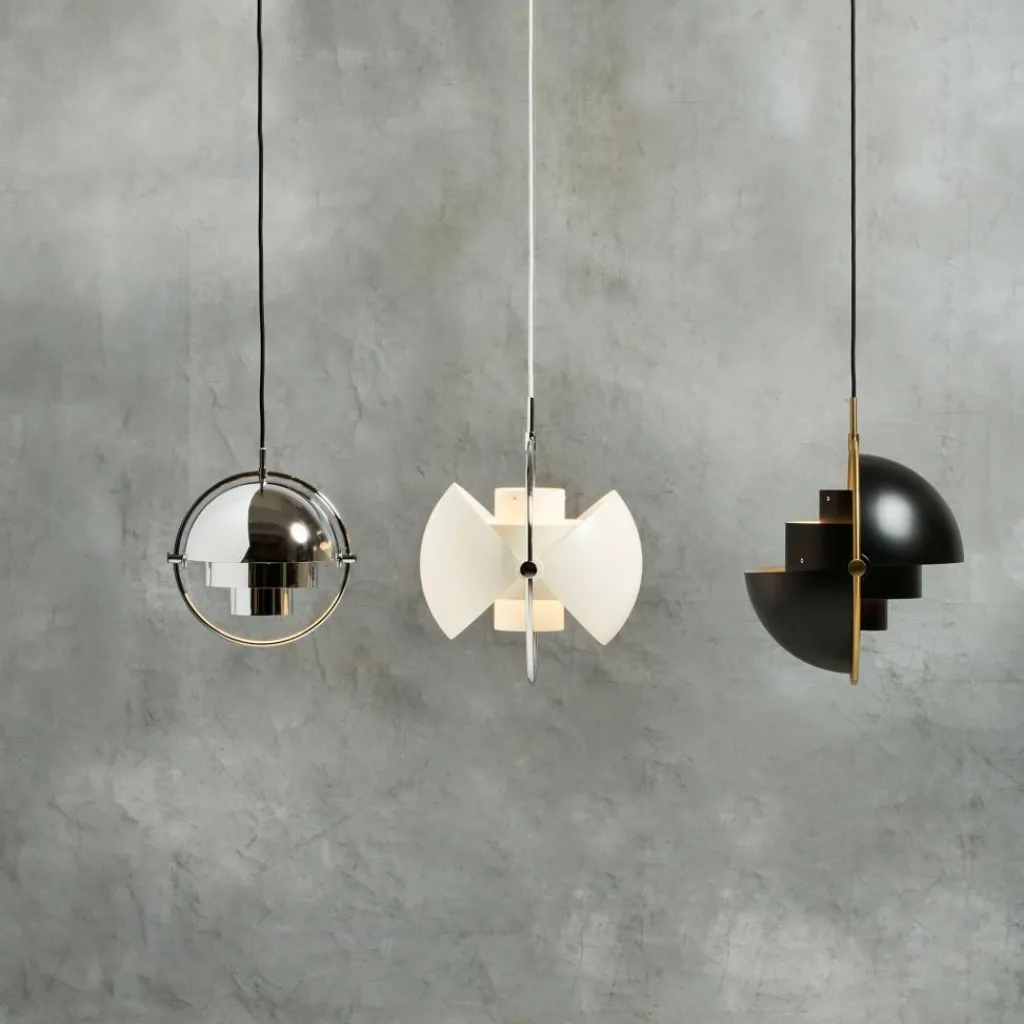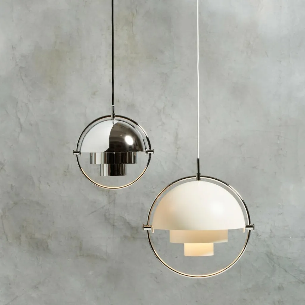 Multi-Lite Pendelleuchte Ø25,5cm Gestell Chromwurde vom Designer Louis Weisdorf für die Marke Gubi entworfen. Die Leuchte mit dem geringen Durchmesser und ihren aus zwei ineinander steckenden, von einem Ring umgebenen, zylinderförmigen Röhren und einer Kuppel bestehenden Schirm sieht futuristisch aus, wobei die beiden obersten Hälften der Kuppel auseinander geklappt werden können. Dadurch kann das Licht ebenfalls an die Decke geworfen werden.