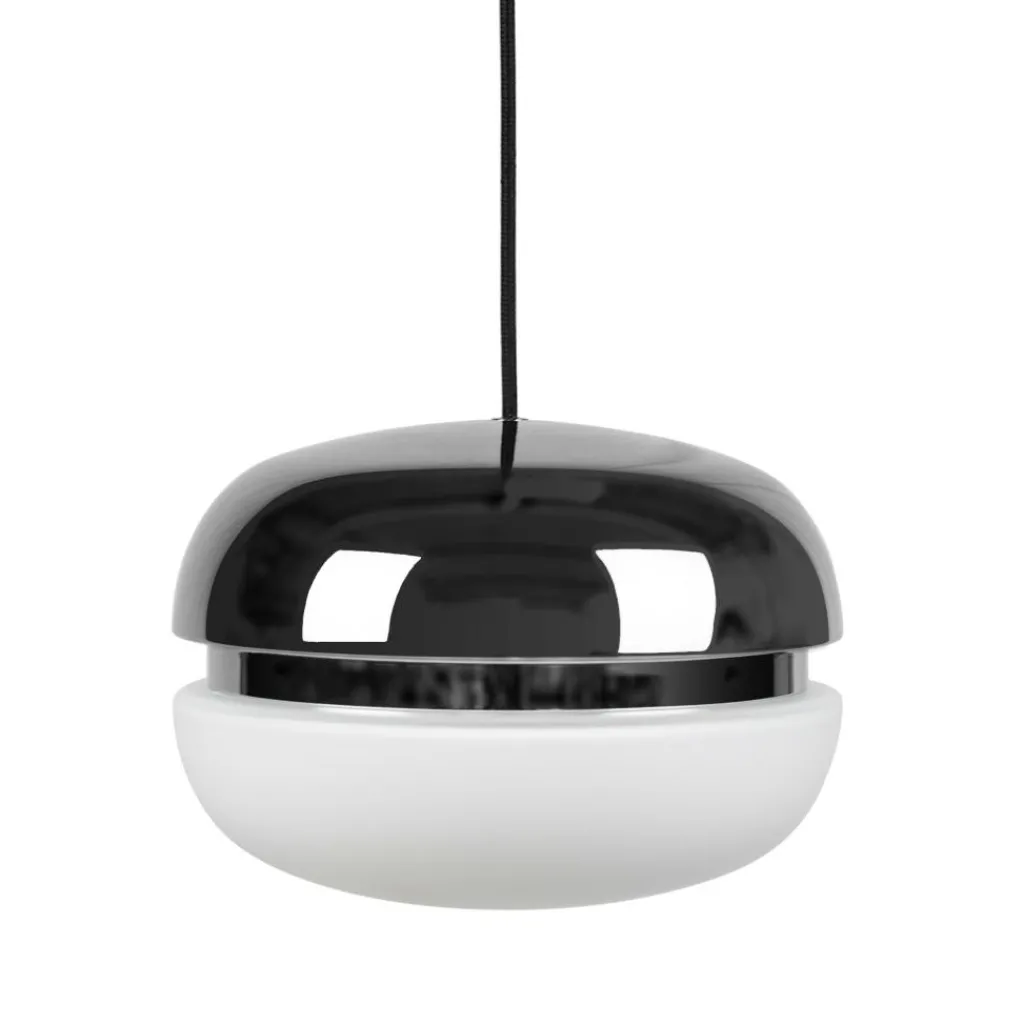 Schon beim ersten Blick auf die Macaron Pendelleuchte Ø 18cm werden Assoziationen mit dem französischen Süßgebäck wach, die dem Modell seinen Namen geben. Ähnlich wie das Baisergebäck mit Füllung besteht auch die Leuchte aus zwei Halbschalen, die aufeinandertreffen. Zur Mitte hin verjüngen sich die beiden Elemente und deuten damit die Füllung der Süßigkeit an. Wie beim Gebäck stehen bei der Macaron Pendelleuchte Ø 18cm verschiedene Farben zur Auswahl. Jedes Modell ist zweifarbig: Die untere Halbschale ist aus opalem Glas gefertigt und dient als Diffusor. Das Licht dringt daraus nach unten und seitlich aus. Das obere Leuchtenelement besteht aus Stahl. Die Oberfläche ist wahlweise matt lackiert oder verchromt. In der Verchromung spiegeln sich die Umgebung und das Licht.