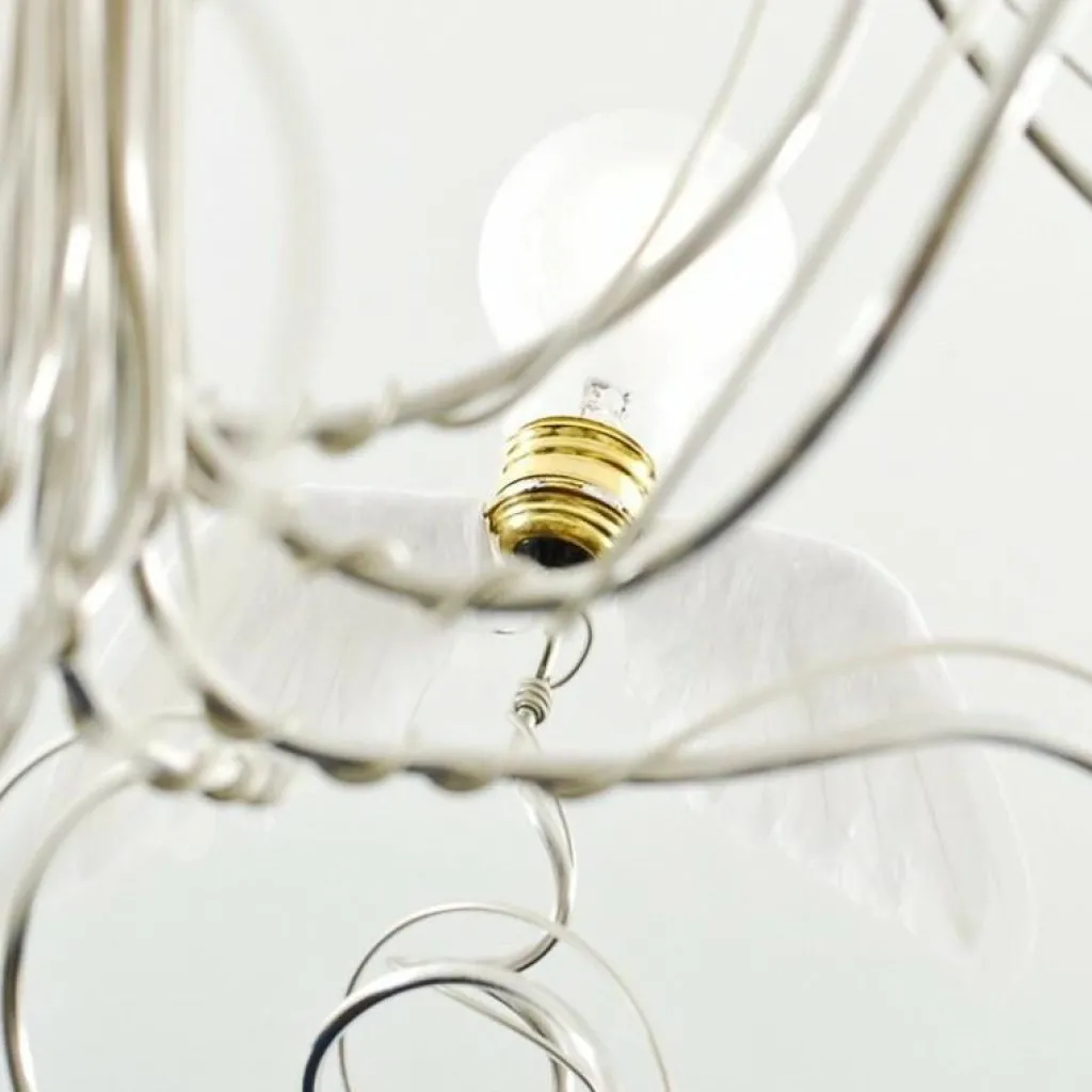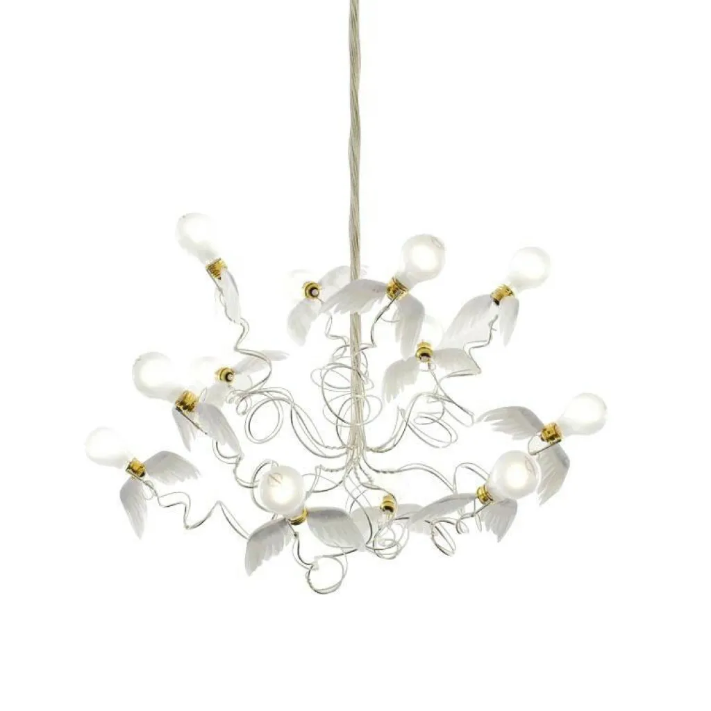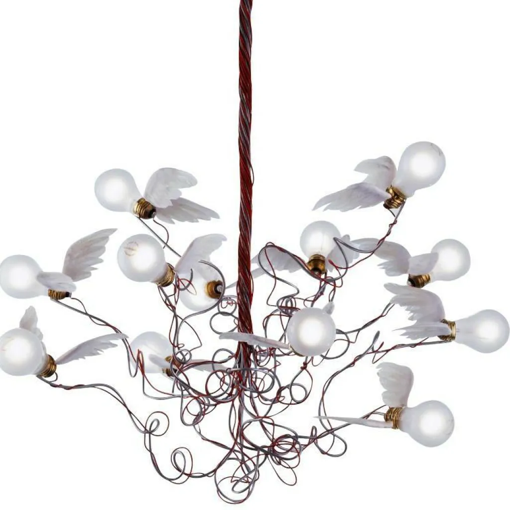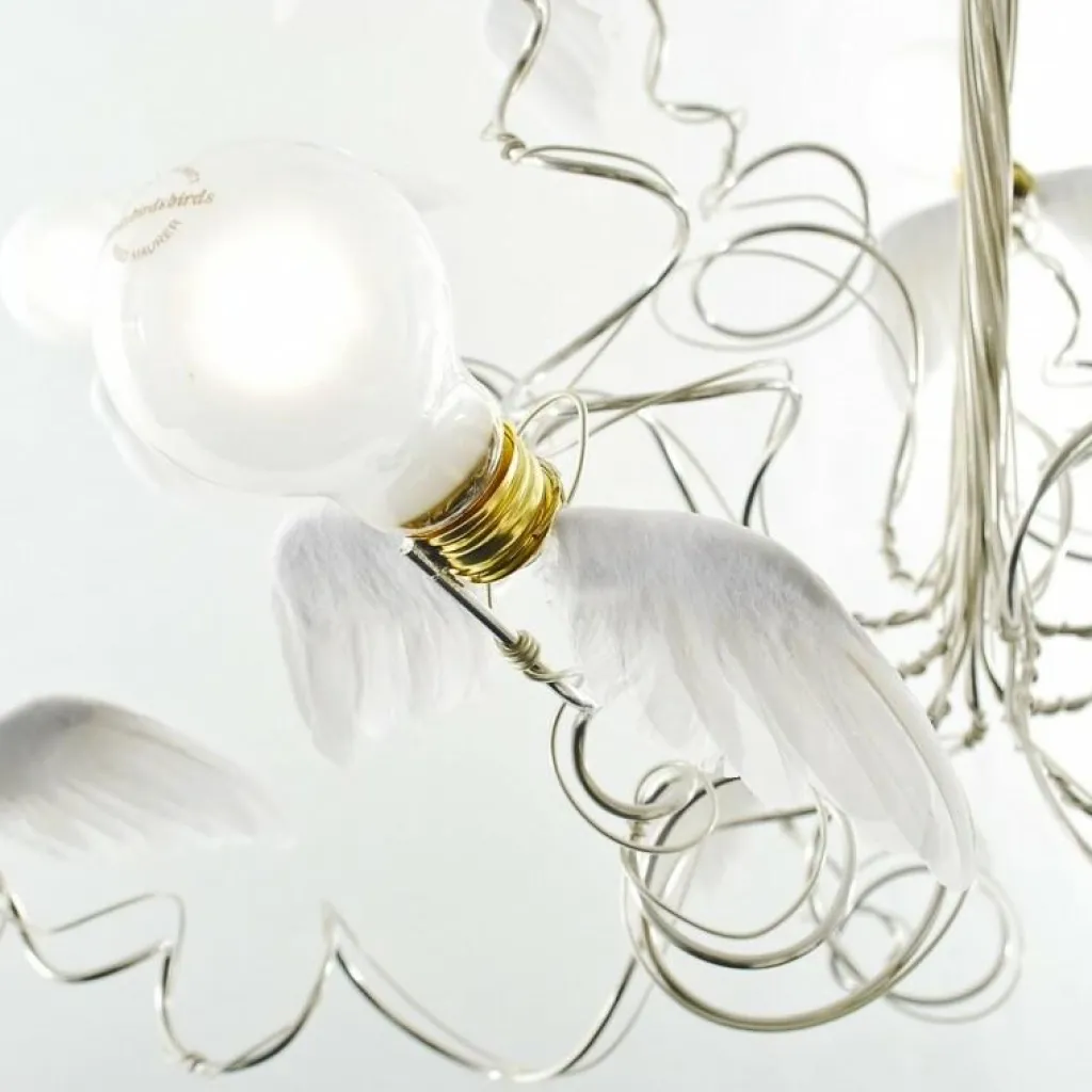 Wie ein Schwarm Vögel sieht die Birdie Pendelleuchte aus. Sie ist so gestaltet, als würden sich die kleinen Vögel erschrecken und in alle Richtungen davonfliegen. Zum Blickfang werden die zwölf Leuchtmittel, die exklusiv für die Marke hergestellt werden. Sie schmücken Flügel mit echten Gänsefedern. Die Leuchtmittel strahlen warmweißes Licht in alle Richtungen aus; Vogelschatten erscheinen an den Wänden. Sie haben eine E27-Fassung und sind auf einem Gestell aus verzinntem Metall befestigt. Die Birdie Pendelleuchte wird mit zwei Ersatzleuchtmitteln geliefert. Für die Deckenbefestigung der Birdie Pendelleuchte dient ein Baldachin. In diesem befinden sich drei Transformatoren. Man kann die Leuchte mit transparentem oder rotem Kabel bestellen.